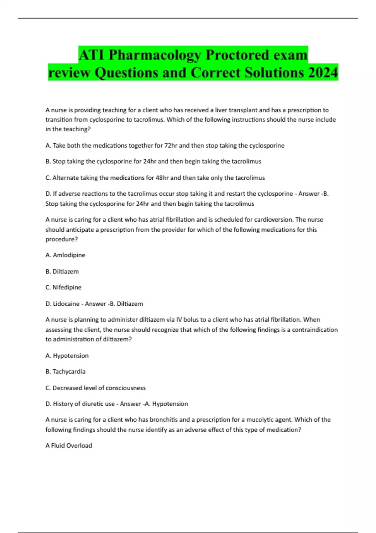 ATI Pharmacology Proctored exam review Questions and Correct Solutions 2024 A nurse is providing teaching for a client who has received a liver transplant and has a prescription to transition from cyclosporine to tacrolimus. Which of the following instructions should the nurse include in the teaching? A. Take both the medications together for 72hr and then stop taking the cyclosporine B. Stop taking the cyclosporine for 24hr and then begin taking the tacrolimus C. Alternate taking the medications for 48hr and then take only the tacrolimus D. If adverse reactions to the tacrolimus occur stop taking it and restart the cyclosporine - Answer -B. Stop taking the cyclosporine for 24hr and then begin taking the tacrolimus A nurse is caring for a client who has atrial fibrillation and is scheduled for cardioversion. The nurse should anticipate a prescription from the provider for which of the following medications for this procedure? A. Amlodipine B. Diltiazem C. Nifedipine D. Lidocaine - Answer -B. Diltiazem A nurse is planning to administer diltiazem via IV bolus to a client who has atrial fibrillation. When assessing the client, the nurse should recognize that which of the following findings is a contraindication to administration of diltiazem? A. Hypotension B. Tachycardia C. Decreased level of consciousness D. History of diuretic use - Answer -A. Hypotension A nurse is caring for a client who has bronchitis and a prescription for a mucolytic agent. Which of the following findings should the nurse identify as an adverse effect of this type of medication? A Fluid OverloadB. Bronchospasm C. Electrolyte imbalance D. Tachycardia - Answer -B. Bronchospasm