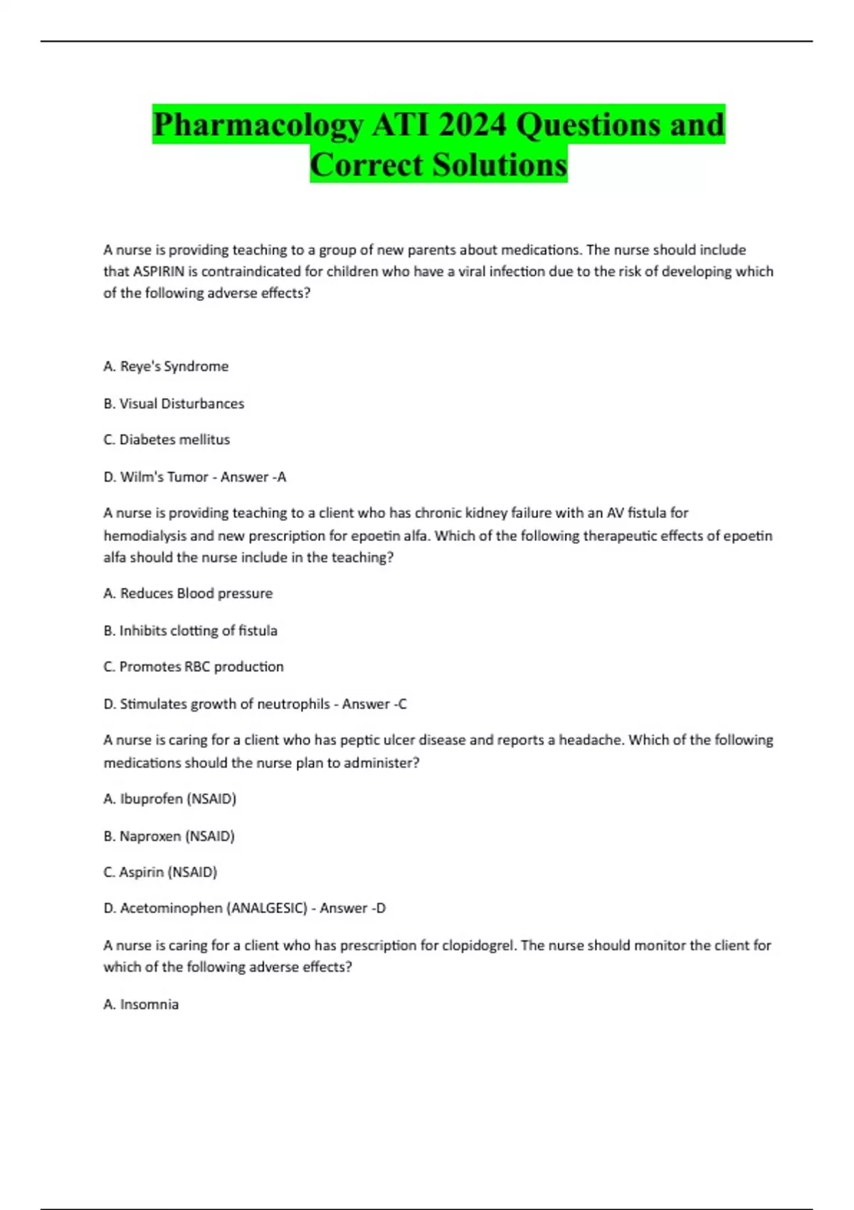 Pharmacology ATI 2024 Questions and Correct Solutions A nurse is providing teaching to a group of new parents about medications. The nurse should include that ASPIRIN is contraindicated for children who have a viral infection due to the risk of developing which of the following adverse effects? A. Reye's Syndrome B. Visual Disturbances C. Diabetes mellitus D. Wilm's Tumor - Answer -A A nurse is providing teaching to a client who has chronic kidney failure with an AV fistula for hemodialysis and new prescription for epoetin alfa. Which of the following therapeutic effects of epoetin alfa should the nurse include in the teaching? A. Reduces Blood pressure B. Inhibits clotting of fistula C. Promotes RBC production D. Stimulates growth of neutrophils - Answer -C A nurse is caring for a client who has peptic ulcer disease and reports a headache. Which of the following medications should the nurse plan to administer? A. Ibuprofen (NSAID) B. Naproxen (NSAID) C. Aspirin (NSAID) D. Acetominophen (ANALGESIC) - Answer -D A nurse is caring for a client who has prescription for clopidogrel. The nurse should monitor the client for which of the following adverse effects? A. InsomniaB. Hypotension C. Bleeding D. Constipation - Answer -C A nurse is teaching a newly licensed nurse about contraindications to ceftriaxone. The nurse should include a severe allergy to which of the following medications as contraindication to ceftriaxone? A. Gentamicin B. Clindamycin C. Piperacillin D. Sulfamethoxazole- Trimethroprim - Answer -C A nurse is providing teaching to a newly licensed nurse about metoclopramide. The nurse should include in the teaching that which of the following conditions is a contraindication to this medication? A. Hyperthyroidism B. Intestinal obstruction C. Glaucoma D. Low blood pressure - Answer -B A nurse is assessing a client who has a new prescription for chlorpromazine to treat schizophrenia. The client has. mask like facial expression and is experiencing involuntary movements and tremors. Which of the following medications should the nurse anticipate administering? A. Amantadine
