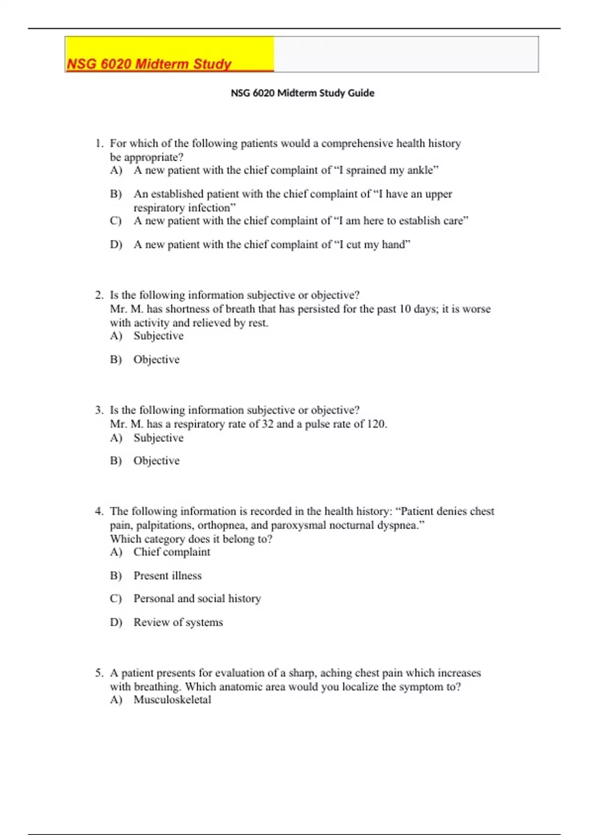 1. For which of the following patients would a comprehensive health history be appropriate? A) A new patient with the chief complaint of “I sprained my ankle” B) An established patient with the chief complaint of “I have an upper respiratory infection” C) A new patient with the chief complaint of “I am here to establish care” D) A new patient with the chief complaint of “I cut my hand” 2. Is the following information subjective or objective? Mr. M. has shortness of breath that has persisted for the past 10 days; it is worse with activity and relieved by rest. A) Subjective B) Objective 3. Is the following information subjective or objective? Mr. M. has a respiratory rate of 32 and a pulse rate of 120. A) Subjective B) Objective 4. The following information is recorded in the health history: “Patient denies chest pain, palpitations, orthopnea, and paroxysmal nocturnal dyspnea.” Which category does it belong to? A) Chief complaint B) Present illness C) Personal and social history D) Review of systems 5. A patient presents for evaluation of a sharp, aching chest pain which increases with breathing. Which anatomic area would you localize the symptom to? A) Musculoskeletal B) Reproductive C) Urinary D) Endocrine 6. A 22-year-old advertising copywriter presents for evaluation of joint pain. The pain is new, located in the wrists and fingers bilaterally, with some subjective fever. The patient denies a rash; she also denies recent travel or camping activities. She has a family history significant for rheumatoid arthritis. Based on this information, which of the following pathologic processes would be the most correct? A) Infectious B) Inflammatory C) Hematologic D) Traumatic 7. A 15-year-old high school sophomore comes to the clinic for evaluation of a 3-week history of sneezing; itchy, watery eyes; clear nasal discharge; ear pain; and nonproductive cough. Which is the most likely pathologic process? A) Infection B) Inflammation C) Allergic D) Vascular 8. You are seeing an elderly man with multiple complaints. He has chronic arthritis, pain from an old war injury, and headaches. Today he complains of these pains, as well as dull chest pain under his sternum. What would the order of priority be for your problem list? A) Arthritis, war injury pain, headaches, chest pain B) War injury pain, arthritis, headaches, chest pain C) Headaches, arthritis, war injury pain, chest pain D) Chest pain, headaches, arthritis, war injury pain 9. Suzanne, a 25 year old, comes to your clinic to establish care. You are the student preparing to go into the examination room to interview her. Which of the following is the most logical sequence for the patient–provider interview? A) Establish the agenda, negotiate a plan, establish rapport, and invite the patient's story. B) Invite the patient's story, negotiate a plan, establish the agenda, and establish rapport. C) Greet the patient, establish rapport, invite the patient's story, establish the agenda, expand and clarify the patient's story, and negotiate a plan. D) Negotiate a plan, establish an agenda, invite the patient's story, and establish rapport. 10. Alexandra is a 28-year-old editor who presents to the clinic with abdominal pain. The pain is a dull ache, located in the right upper quadrant, that she rates as a 3 at the least and an 8 at the worst. The pain started a few weeks ago, it lasts for 2 to 3 hours at a time, it comes and goes, and it seems to be worse a couple of hours after eating. She has noticed that it starts after eating greasy foods, so she has cut down on these as much as she can. Initially it occurred once a week, but now it is occurring every other day. Nothing makes it better. From this description, which of the seven attributes of a symptom has been omitted? A) Setting in which the symptom occurs B) Associated manifestations C) Quality D) Timing