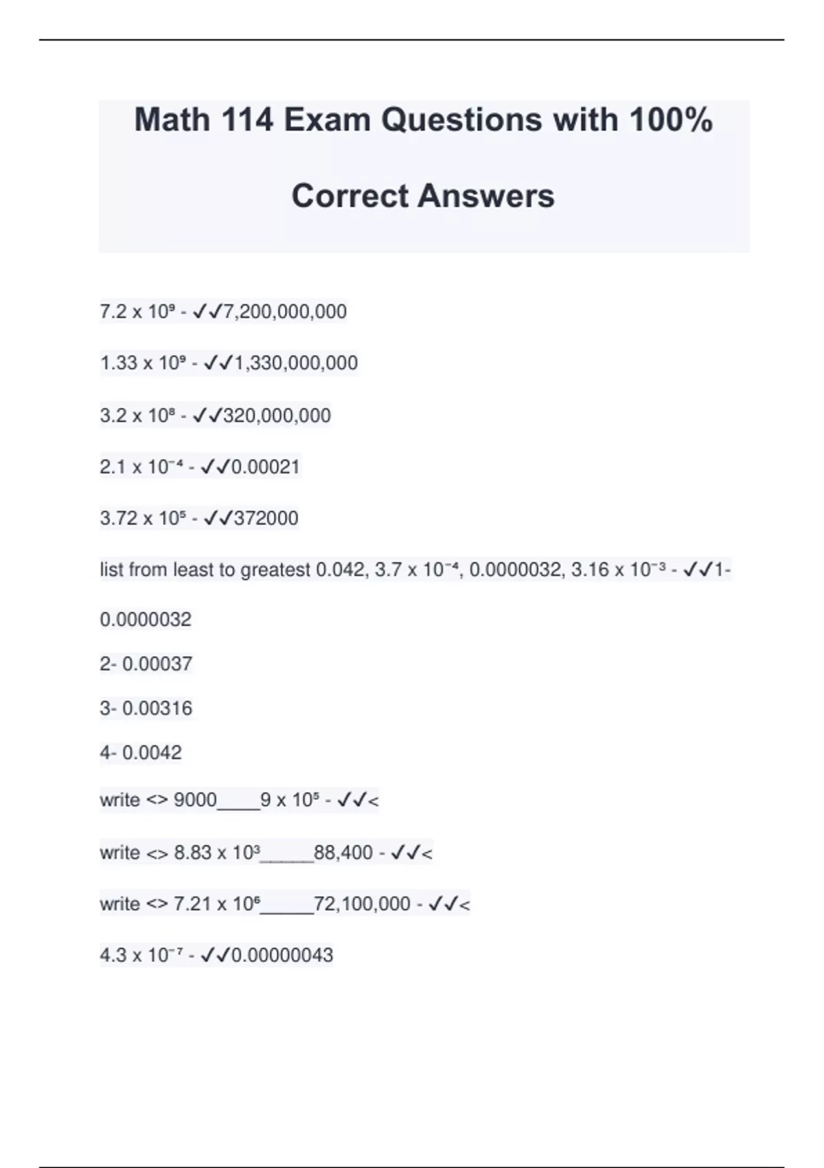 Math 114 Exam Questions with 100% Correct Answers 7.2 x 10⁹ - 7,200,000,000 1.33 x 10⁹ - 1,330,000,000 3.2 x 10⁸ - 320,000,000 2.1 x 10⁻⁴ - 0.00021 3.72 x 10⁵ - 372000 list from least to greatest 0.042, 3.7 x 10⁻⁴, 0.0000032, 3.16 x 10⁻³ - 1- 0.0000032 2- 0.00037 3- 0.00316 4- 0.0042 write <> 9000____9 x 10⁵ - < write <> 8.83 x 10³_____88,400 - < write <> 7.21 x 10⁶_____72,100,000 - < 4.3 x 10⁻⁷ - 0.