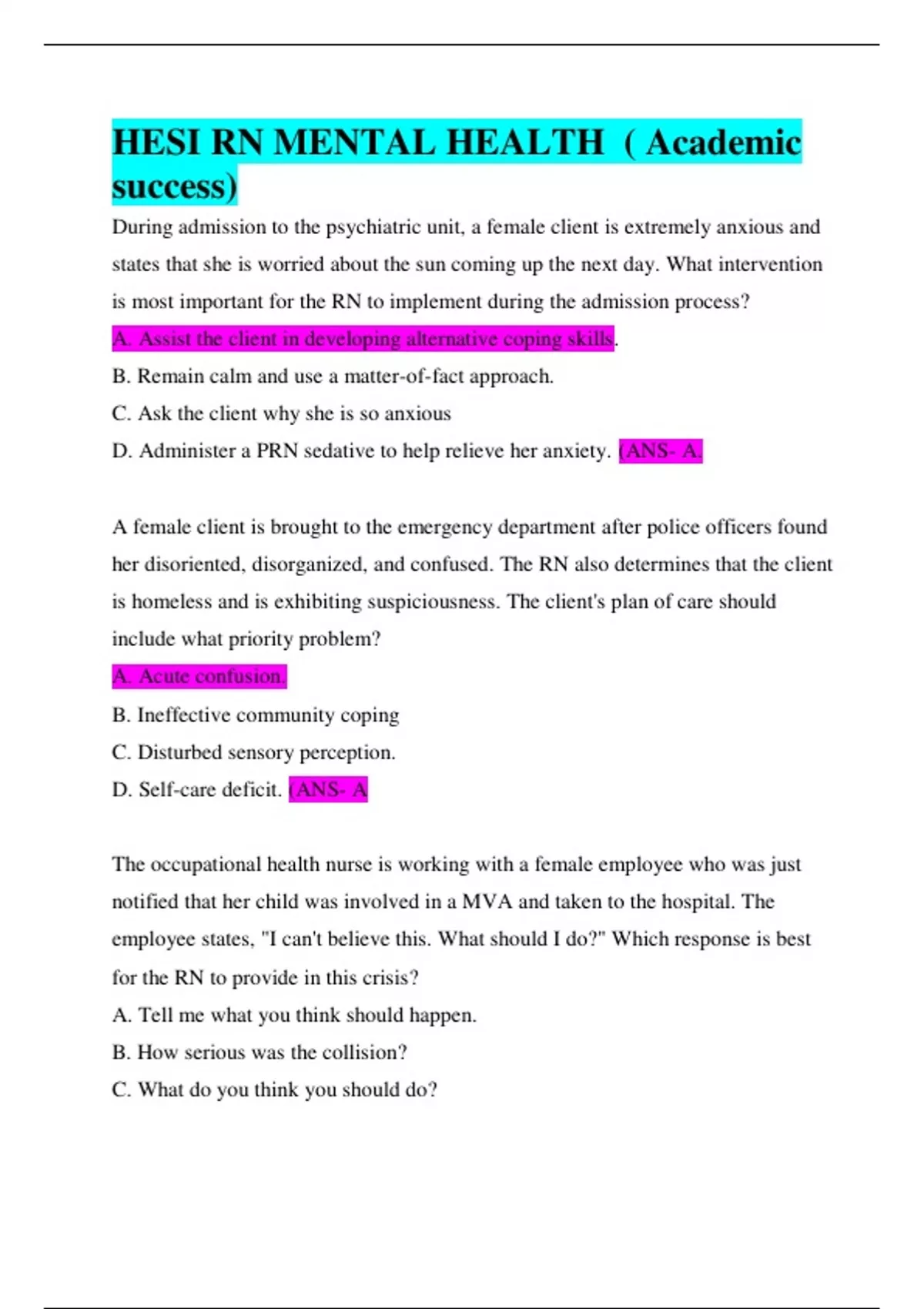 During admission to the psychiatric unit, a female client is extremely anxious and states that she is worried about the sun coming up the next day. What intervention is most important for the RN to implement during the admission process? A. Assist the client in developing alternative coping skills. B. Remain calm and use a matter-of-fact approach. C. Ask the client why she is so anxious D. Administer a PRN sedative to help relieve her anxiety. (ANS- A. A female client is brought to the emergency department after police officers found her disoriented, disorganized, and confused. The RN also determines that the client is homeless and is exhibiting suspiciousness. The client's plan of care should include what priority problem? A. Acute confusion. B. Ineffective community coping C. Disturbed sensory perception. D. Self-care deficit. (ANS- A The occupational health nurse is working with a female employee who was just notified that her child was involved in a MVA and taken to the hospital. The employee states, "I can't believe this. What should I do?" Which response is best for the RN to provide in this crisis? A. Tell me what you think should happen. B. How serious was the collision? C. What do you think you should do? D. Call for transportation to the hospital. (ANS- D A client tells the RN that he has an IQ of 400+ and is a genius and an inventor. He also reports that he is married to a female movie star and thinks that his brother wants a sexual relationship with her. What is the priority nursing problem for admission to the psychiatric unit? A. Ineffective sexual patterns. B. Impaired environmental interpretation. C. Disturbed sensory perception. D. Compromised family coping. (ANS- A The RN is providing care for a client diagnosed with borderline personality disorder who has self-inflicted lacerations on the abdomen. Which approach should the RN use when changing this client's dressing? A. Provide detailed thorough explanations when cleansing wound. B. Perform the dressing change in a non-judgmental manner. C. Ask in a non-threatening manner why the client cut own abdomen. D. Request another staff member assist with the dressing change. (ANS- B While sitting in the day room of the mental health unit, a male adolescent avoids eye contact, looks at the floor, and talks softly when interacting verbally with the RN. The two trade places, and the RN demonstrates the client's behaviors. What is the main goal of this therapeutic technique? A. Initiate a non-threatening conversation with the client. B. Dialog about the ineffectiveness of his interactions. C. Allow the client to identify the way he interacts. D. Discuss the client's feelings when he responds. (ANS- C An antidepressant medication is prescribed for a client who reports sleeping only 4 hours in the past 2 days and weight loss of 9 lbs within the last month. Which client goal is most important to achieve within the first three days of treatment? A. Meet scheduled appointment with dietitian. B. Sleep at least 6 hours a night. C. Understands the purpose of the medication regimen. D. Describes the reasons for hospitalization. (ANS- B When preparing to administer to domestic violence screening tool to a female client, which statement should the RN provide? A. If your partner is abusing you, I need to ask these questions. B. State law mandates that I ask if you are a victim of domestic violence. C. The HCP provider needs to know if you are experiencing any domestic abuse. D. All clients are screened for domestic abuse because it is common in our society. (ANS- D A young adult female visits the mental health clinic complaining of diarrhea, headache, and muscle aches. She is afebrile, denies chills, and all laboratory findings are within normal limits. During the physical assessment, the client tells the RN that her sister thinks she is neurotic and calls her a hypochondriac. Which response is best for the RN to provide? A. Unless your sister has a medical education, ignore her comments. B. I can hear that your sister comments are over-whelming you. C. Do you think it's possible that you might be a hypochondriac? D. Besides your sister's comments, what in your life is troubling you? (ANS- D