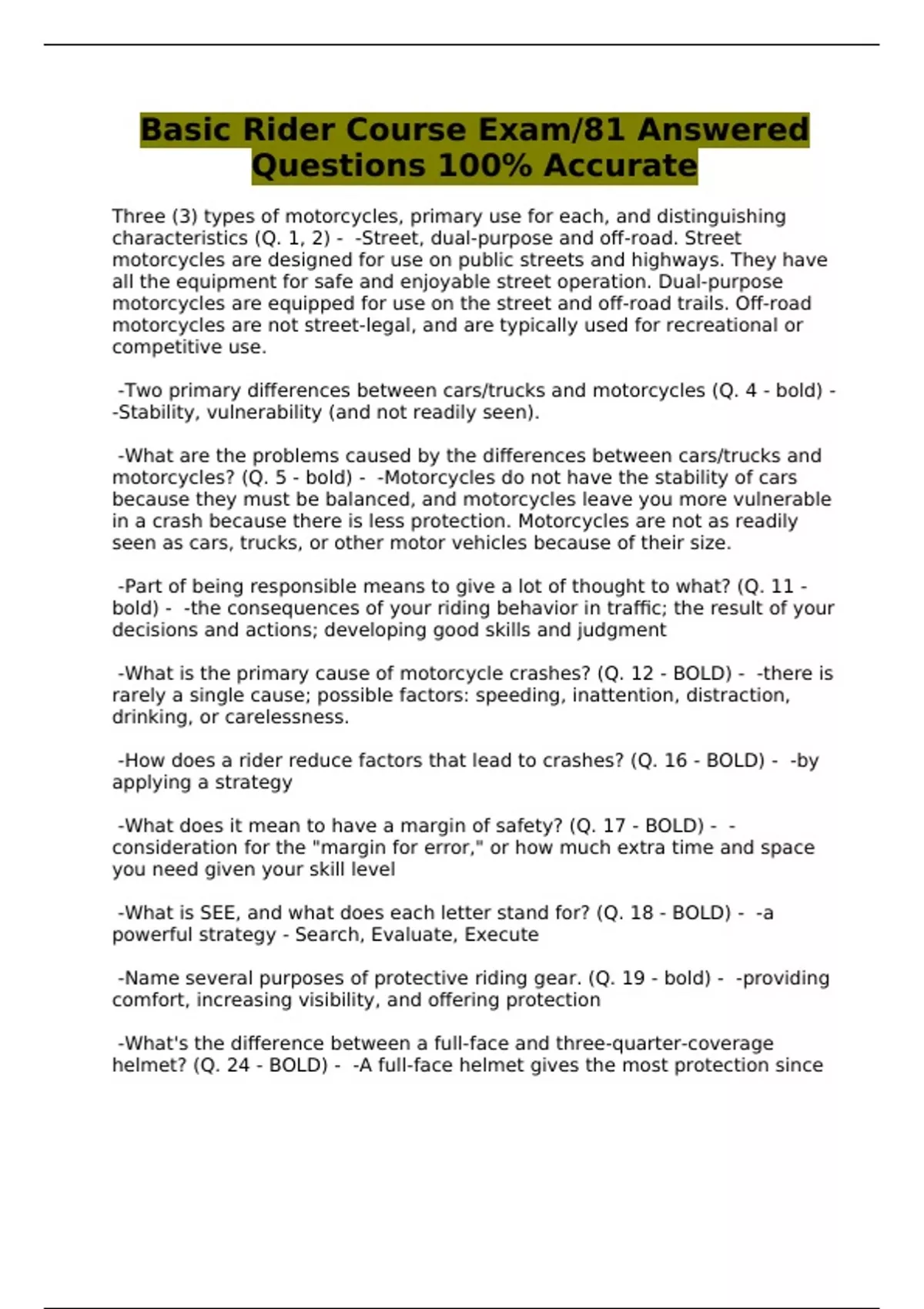 Basic Rider Course Exam/81 Answered Questions 100% Accurate