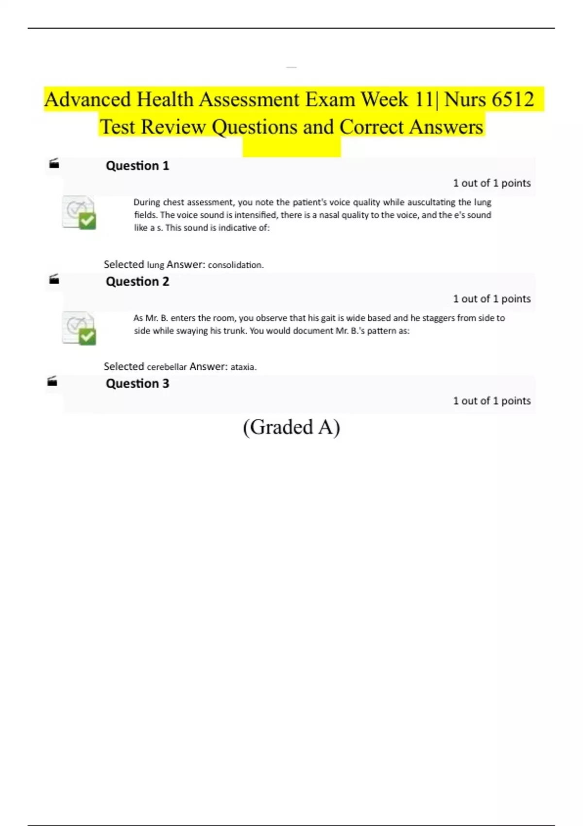 Advanced Health Assessment Exam Week 11| Nurs 6512 Test Review Questions and Correct Answers