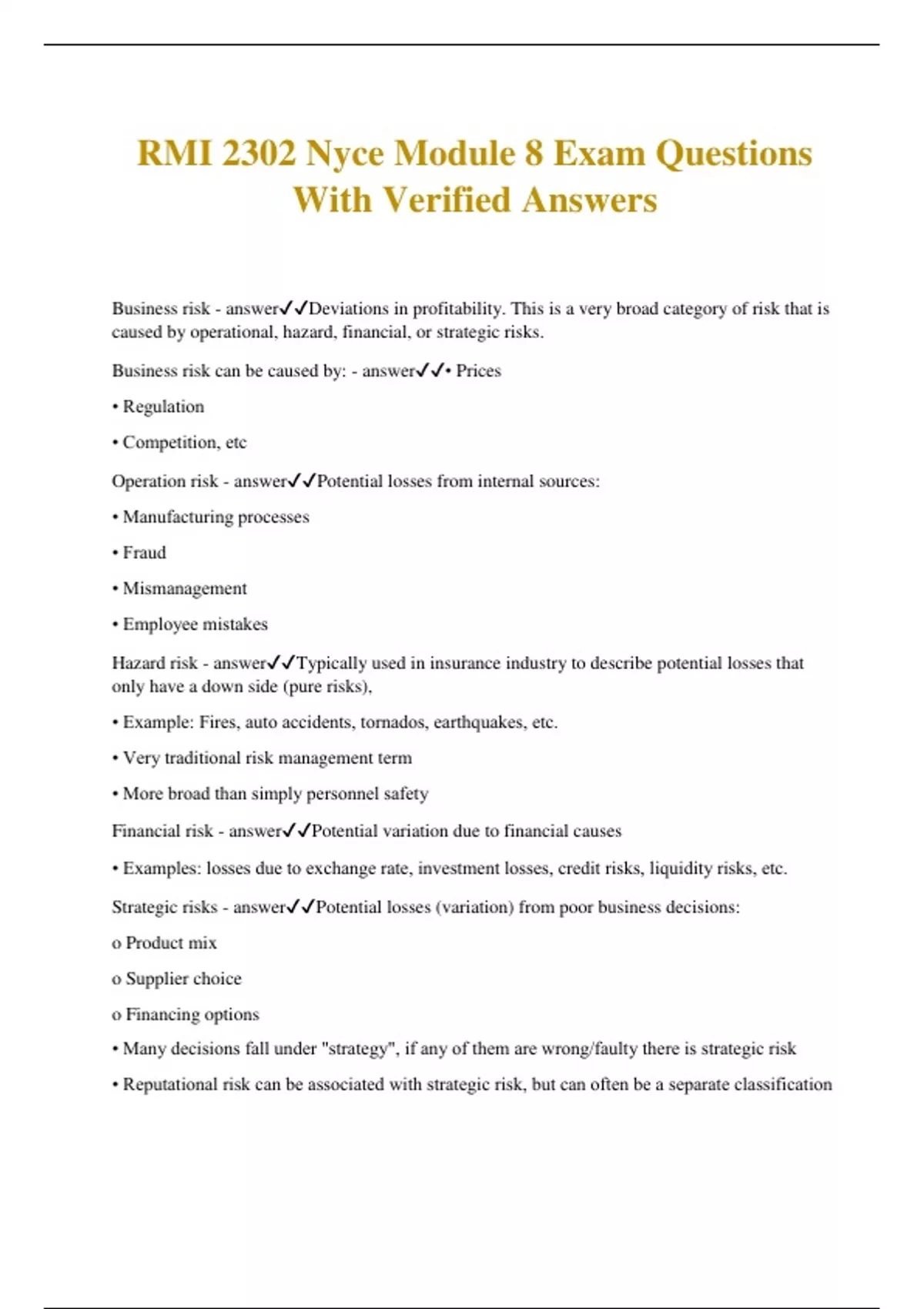 RMI 2302 Nyce Module 8 Exam Questions With Verified Answers Business risk - answerDeviations in profitability. This is a very broad category of risk that is caused by operational, hazard, financial, or strategic risks. Business risk can be caused by: - answer• Prices • Regulation • Competition, etc Operation risk - answerPotential losses from internal sources: • Manufacturing processes • Fraud • Mismanagement • Employee mistakes Hazard risk - answerTypically used in insurance industry to describe potential losses that only have a down side (pure risks), • Example: Fires, auto accidents, tornados, earthquakes, etc. • Very traditional risk management term • More broad than simply personnel safety Financial risk - answerPotential variation due to financial causes • Examples: losses due to exchange rate, investment losses, credit risks, liquidity risks, etc. Strategic risks - answerPotential losses (variation) from poor business decisions: o Product mix o Supplier choice o Financing options • Many decisions fall under "strategy", if any of them are wrong/faulty there is strategic risk • Reputational risk can be associated with strategic risk, but can often be a separate classification