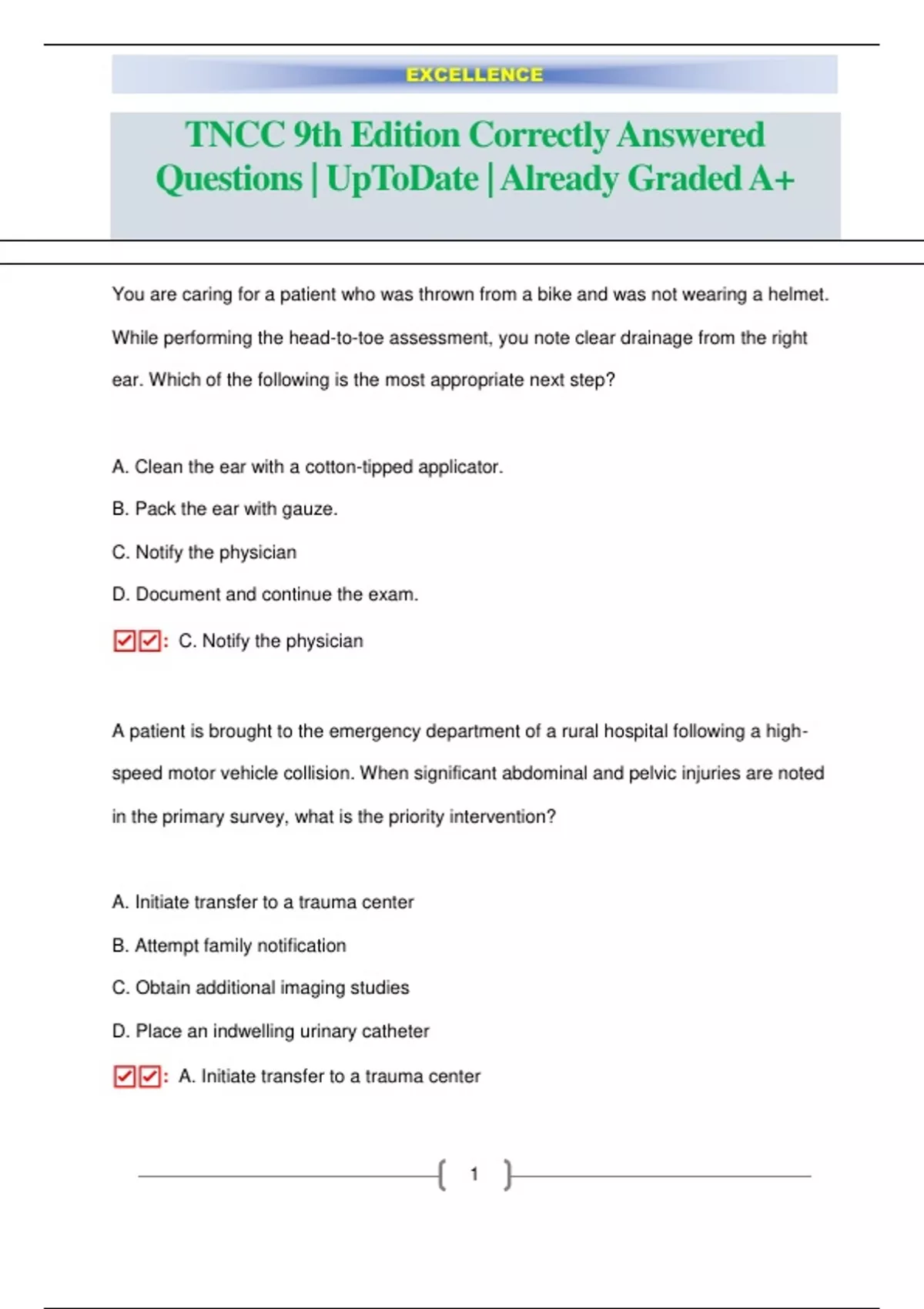 You are caring for a patient who was thrown from a bike and was not wearing a helmet. While performing the head-to-toe assessment, you note clear drainage from the right ear. Which of the following is the most appropriate next step? A. Clean the ear with a cotton-tipped applicator. B. Pack the ear with gauze. C. Notify the physician D. Document and continue the exam. ☑: C. Notify the physician A patient is brought to the emergency department of a rural hospital following a highspeed motor vehicle collision. When significant abdominal and pelvic injuries are noted in the primary survey, what is the priority intervention? A. Initiate transfer to a trauma center B. Attempt family notification C. Obtain additional imaging studies D. Place an indwelling urinary catheter ☑: A. Initiate transfer to a trauma center EXCELLENCE 2 An adult who fell from a second story roof is brought to the emergency department by private vehicle. The patient is confused with unlabored respirations and has strong, palpable radial pulses. There is an open wound in proximity to an obvious deformity of the left lower extremity. What is the priority intervention? A. Initiate cervical spine stabilization B. Apply a splint to the lower extremity C. Put the patient on portable oxygen. D. Log roll the patient onto a spine board ☑: A. Initiate cervical spine stabilization An adult patient who sustained a severe head trauma has been intubated and is being manually ventilated via a bag-mask device at a rate of 18 breaths/minute. The patient has received one intravenous fluid bolus of 500 mL of warmed isotonic crystalloid solution. The PaCO2 is 30 mm Hg (4.0 kPa), and the pulse oximetry is 92%. BP is 142/70 mm Hg. What is the most important intervention to manage the cerebral blood flow? A. Decrease the rate of manual ventilation. B. Initiate another fluid bolus. C. Recheck endotracheal tube placement. D. Increase the amount of oxygen delivered.