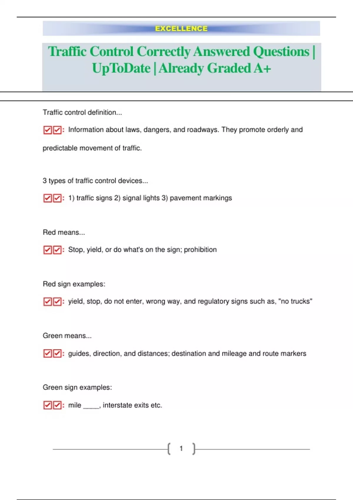Traffic control definition... ☑: Information about laws, dangers, and roadways. They promote orderly and predictable movement of traffic. 3 types of traffic control devices... ☑: 1) traffic signs 2) signal lights 3) pavement markings Red means... ☑: Stop, yield, or do what's on the sign; prohibition Red sign examples: ☑: yield, stop, do not enter, wrong way, and regulatory signs such as, "no trucks" Green means... ☑: guides, direction, and distances; destination and mileage and route markers Green sign examples: ☑: mile ____, interstate exits etc. EXCELLENCE 2 Blue means... ☑: general warning Blue sign examples: ☑: Hospitals, resaurants, hotels, gas, phone --- services Flourecent Yellow/neon green means... ☑: warning: school, bicycle/pedestrian warning signs, and regulation Flourecent yellow examples: ☑: pedestrian, school crossings etc