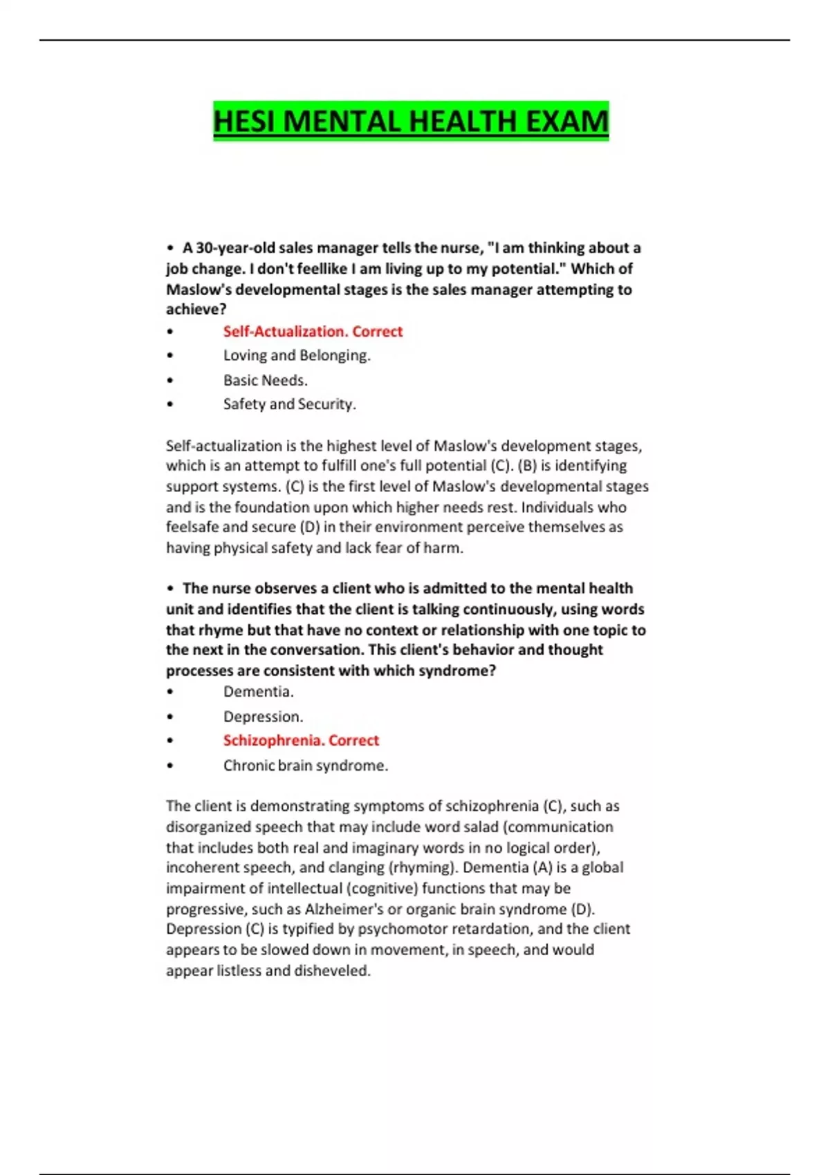 icalsafety and lack fear of harm. • The nurse observes a client who is admitted to the mental health unit and identifies that the client is talking continuously, using words that rhyme but that have no context or relationship with one topic to the next in the conversation. This client's behavior and thought processes are consistent with which syndrome? • Dementia. • Depression. • Schizophrenia. Correct • Chronic brain syndrome. The client is demonstrating symptoms of schizophrenia (C), such as disorganized speech that may include word salad (communication that includes both real and imaginary words in no logical order), incoherent speech, and clanging (rhyming). Dementia (A) is a global impairment of intellectual (cognitive) functions that may be progressive, such as Alzheimer's or organic brain syndrome (D). Depression (C) is typified by psychomotor retardation, and the client appearsto be slowed down in movement, in speech, and would appear listless and disheveled. • A homeless person who is in the manic phase of bipolar disorder is admitted to the mental health unit. Which laboratory finding obtained on admission is most important for the nurse to report to the healthcare provider? • Decreased thyroid stimulating hormone level. Correct • Elevated liver function profile. • Increased white blood cell count. • Decreased hematocrit and hemoglobin levels. Hyperthyroidism causes an increased level of serum thyroid hormones (T3 and T4), which inhibit the release of TSH (A),so the client's manic behavior may be related to an endocrine disorder. (B, C, and D) are abnormal findings that are commonly found in the homeless population because of poorsanitation, poor nutrition, and the prevalence of substance abuse. • An adult male client who was admitted to the mental health unit yesterday tells the nursethat microchips were planted in his head for military surveillance of his every move. Which response is best for the nurse to provide? • You are in the hospital, and I am the nurse caring for you. • It must be difficult for you to control your anxiousfeelings. • Go to occupational therapy and start a project. Correct • You are not in a war area now; this is the United States. Delusions often generate fear and isolation, so the nurse should help the client participate inactivitiesthat avoid focusing on the false belief and encourage interaction with others (C). Delusions are often well-fixed, and though (A) reinforces reality, it is argumentative and dismisses the client's fears. It is often difficult for the client to recognize the relationship between delusions and anxiety (B), and the nurse should reassure the client that he isin a safeplace. Dismissing delusional thinking (D) is unrealistic because neurochemical imbalances thatcause positive symptoms of schizophrenia require antipsychotic drug therapy. • The nurse is assessing a client'sintelligence. Which factor should the nurse rememberduring this part of the mental status exam? • Acute psychiatric illnessesimpairintelligence. • Intelligence isinfluenced by social and cultural beliefs. Correct • Poor concentration skillssuggests limited intelligence. • The inability to think abstractly indicates limited intelligence. Social and cultural beliefs (B) have significant impact on intelligence. Chronic psychiatric illnessmay impair intelligence (A), especially if it remains untreated. Limited concentration does notsuggest limited intelligence (C). Difficulties with abstractions are suggestive of psychotic thinking (D), not limited intelligence. • At a support meeting of parents of a teenager with polysubstance dependency, a parent states, "Each time my son tries to quit taking drugs, he gets so depressed that I'm afraid he will commit suicide." The nurse's response should be based on which information? • Addiction is a chronic, incurable disease. • Tolerance to the effects of drugs causesfeelings of depression. • Feelings of depression frequently lead to drug abuse and addiction. • Careful monitoring should be provided during withdrawal from the drugs. Correct The priority is to teach the parents that their son will need monitoring and support during withdrawal (D) to ensure that he does not attempt suicide. Although (A and C) are true, theyare not asrelevant to the parent's expressed concern. There is no information to support (B). • The wife of a male client recently diagnosed with schizophrenia asks the nurse, "What exactly is schizophrenia? Is my husband all right?" Which response is best for the nurse to provide to this family member? • It soundslike you're worried about your husband. Let's sit down and talk. • Itis a chemical imbalance in the brain that causes disorganized thinking. Correct • Your husband will be just fine if he takes his medicationsregularly. • I think you should talk to your husband's psychologist about this question. The nurse should answer the client's question with factual information and explain that schizophrenia is a chemical imbalance in the brain (B). (A) is a therapeutic response but doesnot answer the question, and may be an appropriate response after the nurse answers the question asked. Although (C) is likely true to some degree, it is also true that some clients continue to have disorganized thinking even with antipsychotic medications. Referring the spouse to the psychologist (D) is avoiding the issue; the nurse can and should answer the question. • A young adult male client, diagnosed with paranoid schizophrenia, believes that world istrying poison him. What intervention should the nurse include in this client's plan of care? • Remind the client that his suspicions are not true. • Ask one nurse to spend time with the client daily. Correct • Encourage the client to participate in group activities. • Assign the client to a room closest to the activity room.