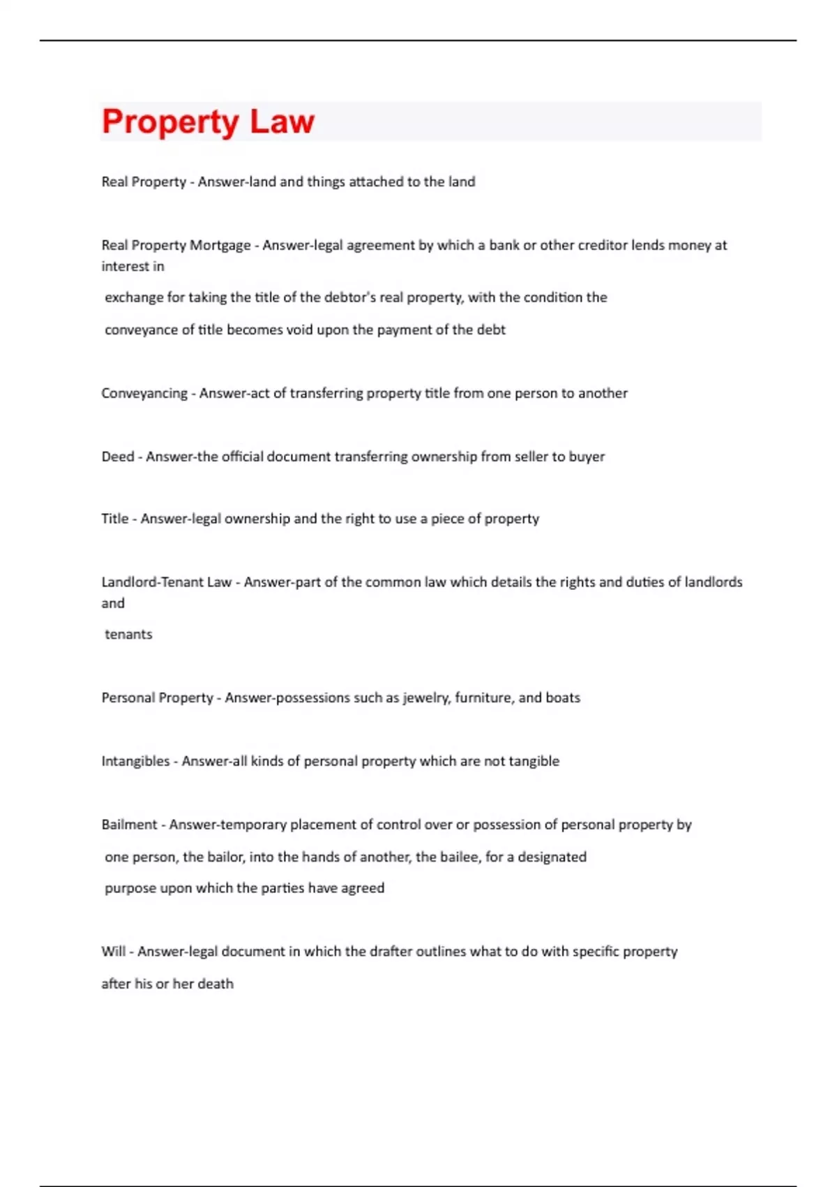 Real Property - Answer-land and things attached to the land Real Property Mortgage - Answer-legal agreement by which a bank or other creditor lends money at interest in exchange for taking the title of the debtor's real property, with the condition the conveyance of title becomes void upon the payment of the debt Conveyancing - Answer-act of transferring property title from one person to another Deed - Answer-the official document transferring ownership from seller to buyer Title - Answer-legal ownership and the right to use a piece of property Landlord-Tenant Law - Answer-part of the common law which details the rights and duties of landlords and tenants Personal Property - Answer-possessions such as jewelry, furniture, and boats Intangibles - Answer-all kinds of personal property which are not tangible Bailment - Answer-temporary placement of control over or possession of personal property by one person, the bailor, into the hands of another, the bailee, for a designated purpose upon which the parties have agreed Will - Answer-legal document in which the drafter outlines what to do with specific property after his or her deathInheritance - Answer-gift of money or property from a deceased person after his or her death intellectual property - Answer-a work or invention that is the result of creativity, such as a manuscript or a design, to which one has rights and for which one may apply for a patent, copyright, trademark, etc. patent - Answer-(n.) exclusive rights over an invention; copyright; (v.) to arrange or obtain such rights; (adj.) plain, open to view; copyrighted Copyright - Answer-the exclusive legal right, given to an originator or an assignee to print, publish, perform, film, or record literary, artistic, or musical material, and to authorize others to do the same. Trademark - Answer-the exclusive right to use a brand or part of a brand Bailment - Answer-the transfer of possession but not the title of personal property by one party to another, under agreement Special bailment - Answer-A bailment for the sole benefit of the bailee gratuitous bailment - Answer-A bailment for the sole benefit of the bailor Mutual benefit bailment - Answer-A bailment in which both the bailor and bailee receive benefits Carrier - Answer-A business that transports persons, goods, or both Common Carrier - Answer-A carrier that is compensated for providing transportation to the general public