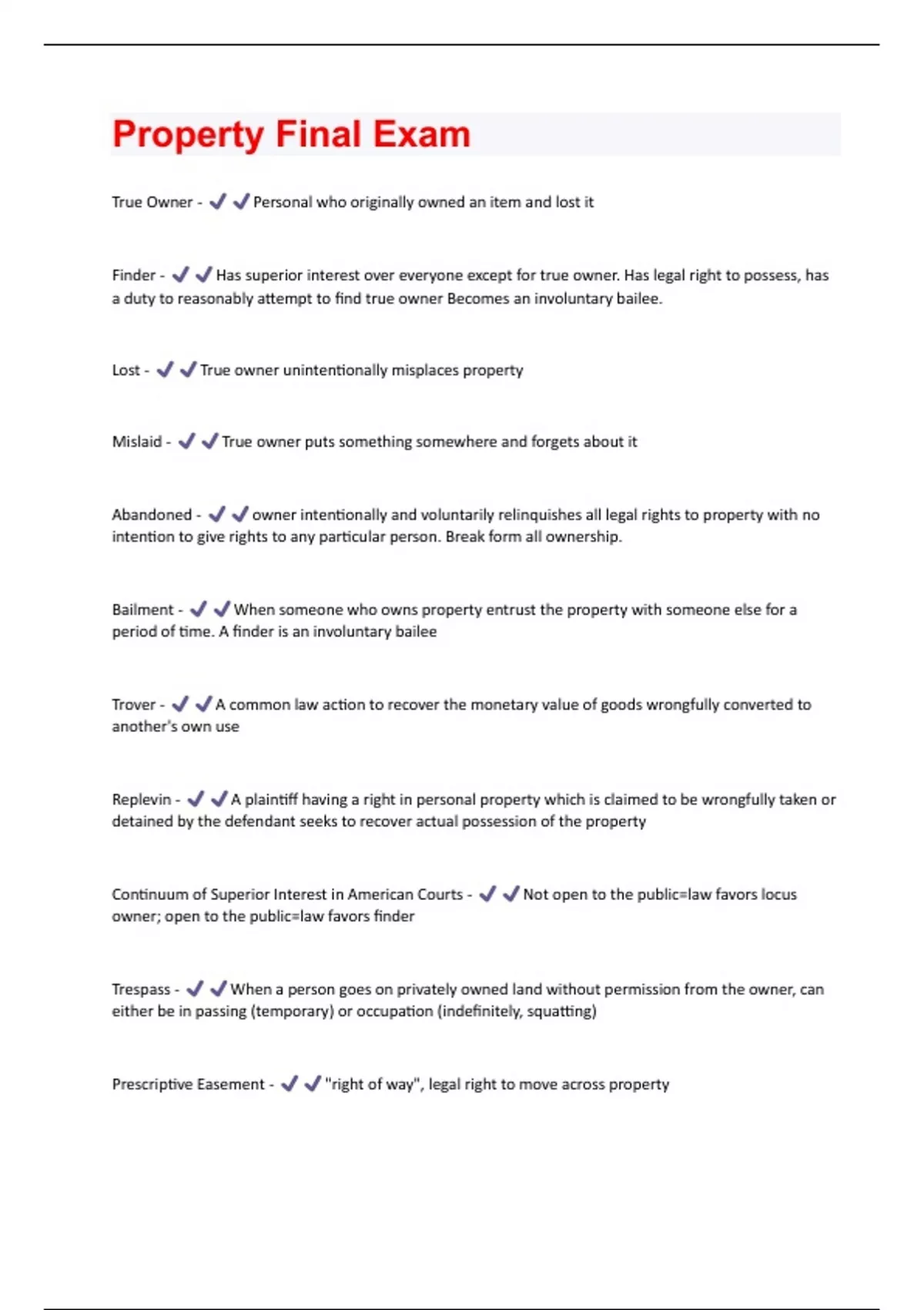 True Owner - Personal who originally owned an item and lost it Finder - Has superior interest over everyone except for true owner. Has legal right to possess, has a duty to reasonably attempt to find true owner Becomes an involuntary bailee. Lost - True owner unintentionally misplaces property Mislaid - True owner puts something somewhere and forgets about it Abandoned - owner intentionally and voluntarily relinquishes all legal rights to property with no intention to give rights to any particular person. Break form all ownership. Bailment - When someone who owns property entrust the property with someone else for a period of time. A finder is an involuntary bailee Trover - A common law action to recover the monetary value of goods wrongfully converted to another's own use Replevin - A plaintiff having a right in personal property which is claimed to be wrongfully taken or detained by the defendant seeks to recover actual possession of the property Continuum of Superior Interest in American Courts - Not open to the public=law favors locus owner; open to the public=law favors finder Trespass - When a person goes on privately owned land without permission from the owner, can either be in passing (temporary) or occupation (indefinitely, squatting) Prescriptive Easement - "right of way", legal right to move across propertySuit to quiet title - Asking courts for a settlement over ownership disputes Elements of Adverse Possession for IL law - Actual possession, open and notorious, exclusive, hostile, continuous (20 year) Discovery Rule - The statute of limitations on a trover/replevin for personal property does not begin until the owner knows or reasonably should have known who has the personal property Bundle of rights - We have many rights that come with many different types of property, but depending on the type, the law may not allow us to exercise *all* rights Inter vivos - during the lifetime Heir - Anyone who takes property under intestate succession Descendants - Children or grandchildren of the deceased Alienation - Right to transfer property Fee Simple - Ownership of property Conveyance - Legal document where ownership of property is transferred Grantor - The person who is transferring property to another person Grantee - The person to whom the property is transferred Words of purchase - The words "O to A" indicating who is conveying the estate to whomWords if limitation - For example, the words "for life" indicating the amount of time the estate is being convey for Testator - A person who writes a will Intestate - Person who dies without a will Probate Proceedings - Supervised transfer of property from deceased persons to others Per stripes - If someone in a generation had died, any descendent takes that deceased person's share Future Interest - A right to receive either real or personal property Right of entry - future interest retained by the transfer to divest a fee simple subject to condition subsequent Deed - Conveyance of land inter vivos, transfer of land is automatic at the time of death Devise - Taking property per a will Intestate - How property is divided when someone dies without a will Esheat - In IL, when someone dies without an heir, no one can be found through intestate succession, property reverts to the county in which the decedent was a resident at the time of death Defeasible Fees - When real property is granted and a condition is placed on the grant; if the condition is violated, the property ownership could be stripped from the grantee. FSD and FSSCSFee Simple Determinable - If the grantor did not indicate option to re-take, if the condition is violated there is an automatic reverter of the property. If the grantee doesn't move, the grantor has seven years to bring the ejectment action Fee Simple Subject to Condition Subsequent - If the language indicates that the grantor has the option to retake the land within seven years, right to re-enter; Grantor must affirmatively act to reclaim Life Estate - Property which O conveys to A for A's lifetime Life Tenant - If O conveys to A for A's lifetime, life tenant is A Reversion - The return to the grantor (or his heirs) of real property after all interests in the property given to others is terminated Remainder - The interest in real property that is left after a life estate Testamentory Conveyance - Conveyance of property in a will Rules of Construction - Guiding principles for interpreting the terms of a conveyance Suit in Waste - A cause of action addressing the change in condition of real property brought about by a current tenant that damages or destroys the value of the property Elements of a gift - Donative Intent; Delivery (manual, constructive, symbolic); Acceptance Tenancy in Common - Two or more people with ownership (in Fee simple) in a piece of real property; right to seek partition if there are irreconcilable differences--either sold or physical division (each getting their fractional interest). Can convey fractional interest inter vivos; creditor could obtain debtor's portionJoint Tenancy - "not in tenancy in common but in joint tenancy" (IL Law). If there is a conveyance inter vivos, the joint tenancy is severed, new tenant and old will have tenancy in common; creditor can reach; right of survivorship Tenancy by Entirety - Recognized in Illinois; grantees must be spouses; "tenants by the entirety"' can only apply to principle residence; right of survivorship; neither spouse alone can transfer inter vivos' no creditor can reach any individual portion; upon divorce they become tenants in common