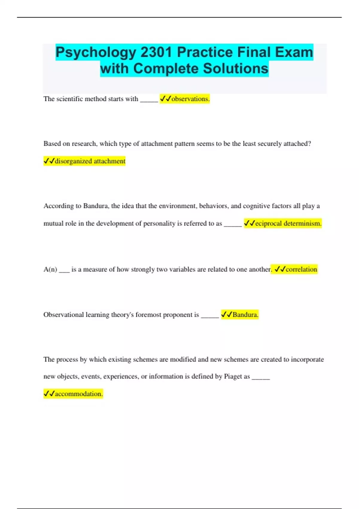 Psychology 2301 Practice Final Exam with Complete Solutions