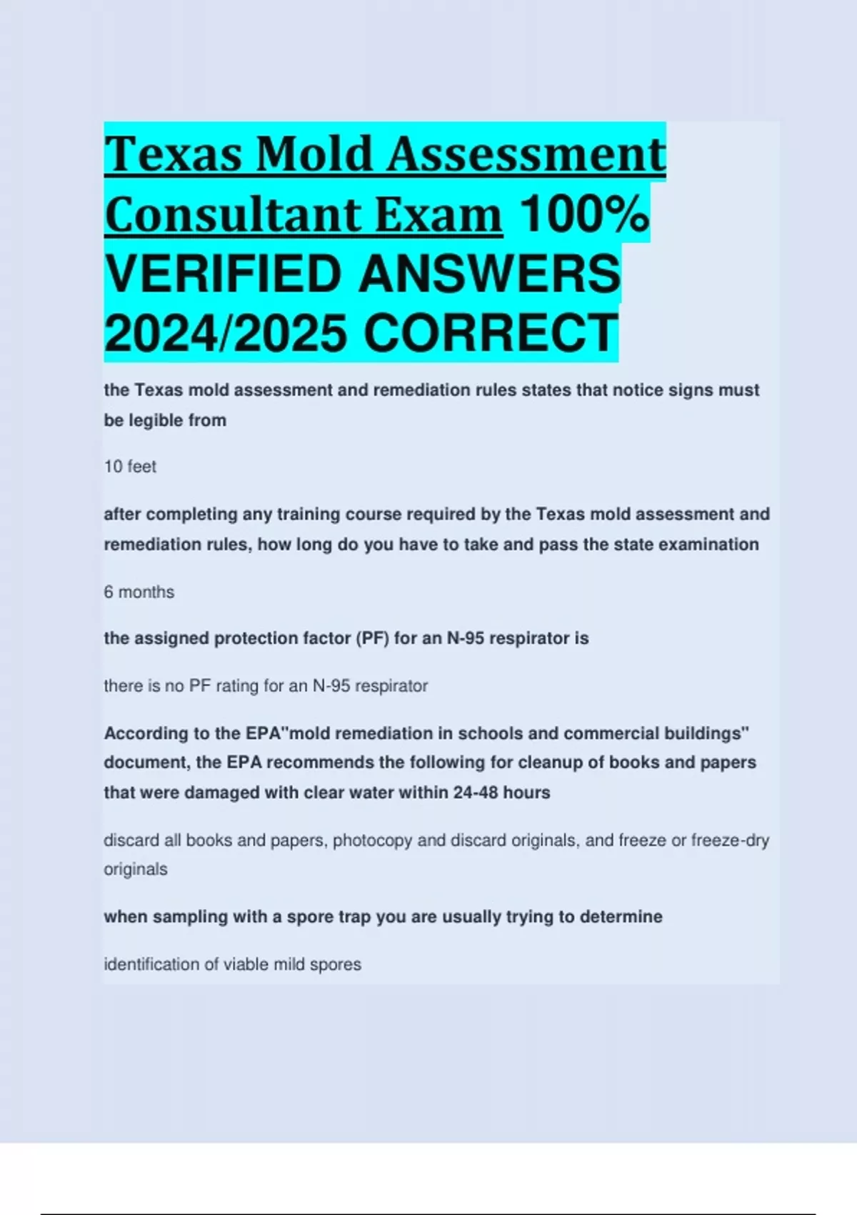 Texas Mold Assessment Consultant Exam 100% VERIFIED ANSWERS 2024/2025 CORRECT