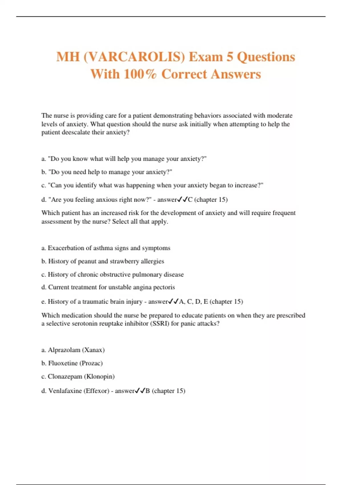 MH (VARCAROLIS) Exam 5 Questions With 100% Correct Answers The nurse is providing care for a patient demonstrating behaviors associated with moderate levels of anxiety. What question should the nurse ask initially when attempting to help the patient deescalate their anxiety? a. "Do you know what will help you manage your anxiety?" b. "Do you need help to manage your anxiety?" c. "Can you identify what was happening when your anxiety began to increase?" d. "Are you feeling anxious right now?" - answerC (chapter 15) Which patient has an increased risk for the development of anxiety and will require frequent assessment by the nurse? Select all that apply. a. Exacerbation of asthma signs and symptoms b. History of peanut and strawberry allergies c. History of chronic obstructive pulmonary disease d. Current treatment for unstable angina pectoris e. History of a traumatic brain injury - answerA, C, D, E (chapter 15) Which medication should the nurse be prepared to educate patients on when they are prescribed a selective serotonin reuptake inhibitor (SSRI) for panic attacks? a. Alprazolam (Xanax) b. Fluoxetine (Prozac) c. Clonazepam (Klonopin) d. Venlafaxine (Effexor) - answerB (chapter 15) Which statement(s) made by the nurse demonstrates an understanding of the effective use of relaxation therapy for anxiety management? Select all that apply. a. "Relaxation therapy's main goal is to prevent exhaustion by removing muscle tension." b. "Muscle relaxation promotes the relaxation response." c. "Show me how you learned to deep breathe in yesterday's therapy session." d. "You've said that going to group makes you nervous so let's start relaxing now." e. "I've given you written descriptions of the various relaxation exercises for you to review." - answerB, C, D, E (chapter 15) To maximize the therapeutic effect, which lifestyle practice should the nurse discourage for a patient who has been recently prescribed an antianxiety medication? a. Eating high protein foods. b. Using acetaminophen without first discussing it with a healthcare provider c. Taking medications after eating dinner or while having a bedtime snack d. Buying a large coffee with sugar and extra cream each morning on the way to work - answerD (chapter 15) In a parent teacher conference, the school nurse meets with the parents of a profoundly shy 8- year-old girl. The parents hold hands, speak softly, respond briefly, and have poor eye contact. The nurse recognizes that the child is most likely exposed to parental modeling and: a. The inherited shyness trait b. A lack of affection in the home c. Severe punishment by the parents d. Is afraid to say something foolish - answerA (chapter 15) Isabel is a straight-A student, yet she suffers from severe test anxiety and seeks medical attention. The nurse interviews Isabel and develops a plan of care. The nurse recognizes effective teaching about mild anxiety when Isabel states: a. "I would like to try a benzodiazepine for my anxiety." b. "If I study harder, my anxiety level will go down."