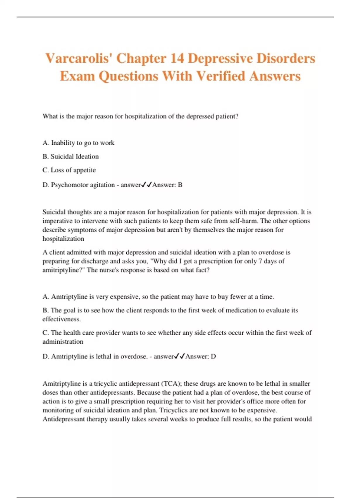 Varcarolis' Chapter 14 Depressive Disorders Exam Questions With Verified Answers What is the major reason for hospitalization of the depressed patient? A. Inability to go to work B. Suicidal Ideation C. Loss of appetite D. Psychomotor agitation - answerAnswer: B Suicidal thoughts are a major reason for hospitalization for patients with major depression. It is imperative to intervene with such patients to keep them safe from self-harm. The other options describe symptoms of major depression but aren't by themselves the major reason for hospitalization A client admitted with major depression and suicidal ideation with a plan to overdose is preparing for discharge and asks you, "Why did I get a prescription for only 7 days of amitriptyline?" The nurse's response is based on what fact? A. Amtriptyline is very expensive, so the patient may have to buy fewer at a time. B. The goal is to see how the client responds to the first week of medication to evaluate its effectiveness. C. The health care provider wants to see whether any side effects occur within the first week of administration D. Amtriptyline is lethal in overdose. - answerAnswer: D Amitriptyline is a tricyclic antidepressant (TCA); these drugs are known to be lethal in smaller doses than other antidepressants. Because the patient had a plan of overdose, the best course of action is to give a small prescription requiring her to visit her provider's office more often for monitoring of suicidal ideation and plan. Tricyclics are not known to be expensive. Antidepressant therapy usually takes several weeks to produce full results, so the patient would not be evaluated after only 1 week. Side effects are always a consideration but not the most important consideration with TCAs. When the nurse asks whether a client is having any thoughts of suicide, the client becomes angry and defensive, shouting, "I'm sick of you people! Are you ever do is ask me the same question over and over. Get out of here!" The nurse's response is based on what fact concerning hostility? A. The client is getting better and is able to be assertive. B. The client may be at high risk for self-harm. C. The client is probably experiencing transference. D. The client may be angry at someone else and projecting that anger to staff. - answerAnswer: B Overt hostility is highly correlated with suicide; therefore the patient may be considered high risk, and appropriate precautions should be taken. The other responses are incorrect with no evidence to support them A client prescribed fluoxetine demonstrates an understanding of the medication teaching when making which statement? A. "I will make sure to get plenty of sunshine and not use sunscreen to avoid a skin reaction." B. "I will not take any over-the-counter medication while on the fluoxetine." C. "I will report any symptoms of high fever, fast heartbeat, or abdominal pain to my provider right away." D. "I will report increased thirst and urination to my provider." - answerAnswer: C This describes symptoms of serotonin syndrome, a life-threatening complication of SRRI medication. The other options are incorrect because the patient should be wearing sunscreen to avoid sunburn, may take over-the-counter medications if sanctioned by the provider, and would not have been educated to report increased thirst and urination as a side effect of fluoxetine. A 38-year-old patient is admitted with major depression. Which statement made by the patient alerts the nurse to a common accompaniment to depression? A. "I still pray and read my Bible every day."