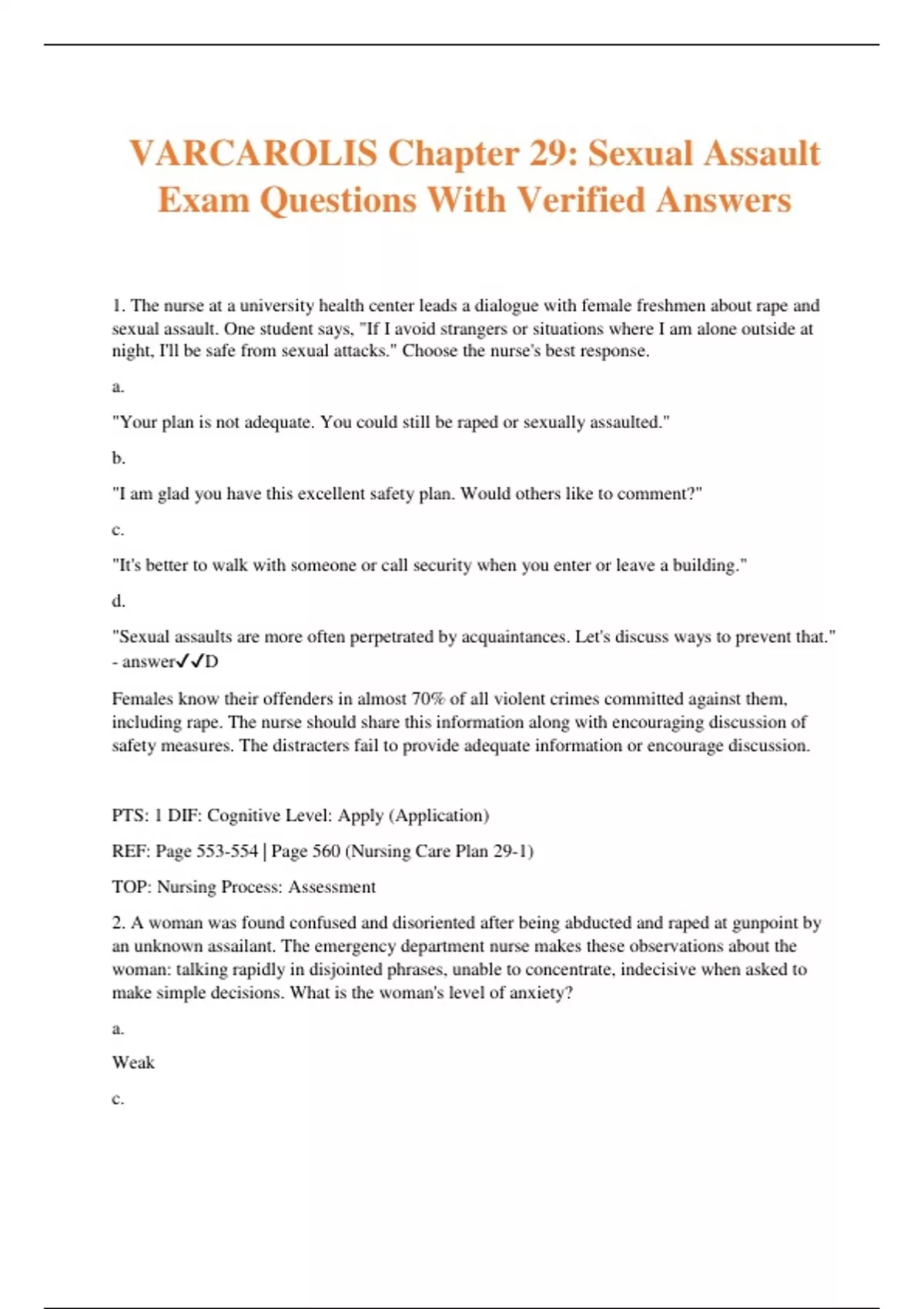 VARCAROLIS Chapter 29: Sexual Assault Exam Questions With Verified Answers 1. The nurse at a university health center leads a dialogue with female freshmen about rape and sexual assault. One student says, "If I avoid strangers or situations where I am alone outside at night, I'll be safe from sexual attacks." Choose the nurse's best response. a. "Your plan is not adequate. You could still be raped or sexually assaulted." b. "I am glad you have this excellent safety plan. Would others like to comment?" c. "It's better to walk with someone or call security when you enter or leave a building." d. "Sexual assaults are more often perpetrated by acquaintances. Let's discuss ways to prevent that." - answerD Females know their offenders in almost 70% of all violent crimes committed against them, including rape. The nurse should share this information along with encouraging discussion of safety measures. The distracters fail to provide adequate information or encourage discussion. PTS: 1 DIF: Cognitive Level: Apply (Application) REF: Page 553-554 | Page 560 (Nursing Care Plan 29-1) TOP: Nursing Process: Assessment 2. A woman was found confused and disoriented after being abducted and raped at gunpoint by an unknown assailant. The emergency department nurse makes these observations about the woman: talking rapidly in disjointed phrases, unable to concentrate, indecisive when asked to make simple decisions. What is the woman's level of anxiety? a. Weak c. Moderate b. Mild d. Severe - answerD Acute anxiety results from the personal threat to the victim's safety and security. In this case, the patient's symptoms of rapid, dissociated speech, inability to concentrate, and indecisiveness indicate severe anxiety. Weak is not a level of anxiety. Mild and moderate levels of anxiety would allow the patient to function at a higher level. PTS: 1 DIF: Cognitive Level: Understand (Comprehension) REF: Page 560 (Nursing Care Plan 29-1) + learning from Chapter 15 TOP: Nursing Process: Assessment 3. After an abduction and rape at gunpoint by an unknown assailant, which assessment finding best indicates that a patient is in the acute phase of the rape-trauma syndrome? a. Decreased motor activity c. Flashbacks and dreams b. Confusion and disbelief d. Fears and phobias - answerB Reactions of the acute phase of the rape-trauma syndrome are shock, emotional numbness, confusion, disbelief, restlessness, and agitated motor activity. Flashbacks, dreams, fears, and phobias are seen in the long-term reorganization phase of the rape-trauma syndrome. Decreased motor activity by itself is not indicative of any particular phase. PTS: 1 DIF: Cognitive Level: Understand (Comprehension) REF: Page 554 | Page 558 (Table 29-2) | Page 560 (Nursing Care Plan 29-1)