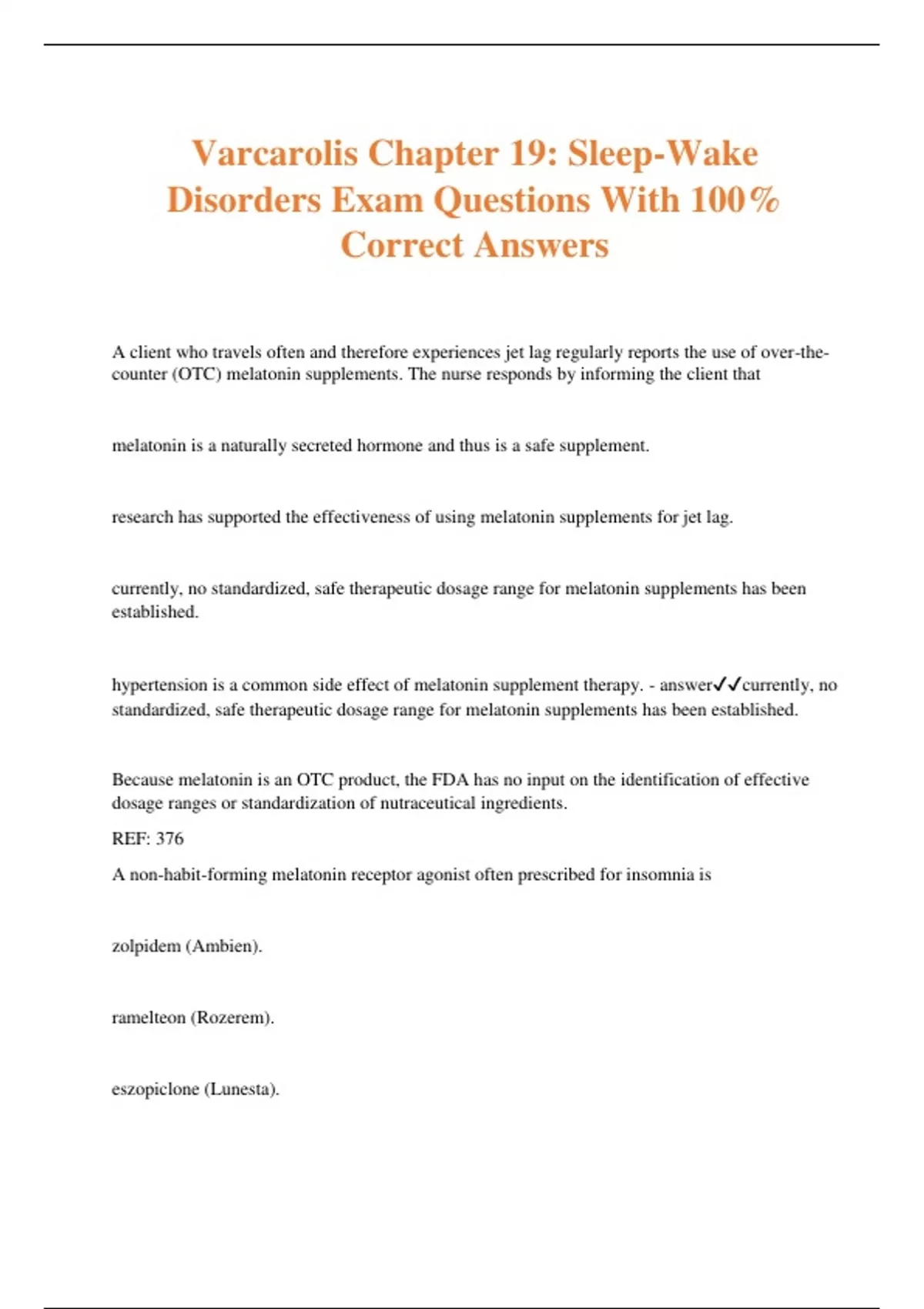 Varcarolis Chapter 19: Sleep-Wake Disorders Exam Questions With 100% Correct Answers A client who travels often and therefore experiences jet lag regularly reports the use of over-the- counter (OTC) melatonin supplements. The nurse responds by informing the client that melatonin is a naturally secreted hormone and thus is a safe supplement. research has supported the effectiveness of using melatonin supplements for jet lag. currently, no standardized, safe therapeutic dosage range for melatonin supplements has been established. hypertension is a common side effect of melatonin supplement therapy. - answercurrently, no standardized, safe therapeutic dosage range for melatonin supplements has been established. Because melatonin is an OTC product, the FDA has no input on the identification of effective dosage ranges or standardization of nutraceutical ingredients. REF: 376 A non-habit-forming melatonin receptor agonist often prescribed for insomnia is zolpidem (Ambien). ramelteon (Rozerem). eszopiclone (Lunesta). zaleplon (Sonata). - answerramelteon (Rozerem). Ramelteon (Rozerem) is a short-acting melatonin receptor agonist that has been approved by the FDA for insomnia and is not habit forming. REF: 376; Table 19-2 According to the National Sleep Foundation, which condition is an example of a social problem that may be a result of sleepiness? Narcolepsy Road rage Alcohol abuse Insomnia - answerRoad rage Social problems such as road rage may be caused, in part, by a national epidemic of sleepiness. REF: 365-366 A client tells the nurse, "I just don't sleep more than 5 hours at night." The nurse responds best by asking "Are you aware that some people require less sleep than others?" "When did this pattern of sleep start for you?" "Do you usually feel rested and alert when you get up?" "Are you taking any medication that could affect your sleep?" - answer"Do you usually feel rested and alert when you get up?" The most accurate way to determine an individual's sleep requirements is to ask if the person feels fully awake and functions effectively on the sleep he or she is getting. REF: 368-369 A depressed client is likely to report a sleep disorder that includes frequent awakenings during the night. nightmares. difficulty falling asleep. sleepwalking. - answerfrequent awakenings during the night. Depressed clients often report normal sleep onset, followed by repeated awakenings during the second half of the night. REF: 368-369 Medications to treat insomnia are usually prescribed for no longer than 1 to 2 days. 1 to 2 months. 3 weeks. 2 weeks. - answer2 weeks.