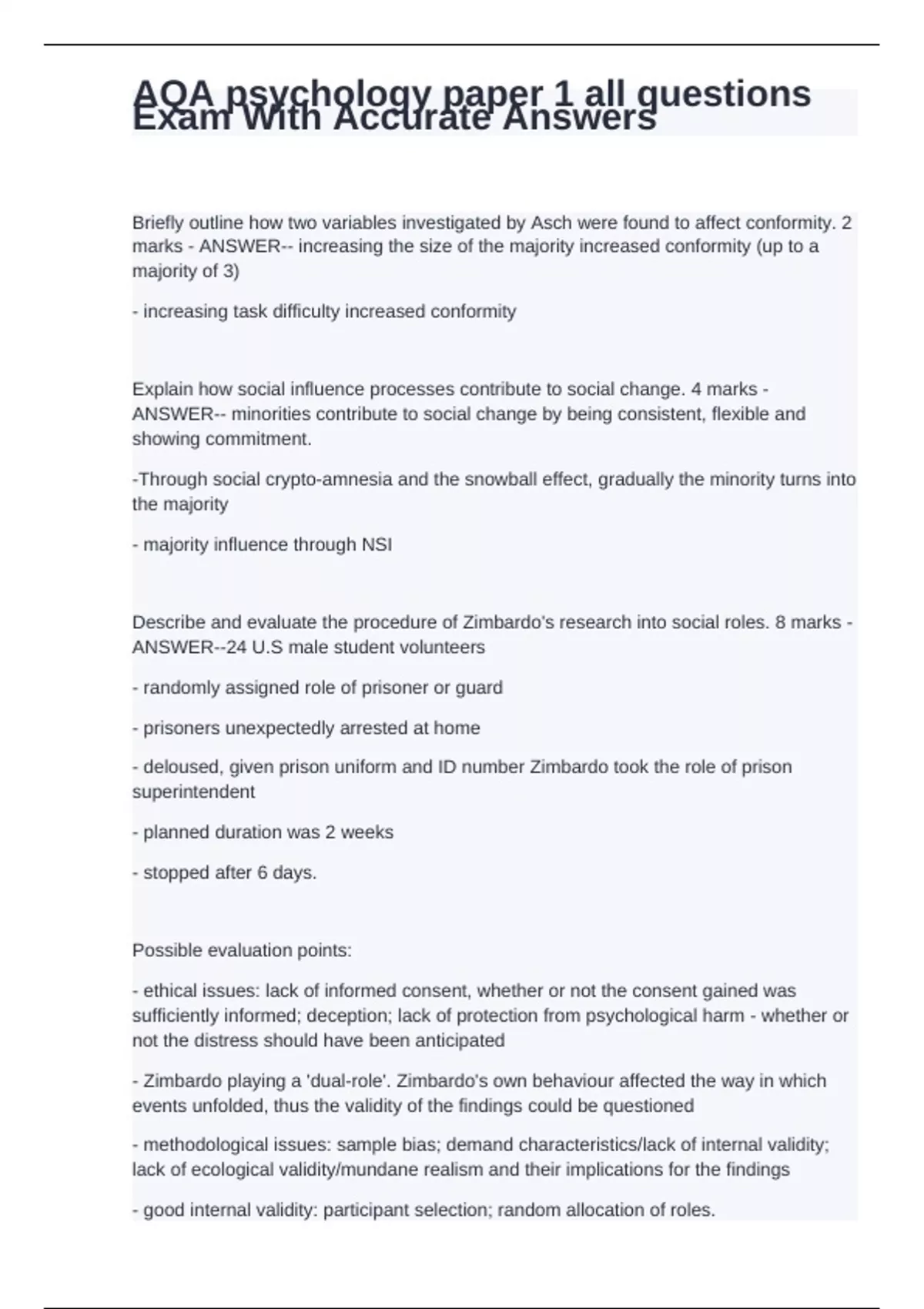 - increasing task difficulty increased conformity Explain how social influence processes contribute to social change. 4 marks - ANSWER-- minorities contribute to social change by being consistent, flexible and showing commitment. -Through social crypto-amnesia and the snowball effect, gradually the minority turns into the majority - majority influence through NSI Describe and evaluate the procedure of Zimbardo's research into social roles. 8 marks - ANSWER--24 U.S male student volunteers - randomly assigned role of prisoner or guard - prisoners unexpectedly arrested at home - deloused, given prison uniform and ID number Zimbardo took the role of prison superintendent - planned duration was 2 weeks - stopped after 6 days. Possible evaluation points: - ethical issues: lack of informed consent, whether or not the consent gained was sufficiently informed; deception; lack of protection from psychological harm - whether or not the distress should have been anticipated - Zimbardo playing a 'dual-role'. Zimbardo's own behaviour affected the way in which events unfolded, thus the validity of the findings could be questioned