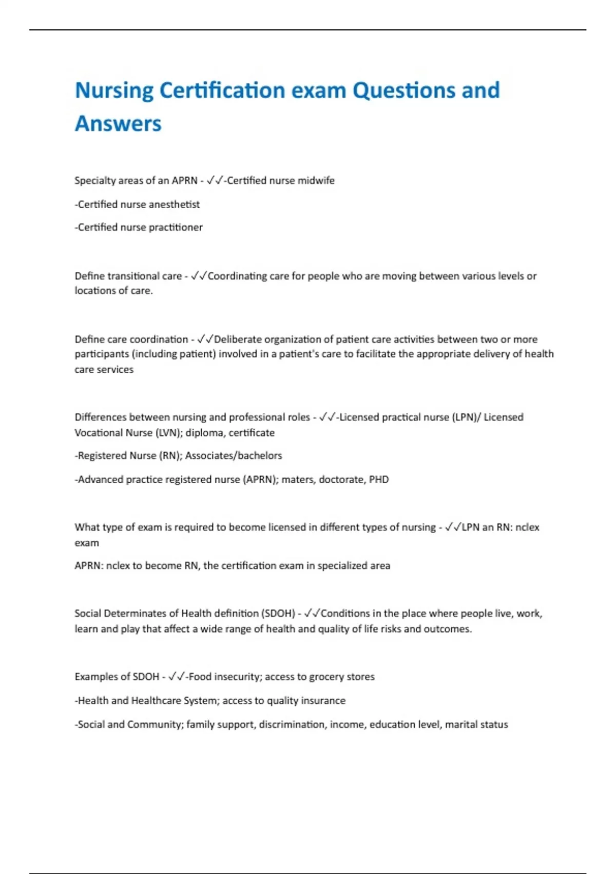 Nursing Certification exam Questions and Answers Specialty areas of an APRN - -Certified nurse midwife -Certified nurse anesthetist -Certified nurse practitioner Define transitional care - Coordinating care for people who are moving between various levels or locations of care. Define care coordination - Deliberate organization of patient care activities between two or more participants (including patient) involved in a patient's care to facilitate the appropriate delivery of health care services Differences between nursing and professional roles - -Licensed practical nurse (LPN)/ Licensed Vocational Nurse (LVN); diploma, certificate -Registered Nurse (RN); Associates/bachelors -Advanced practice registered nurse (APRN); maters, doctorate, PHD What type of exam is required to become licensed in different types of nursing - LPN an RN: nclex exam APRN: nclex to become RN, the certification exam in specialized area Social Determinates of Health definition (SDOH) - Conditions in the place where people live, work, learn and play that affect a wide range of health and quality of life risks and outcomes. Examples of SDOH - -Food insecurity; access to grocery stores -Health and Healthcare System; access to quality insurance -Social and Community; family support, discrimination, income, education level, marital status -Education; access to quality education -Neighborhood and Environment; air and water quality, housing, safety, etc. Average wage of a RN - ~76,000 Florence Nightingale - -Founder of modern nursing -Established St. Thomas hospital and Nightingale training school for nurses in 1860 -"The lady with the lamp" Understand the difference between structural and intermediary factors in the Conceptual Social Determinants of Health (SDOH) Framework on the WHO Commission for SDOH. - -Structural determinates include government, social and cultural policies, and values -Intermediary factors include phycological factors, behaviors and material circumstances Know the key components of the Conceptual Social Determinants of Health (SDOH) Framework on the WHO Commission for SDOH. - -improve daily living conditions -Tackle the inequitable distribution of power, money, and resources -Measure and understand the problem and assess the impact of action Adverse Childhood Experiences (ACEs) - Traumatic events that take place before 18; abuse, neglect, divorce, etc. Describe the Social Needs Model - Maslow - the need to have relationships with others once the physiological and safety needs have been fulfilled. Define Case Management - works with patients and providers to determine the specific care that is required and the best options for that care Define cultural racism - Instillation of inferior values, language, symbols and unstated assumptions of a larger society
