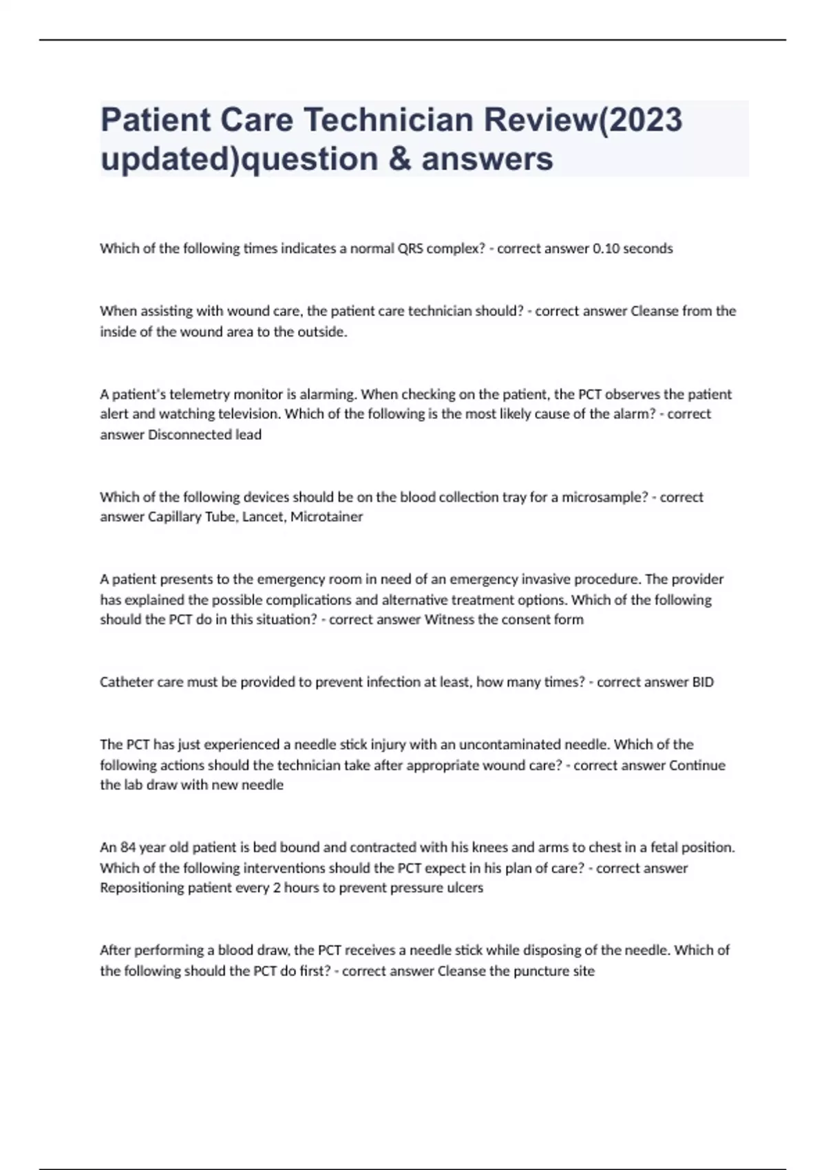 Patient Care Technician Review(2023 updated)question & answers Patient Care Technician Review(2023 updated)question & answers Which of the following times indicates a normal QRS complex? - correct answer 0.10 seconds When assisting with wound care, the patient care technician should? - correct answer Cleanse from the inside of the wound area to the outside. A patient's telemetry monitor is alarming. When checking on the patient, the PCT observes the patient alert and watching television. Which of the following is the most likely cause of the alarm? - correct answer Disconnected lead Which of the following devices should be on the blood collection tray for a microsample? - correct answer Capillary Tube, Lancet, Microtainer A patient presents to the emergency room in need of an emergency invasive procedure. The provider has explained the possible complications and alternative treatment options. Which of the following should the PCT do in this situation? - correct answer Witness the consent form Catheter care must be provided to prevent infection at least, how many times? - correct answer BID The PCT has just experienced a needle stick injury with an uncontaminated needle. Which of the following actions should the technician take after appropriate wound care? - correct answer Continue the lab draw with new needle An 84 year old patient is bed bound and contracted with his knees and arms to chest in a fetal position. Which of the following interventions should the PCT expect in his plan of care? - correct answer Repositioning patient every 2 hours to prevent pressure ulcers After performing a blood