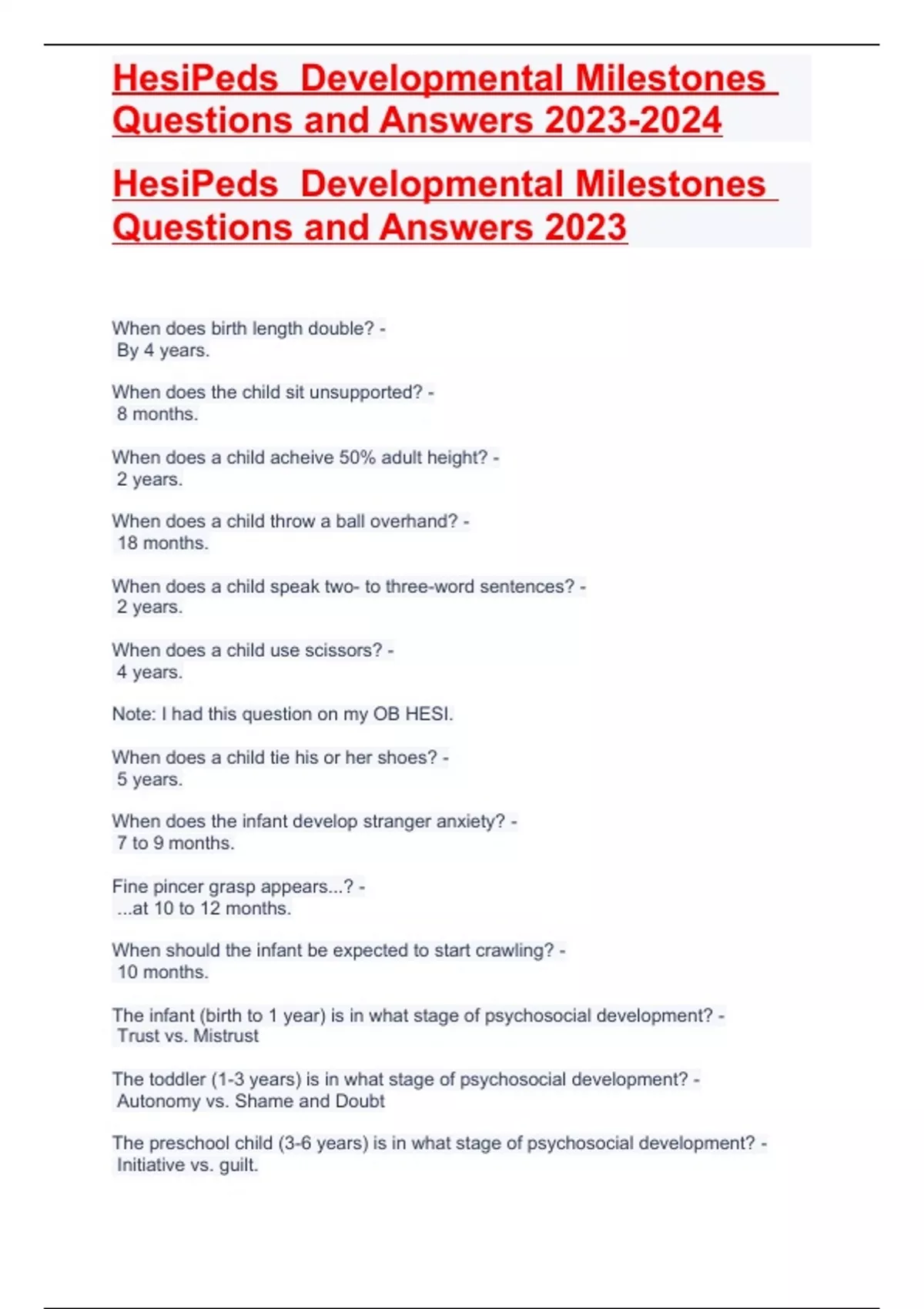 HesiPeds Developmental Milestones Questions and Answers