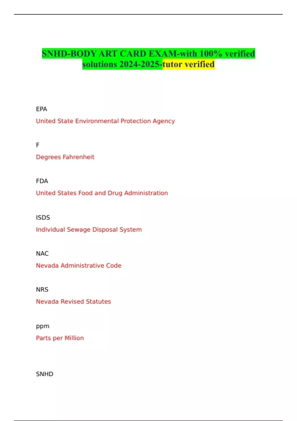 SNHD-BODY ART CARD EXAM-with 100% verified solutions -tutor verified