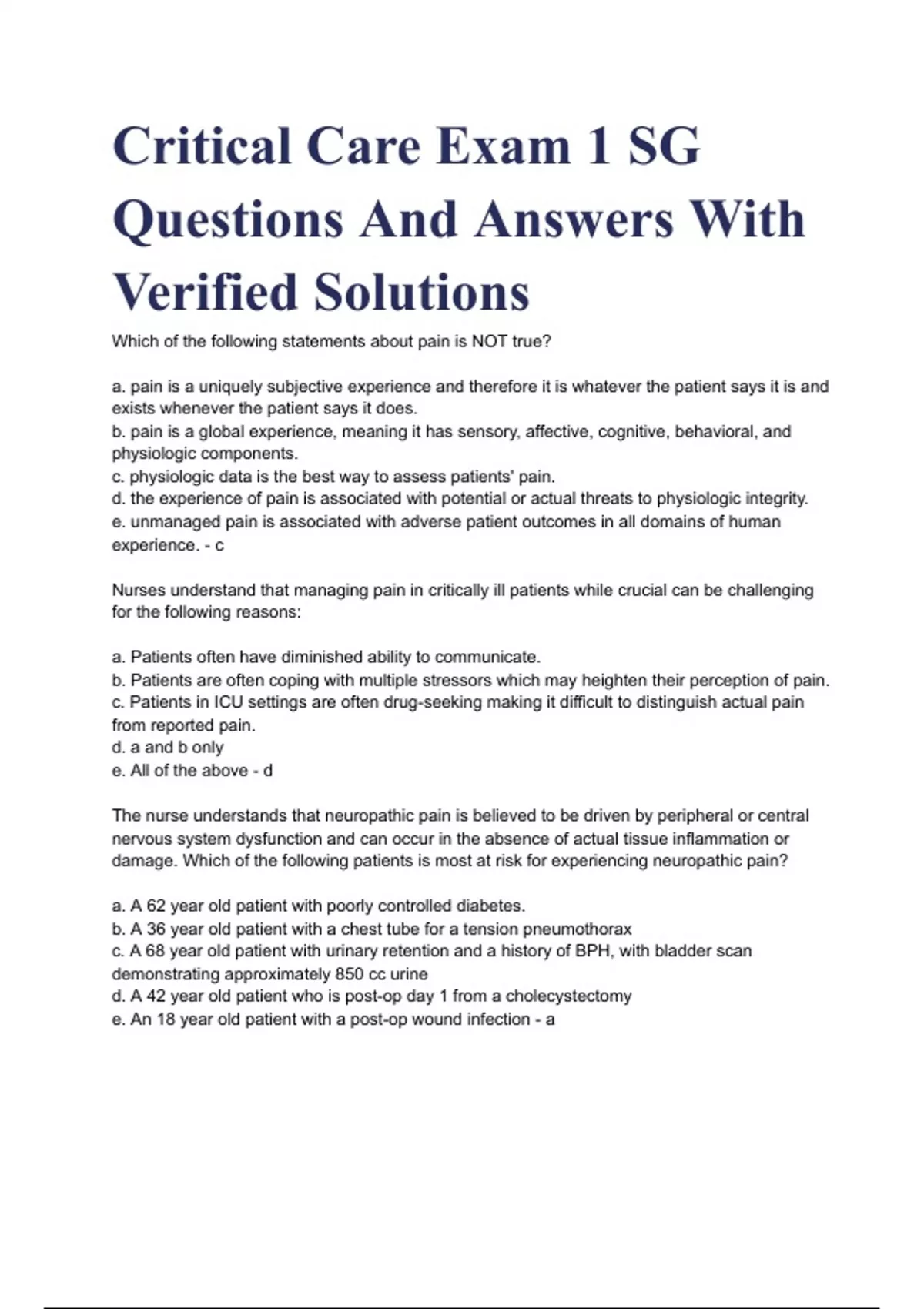 Critical Care Exam 1 SG Questions And Answers With Verified Solutions