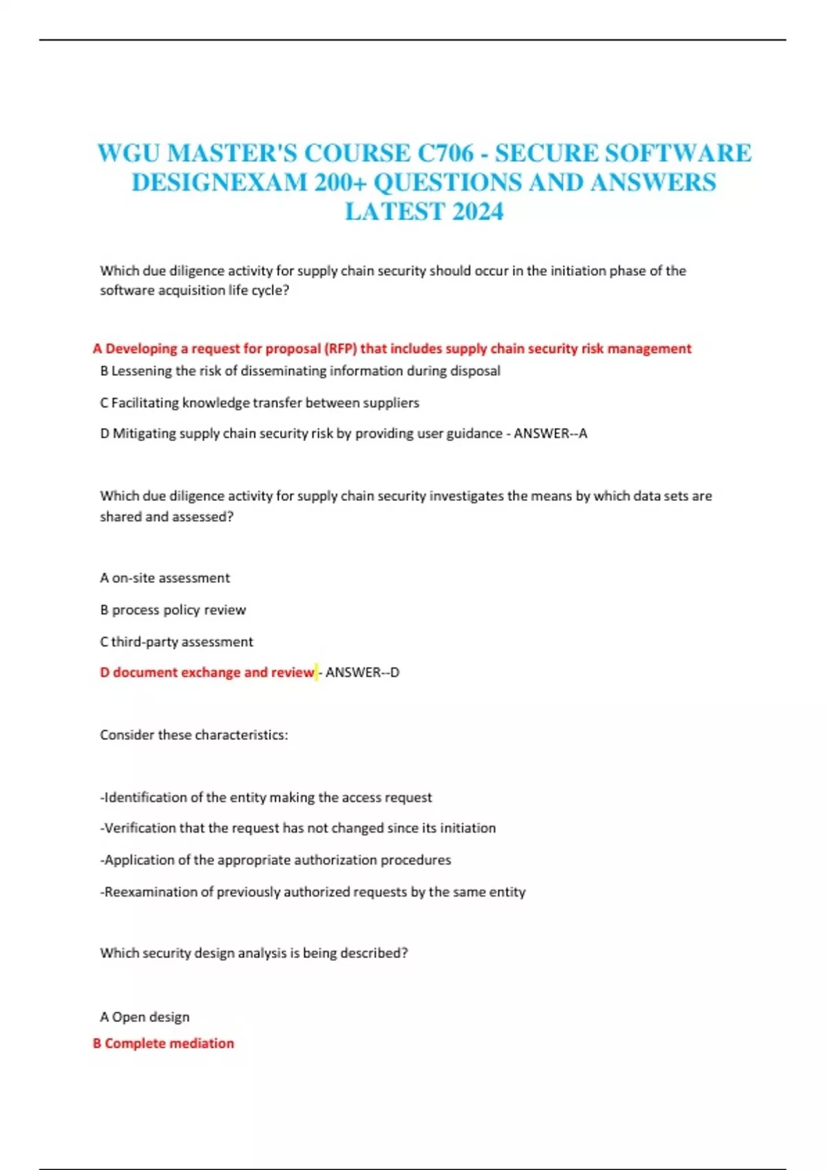 WGU MASTER'S COURSE C706 - SECURE SOFTWARE DESIGN EXAM 200+ QUESTIONS AND ANSWERS LATEST 2024