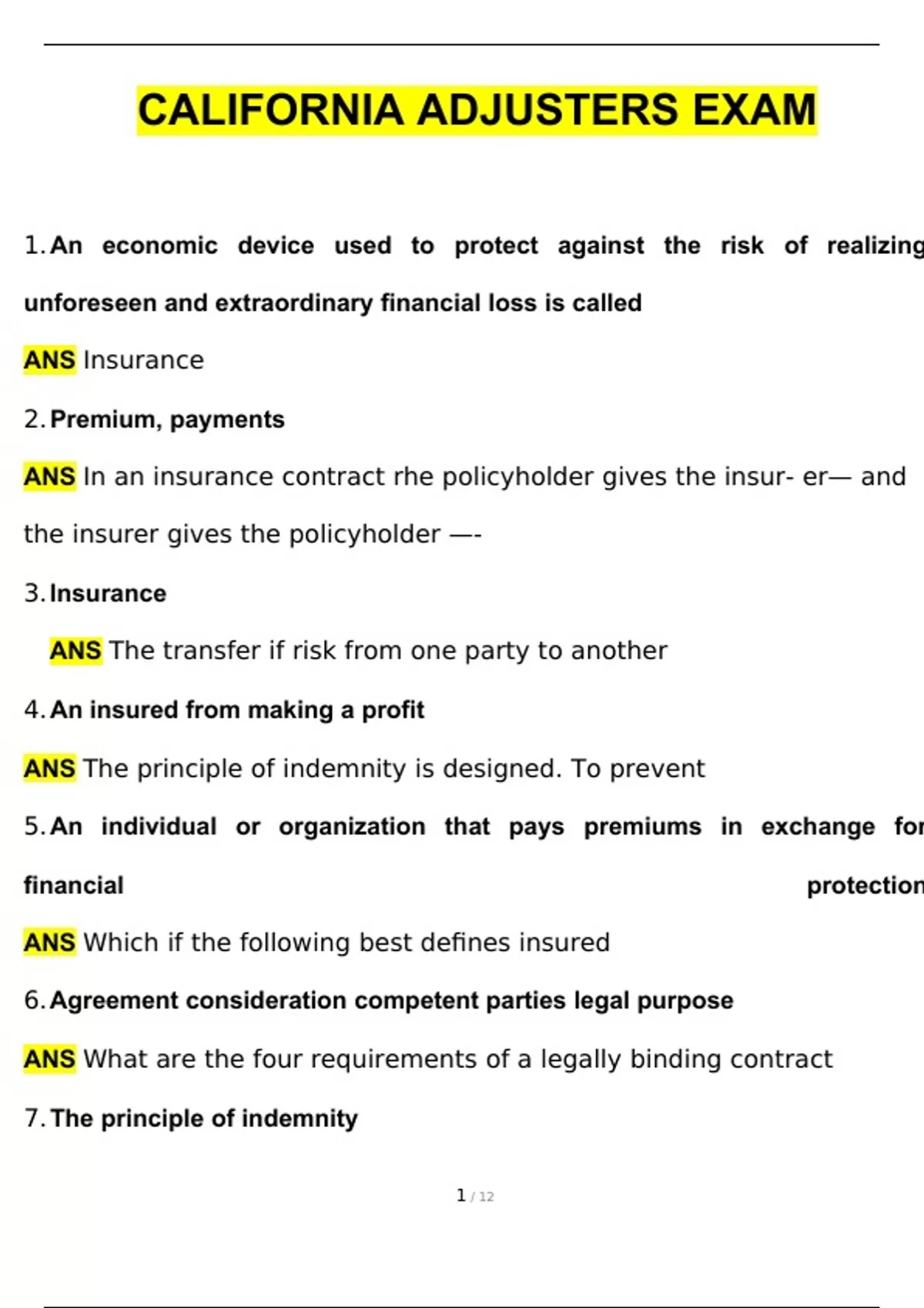 California Adjusters Exam Questions with 100% Correct Answers | Updated & Verified