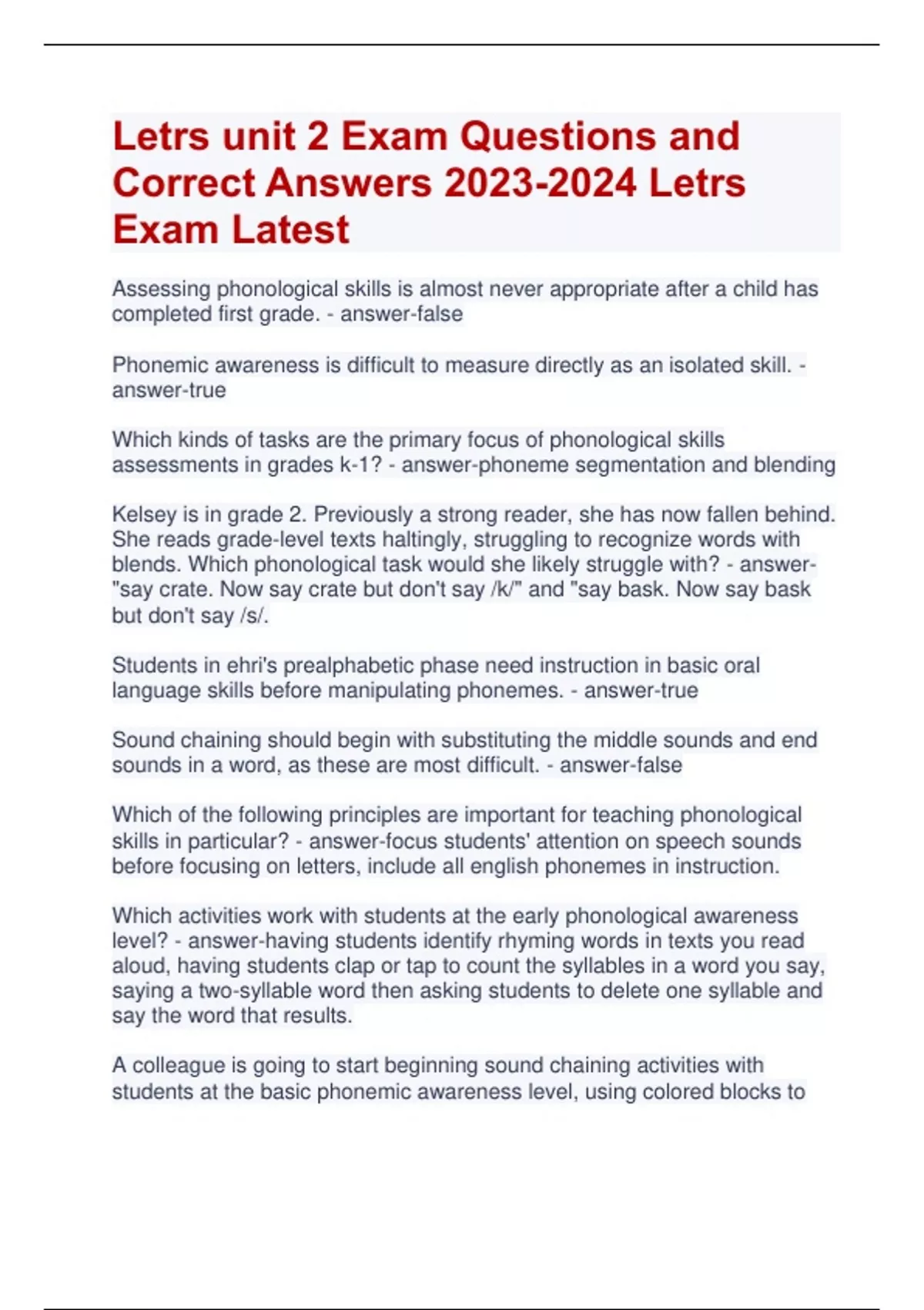 Letrs unit 2 Exam Questions and Correct Answers Letrs Exam Latest