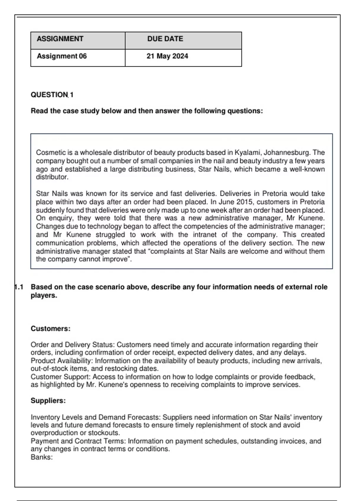 1.1 Based on the case scenario above, describe any four information needs of external role