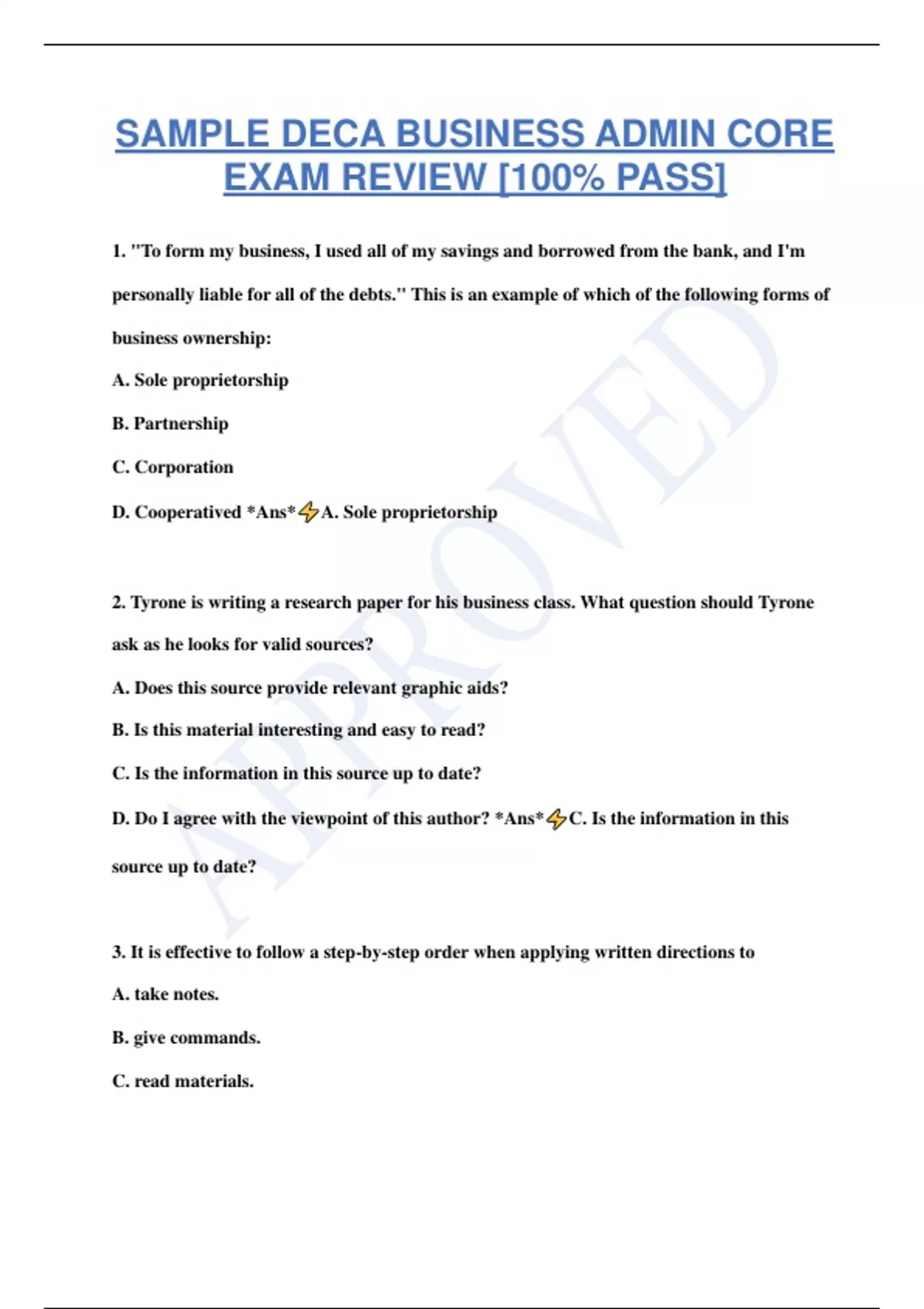 SAMPLE DECA BUSINESS ADMIN CORE EXAM REVIEW [100% PASS] 1. "To form my business, I used all of my savings and borrowed from the bank, and I'm personally liable for all of the debts." This is an example of which of the following forms of business ownership: A. Sole proprietorship B. Partnership C. Corporation D. Cooperatived *Ans* A. Sole proprietorship 2. Tyrone is writing a research paper for his business class. What question should Tyrone ask as he looks for valid sources? A. Does this source provide relevant graphic aids? B. Is this material interesting and easy to read? C. Is the information in this source up to date? D. Do I agree with the viewpoint of this author? *Ans* C. Is the information in this source up to date? 3. It is effective to follow a step-by-step order when applying written directions to A. take notes. B. give commands. C. read materials. D. achieve tasks. *Ans* D. achieve tasks. 4. Emma's teacher is giving directions for an essay test in class. Emma should A. avoid looking her teacher in the eye while directions are being given. B. pay close attention to the teacher while directions are being given. C. interrupt her teacher whenever she has a question. D. get a head start on her test while the teacher is giving directions. *Ans* B. pay close attention to the teacher while directions are being given. 5. Megan is working with a group member who's explaining her part of a project. Megan wants to make sure her group member knows she's listening, so she says things like, "I see," "Okay," and "I understand." Which active listening skill is Megan demonstrating: A. Paraphrasing the message to test her understanding B. Repeating critical information C. Using a verbal acknowledgment response D. Collecting all the information possible *Ans* C. Using a verbal acknowledgement response 6. Which of the following is a way that you can use non verbal communication to express your approval of an idea: A. Making a fist B. Folding your arms C. Smiling broadly