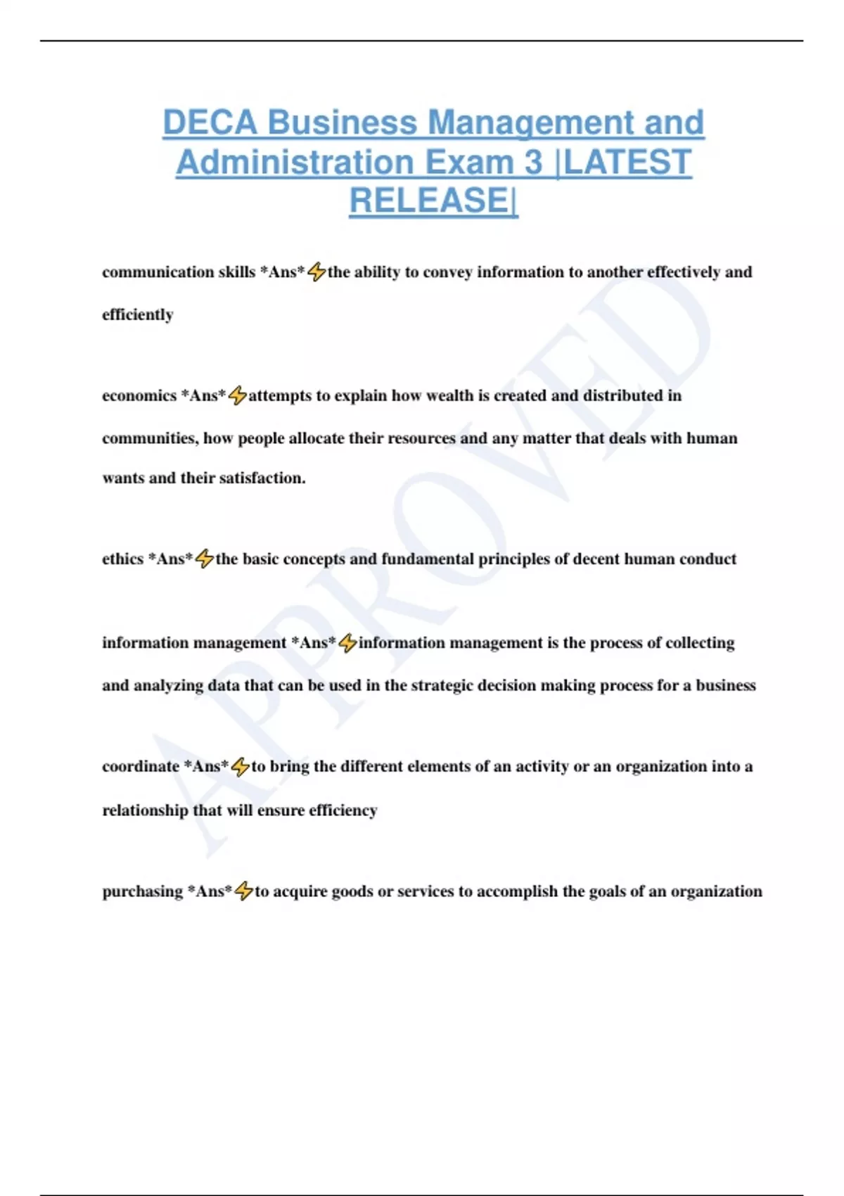 DECA Business Management and Administration Exam 3 |LATEST RELEASE| communication skills *Ans* the ability to convey information to another effectively and efficiently economics *Ans* attempts to explain how wealth is created and distributed in communities, how people allocate their resources and any matter that deals with human wants and their satisfaction. ethics *Ans* the basic concepts and fundamental principles of decent human conduct information management *Ans* information management is the process of collecting and analyzing data that can be used in the strategic decision making process for a business coordinate *Ans* to bring the different elements of an activity or an organization into a relationship that will ensure efficiency purchasing *Ans* to acquire goods or services to accomplish the goals of an organization chain of command *Ans* the order in which authority and power in an organization is delegated from top management to every employee at every level of the organization organization goals *Ans* the overall objectives, purpose and mission of a business that have been established by its management and communicated to its employees project *Ans* planned set of interrelated tasks to be executed over a fixed period and within certain cost and other limitations channels *Ans* the path through which messages are delivered tariff *Ans* a tax on imports commitments *Ans* detailed examination of the elements or structure of something, typically as a basis for discussion or interpretation prioritize *Ans* a process that evaluates a group of items and ranks them in their order of importance or urgency purchase order *Ans* a legal contract between a buyer and seller that describes the