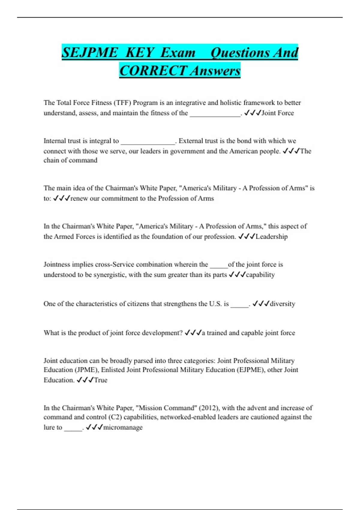 The Total Force Fitness (TFF) Program is an integrative and holistic framework to better understand, assess, and maintain the fitness of the ______________. Joint Force Internal trust is integral to _______________. External trust is the bond with which we connect with those we serve, our leaders in government and the American people. The chain of command The main idea of the Chairman's White Paper, "America's Military - A Profession of Arms" is to: renew our commitment to the Profession of Arms In the Chairman's White Paper, "America's Military - A Profession of Arms," this aspect of the Armed Forces is identified as the foundation of our profession. Leadership Jointness implies cross-Service combination wherein the _____of the joint force is understood to be synergistic, with the sum greater than its parts capability