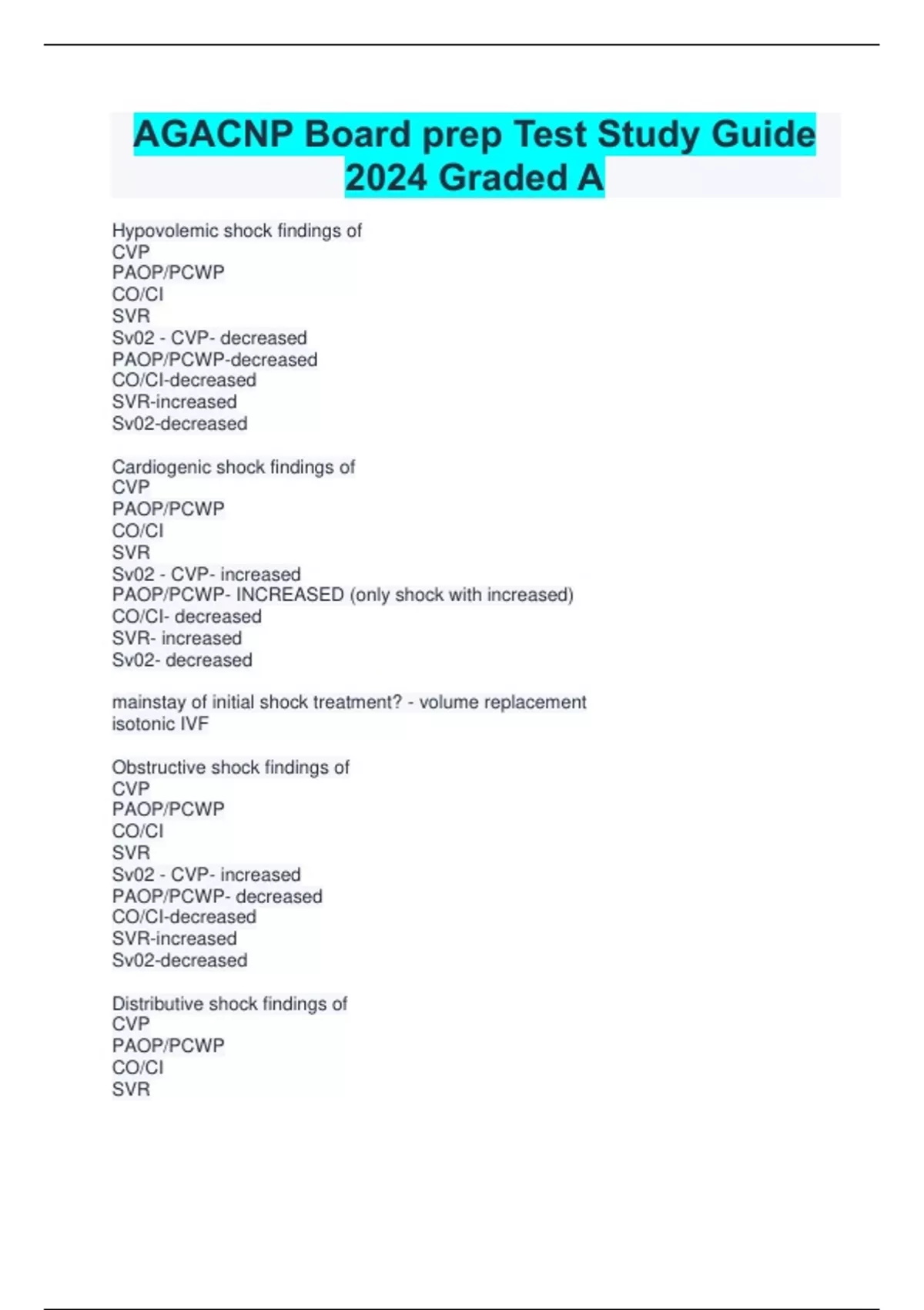 Hypovolemic shock findings of CVP PAOP/PCWP CO/CI SVR Sv02 - CVP- decreased PAOP/PCWP-decreased CO/CI-decreased SVR-increased Sv02-decreased Cardiogenic shock findings of CVP PAOP/PCWP CO/CI SVR Sv02 - CVP- increased PAOP/PCWP- INCREASED (only shock with increased) CO/CI- decreased SVR- increased Sv02- decreased mainstay of initial shock treatment? - volume replacement isotonic IVF Obstructive shock findings of CVP PAOP/PCWP CO/CI SVR Sv02 - CVP- increased PAOP/PCWP- decreased CO/CI-decreased SVR-increased Sv02-decreased Distributive shock findings of CVP PAOP/PCWP CO/CI SVR Sv02 - ALL DECREASED CVP- decreased PAOP/PCWP- decreased CO/CI-decreased SVR-decreased Sv02-decreased Triad of treatment for distributive shock? - #1 epinephrine glucorticoids antihistamine Septic shock findings during HYPERDYNAMIC *warm* shock CVP PAOP/PCWP CO/CI SVR Sv02 - CVP- increased PAOP/PCWP-normal CO/CI-increased SVR-slightly decreased Sv02- increased SEPTIC shock findings of HYPODYNAMIC *cold* shock CVP PAOP/PCWP CO/CI SVR Sv02 - ALL DECREASED CVP- decreased PAOP/PCWP-decreased CO/CI-decreased SVR-decreased Sv02-decreased or increased Normal SVR - 900-1400 dynes/sec/cm5 Normal CI - 2.5-4.2 L/min/m2 Normal PAOP (wedge) pressure - 8-12 mm Hg What shows resuscitation for septic shock? - lactic acid <2 What is the parkland formula? - Fluids for first 24hrs = 4ml x kg x %TBSA 50% over 8hrs 50% over next 16hrs how do you ensure tissue perfusion in burn patient? - maintain urinary output of 0.5ml/kg/hr What is the rule of 9's with burns? - -head and neck 9% -upper limbs 9% each -trunk 36% -genitalia 1% -lower limbs 18% each Patient is NPO due to aspiration risk and presents with need for nutritional support for <6weeks inpatient, what type of tube should you anticipate using? - duodenal tube Patient is NPO and plan for >6weeks of nutritional support (long term) is needed, what type of feeding tube? - enterostomal tube If you cannot use the gut for nutritional support, what is used in <2week nutritional support needed? What is used if >2 week nutritional support is needed? - A. PPN B. TPN Normal WBC? - 5,000-11,000 Normal neutrophils - 56-67% normal eosinophil count? - 1-3% normal lymphocytes - 22-33% Firstline antibiotic for uncomplicated UTI? - sulfamethozazole/trimethoprim (bactrim) 1 tab BID x3 days or Macrobid 100mg BID x5 days Firstline antibiotic for complicated UTI? - Cipro 500mg PO BID or 400mg IV q12hr or Levofloxacin 750mg PO or IV 7-14 days Abx for high risk UTI that is complicated? - -invanz 1g iv daily -zosyn 3.375 iv Q6hr cefepime 2g iv q12hr Normal serum sodium? - 135-145 mEq/L Normal serum osmolality - 275-295 mOsm/kg