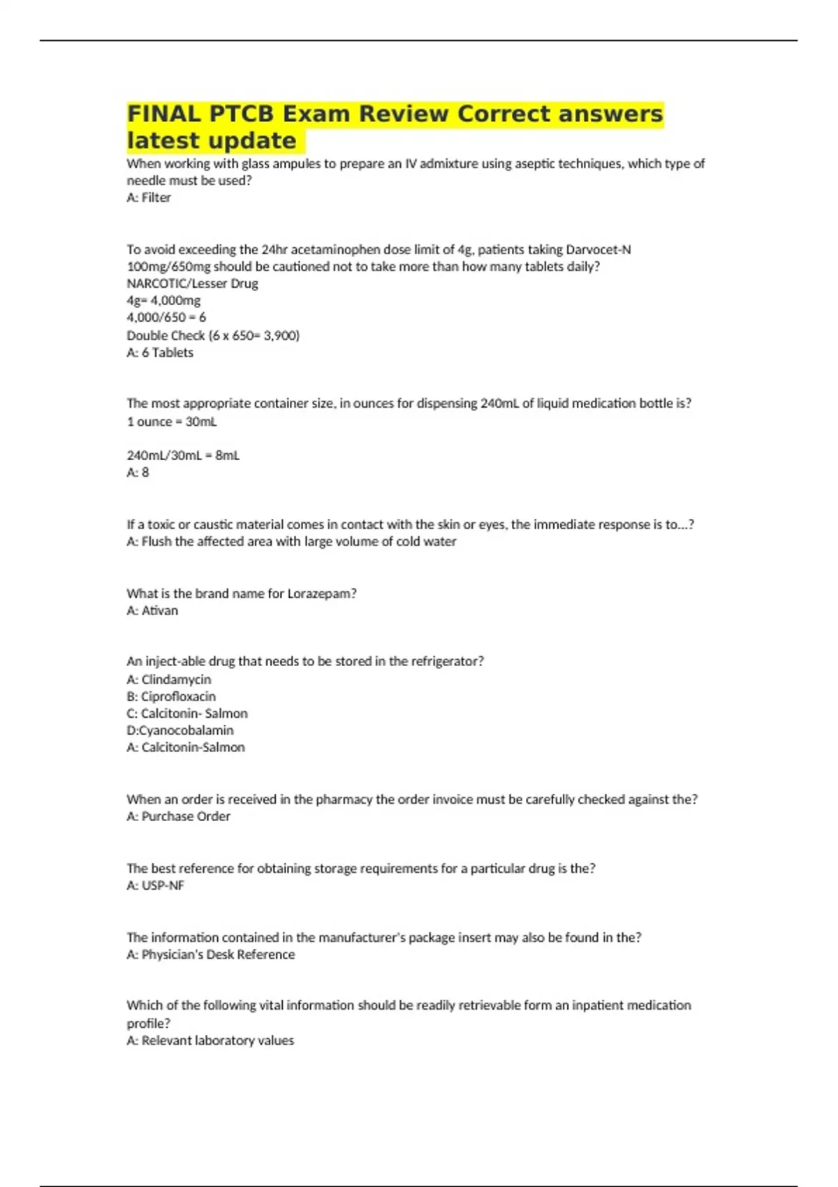 FINAL PTCB Exam Review Correct answers latest update When working with glass ampules to prepare an IV admixture using aseptic techniques, which type of needle must be used? A: Filter To avoid exceeding the 24hr acetaminophen dose limit of 4g, patients taking Darvocet-N 100mg/650mg should be cautioned not to take more than how many tablets daily? NARCOTIC/Lesser Drug 4g= 4,000mg 4,000/650 = 6 Double Check (6 x 650= 3,900) A: 6 Tablets The most appropriate container size, in ounces for dispensing 240mL of liquid medication bottle is? 1 ounce = 30mL 240mL/30mL = 8mL A: 8 If a toxic or caustic material comes in contact with the skin or eyes, the immediate response is to...? A: Flush the affected area with large volume of cold water What is the brand name for Lorazepam? A: Ativan An inject-able drug that needs to be stored in the refrigerator? A: Clindamycin B: Ciprofloxacin C: Calcitonin- Salmon D:Cyanocobalamin A: Calcitonin-Salmon When an order is received in the pharmacy the order invoice must be carefully checked against the? A: Purchase Order The best reference for obtaining storage requirements for a particular drug is the? A: USP-NF The information contained in the manufacturer's package insert may also be found in the? A: Physician's Desk Reference Which of the following vital information should be readily retrievable form an inpatient medication profile? A: Relevant laboratory values What regulation establishes federal protections for the privacy of protected health information? A: HIPPA A prescription reads, "Percodan tablets, dispense 120, take 1 tablet by mouth every 6 hours as needed for back pain." The technician should....? Percodan (Oxycodone/Aspirin): Treats pain. This medicine is a combination of a narcotic and a non-steroidal anti-inflammatory (NSAID) A: Fill the prescription as written. Coordination of benefits is used when a patient has...? A: A primary and secondary insurance. (Coordination of benefits... which insurance can be used 1stly or 2ndly) Which is a calcium channel blocker? A: Nitroglycerin B: Ramipril C:Atenolol D: Dilitazem A: Dilitazem According to the DEA, all records related to controlled substances must be maintained and be available for inspection for a minimum of ___ years? A: 2 years The form used to report theft or significant loss of controlled substances is? A: DEA106 An outpatient prescription requires which of the following? A: Medication lot number B: Physician's phone number and address C:Pharmacy's address and phone number D: Medical Conditions A: Physician's phone number and adress Concerning needle capping which is correct? A: Used insulin needles are small enough that they can be disposed of in regular garbage B: Used immunization needles should be recapped before being placed in the sharps container C: Used immunization needles should never be recapped D: Insulin needs are small enough that they can safely be recapped before being thrown away in the sharps container A: Used immunization needles should never be recapped Anti neoplastic medications should be prepared in what type of hood? ANTINEOPLASTIC. : inhibiting or preventing the growth and spread of tumors or malignant cells. A: Biological (negative pressure/ vertical hood) For a pharmacy tech assigned to stock replenishment, which item would be considered a high alert medication? A:Ipratropium bromide inhilation solution 0.02% 2.5mL vials B: Potassium chloride injection 10mEq/5mL 30mL vial C: Epinephrine 0.1% syringes D: 5% Dextrose and 0.45% sodium chloride injection USP 500mL High-Alert Medications: cause harm more commonly and the harm they produce is likely to be more serious and leads to patient suffering and additional costs associated with care of these patients. A: Potassium chloride injection 10mEq/5mL 30mL vial According to the Institute for Safe Medication Practices (ISMP), abbreviations used during prescription writing..? A: Are no longer accaptable B:Improve entry time C: Are prone to errors D Facilitate the prescriber A: Are prone to errors The last two digits of an NDC number indicates the...? A: Package Size How much dextrose, in grams, is contained in 1,000mL of D10W? A:1 B:100 C:10 D: 1,000 D10W= Dextrose 10% in Water -W/V- 10g/100 mL cross multiply Xg/1,000mL = 100 A: 100 An essential component of pharmacy quality assurance program is to? A: Maintain standards set by the DEA B: Get the right drug o the right patient at the right time C:Focus on the employee's work performance D: Provide adequate emergency stock level A: Get the right drug o the right patient at the right time A patient wants to transfer a prescription from the originating pharmacy to another pharmacy. The pharmacy tech should?: A: Call the receiving pharmacy and provide the necessary information to another pharmacist B: Inform the patient that it is illegal to transfer prescriptions C: Refer the patient to an on-duty pharmacist to process the transfer D: Accommodate the patient and process the transfer A: Refer the patient to an on-duty pharmacist to process the transfer A patient who is allergic to penicillin has a chance of cross sensitivity to which of the following medications?: A: Moxifloxacin B: Cephalexin C: Doxycycline D: Azithromycin A: Cephalexin What is the percentage concentration of a solution that contains 500mg/50mL?: A: 0.5% B: 1% C: 10% D: 5% 500mg/50mL Just divide = 10 A: 10% The generic name for Coumadin? A: Warfarin The requirement that a non-formulary medication be covered only if approved by the third party payer is called? A: Prior Authorization Before using a laminar flow hood, the interior surface should be cleaned with? A: 70% isopropyl alcohol The pharmacy tech receives a prescription for a patient that needs all their medications to be crushed. Which of the following would you alert to the pharmacist before entering the prescription? A: Potassium 10mg dispersible tablet B: Furosemide 40mg tablet C: Metoformin 500mg sustained action tablet D: Oxybutynin immediate release 5