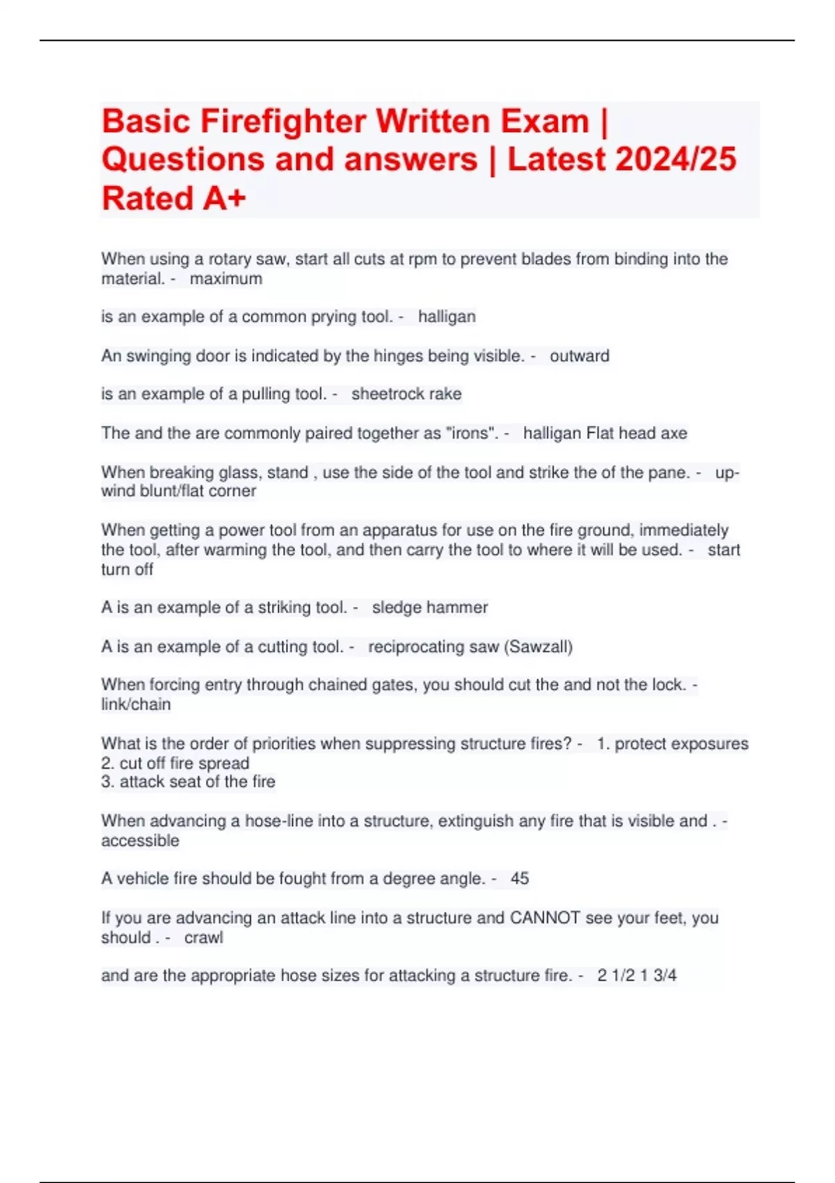 Basic Firefighter Written Exam | Questions and answers | Latest 2024/25 Rated A+