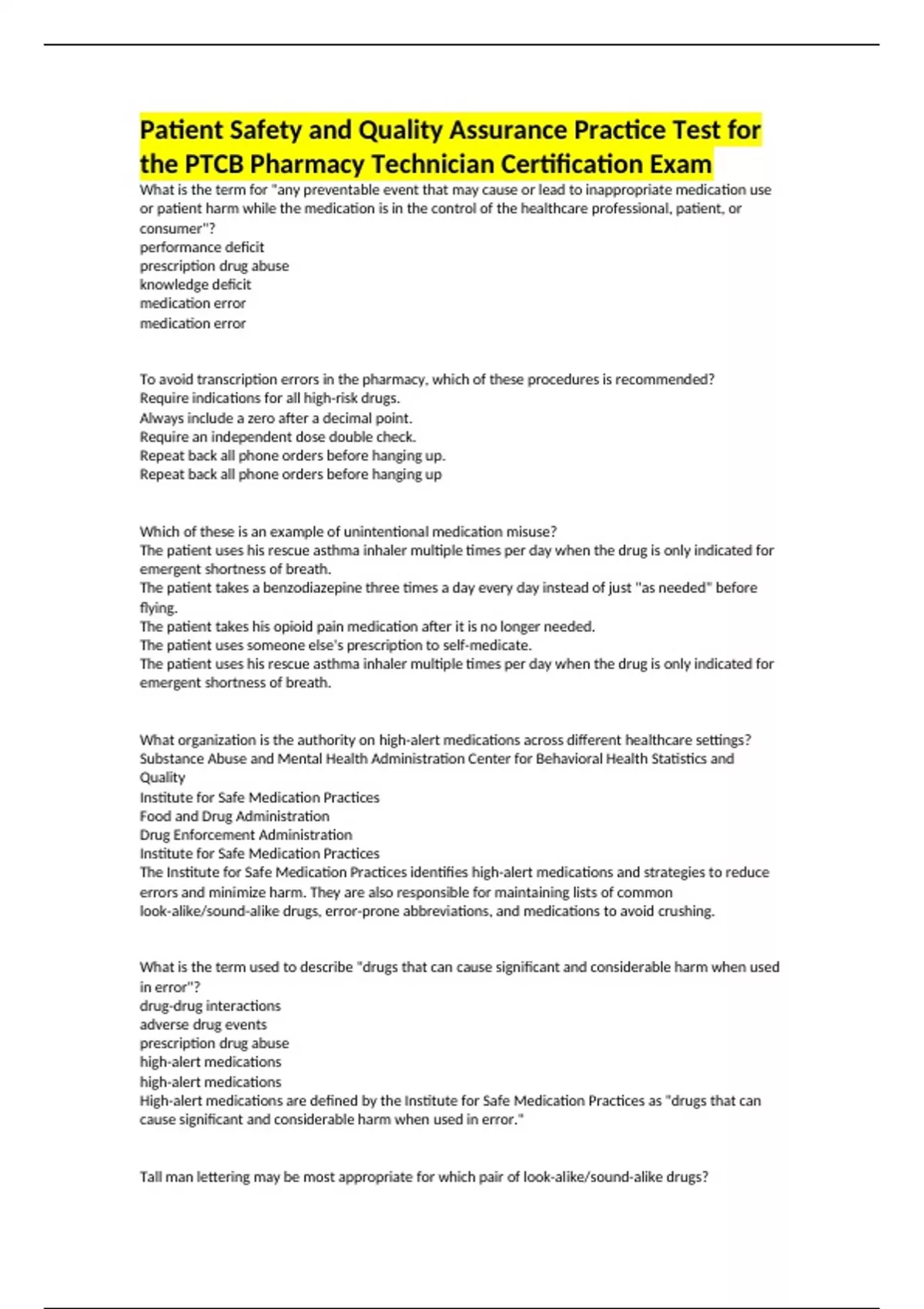 Patient Safety and Quality Assurance Practice Test for the PTCB Pharmacy Technician Certification Exam What is the term for "any preventable event that may cause or lead to inappropriate medication use or patient harm while the medication is in the control of the healthcare professional, patient, or consumer"? performance deficit prescription drug abuse knowledge deficit medication error medication error To avoid transcription errors in the pharmacy, which of these procedures is recommended? Require indications for all high-risk drugs. Always include a zero after a decimal point. Require an independent dose double check. Repeat back all phone orders before hanging up. Repeat back all phone orders before hanging up Which of these is an example of unintentional medication misuse? The patient uses his rescue asthma inhaler multiple times per day when the drug is only indicated for emergent shortness of breath. The patient takes a benzodiazepine three times a day every day instead of just "as needed" before flying. The patient takes his opioid pain medication after it is no longer needed. The patient uses someone else's prescription to self-medicate. The patient uses his rescue asthma inhaler multiple times per day when the drug is only indicated for emergent shortness of breath. What organization is the authority on high-alert medications across different healthcare settings? Substance Abuse and Mental Health Administration Center for Behavioral Health Statistics and Quality Institute for Safe Medication Practices Food and Drug Administration Drug Enforcement Administration Institute for Safe Medication Practices The Institute for Safe Medication Practices identifies high-alert medications and strategies to reduce errors and minimize harm. They are also responsible for maintaining lists of common look-alike/sound-alike drugs, error-prone abbreviations, and medications to avoid crushing. What is the term used to describe "drugs that can cause significant and considerable harm when used in error"? drug-drug interactions adverse drug events prescription drug abuse high-alert medications high-alert medications High-alert medications are defined by the Institute for Safe Medication Practices as "drugs that can cause significant and considerable harm when used in error." Tall man lettering may be most appropriate for which pair of look-alike/sound-alike drugs? metoprolol/omeprazole digoxin/warfarin ritonavir/rapaglinide hydralazine/hydroxyzine hydralazine/hydroxyzine Which of these scenarios represents a potential prescriber error? bypass of bar-coded medication administration system illegible handwriting use of floor stock instead of unit dose medications borrowed medications from another patient illegible handwriting Which of these medication orders is most appropriate to use? Take one tablet by mouth daily. 1 tab per os qd. Tk 1 tab PO QD. Take one tab qd. Take one tablet by mouth daily. Which of these includes a trailing zero? 0.5 5.2 500 5.0 5.0 For whole numbers, trailing zeros (e.g., 5.0) should be avoided because it could result in a 10-fold increase in the dose if the period is mistakenly overlooked. Instead, this should have been written simply as "5." The other options are examples of appropriate use of zeros and/or decimal points. Report a problem Which of these medication orders is most appropriate to use? 10 mg twice daily. Take 10 mg by mouth twice daily. Take 10 mg per os twice daily. Take 10.0 mg PO BID. Take 10 mg by mouth twice daily. Which of these notations is on the Institute for Safe Medication Practice's list of error-prone abbreviations, symbols, and dose designations? PO daily un HS HS "HS" may be interpreted to mean "half strength" or "bedtime"; as such, it is most appropriate to write out the term intended. Which of these notations is on the Institute for Safe Medication Practice's list of error-prone abbreviations, symbols, and dose designations? mL