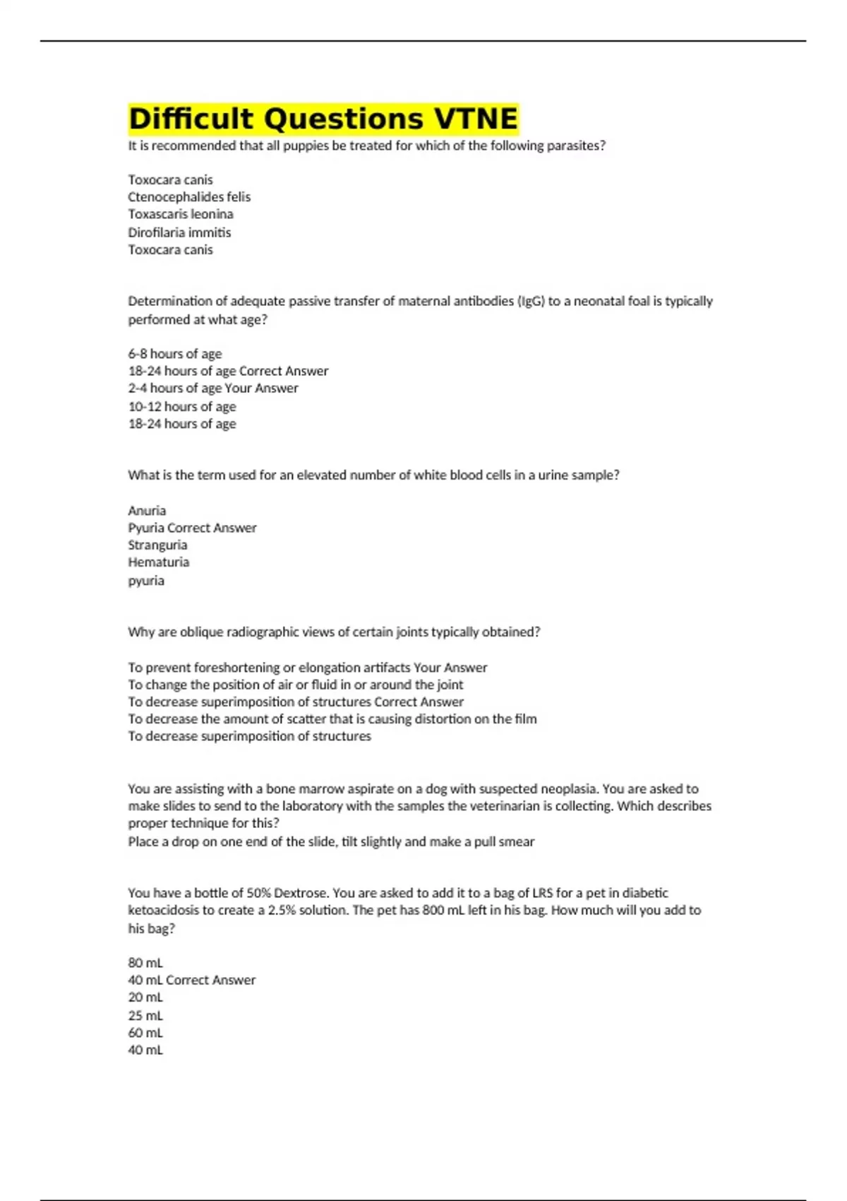 Difficult Questions VTNE It is recommended that all puppies be treated for which of the following parasites? Toxocara canis Ctenocephalides felis Toxascaris leonina Dirofilaria immitis Toxocara canis Determination of adequate passive transfer of maternal antibodies (IgG) to a neonatal foal is typically performed at what age? 6-8 hours of age 18-24 hours of age Correct Answer 2-4 hours of age Your Answer 10-12 hours of age 18-24 hours of age What is the term used for an elevated number of white blood cells in a urine sample? Anuria Pyuria Correct Answer Stranguria Hematuria pyuria Why are oblique radiographic views of certain joints typically obtained? To prevent foreshortening or elongation artifacts Your Answer To change the position of air or fluid in or around the joint To decrease superimposition of structures Correct Answer To decrease the amount of scatter that is causing distortion on the film To decrease superimposition of structures You are assisting with a bone marrow aspirate on a dog with suspected neoplasia. You are asked to make slides to send to the laboratory with the samples the veterinarian is collecting. Which describes proper technique for this? Place a drop on one end of the slide, tilt slightly and make a pull smear You have a bottle of 50% Dextrose. You are asked to add it to a bag of LRS for a pet in diabetic ketoacidosis to create a 2.5% solution. The pet has 800 mL left in his bag. How much will you add to his bag? 80 mL 40 mL Correct Answer 20 mL 25 mL 60 mL 40 mL Which of the following disorders is caused by a Type IV hypersensitivity, also known as delayed type hypersensitivity, as a result of a T-cell response to an antigen? Autoimmune hemolytic anemia Contact allergy to plastic Correct Answer Atopy Glomerulonephritis Contact allergy to plastic Where is the thymus located? In the brain In the cranial mediastinum in the chest Correct Answer Ventral neck region Your Answer In the abdomen just above the kidneys In the cranial mediastinum in the chest Determination of adequate passive transfer of maternal antibodies (IgG) to a neonatal foal is typically performed at what age? 18-24 hours of age Correct Answer 6-8 hours of age 2-4 hours of age Your Answer 10-12 hours of age 18-24 hours of age Which of the following lymph nodes are not palpated peripherally? Mandibular Your Answer Perihilar Correct Answer Prescapular Popliteal perihilar The veterinarian asks you to retrieve a psittacine bird out of its cage for examination. Which of the following restraint tools would be least recommended for this type of bird? Wash cloth Protective falconry gloves Correct Answer Net Towel Protective falconry gloves What is the cause of hip dysplasia? It is a multifactorial disease Correct Answer Genetics Your Answer Environment Poor diet Breed conformation It is a multifactorial disease How many milliliters of 25% dextrose should be added to 1 L of 0.9% saline to make a 5% dextrose solution? 200 ml Correct Answer 100 ml 20 ml Your Answer 50 m 200ml Which vessel should be avoided when performing venipuncture in pigs? Tail vein Left jugular vein Correct Answer Auricular vein Your Answer Right cranial vena cava Left jugular vein Which feline disease is most commonly transmitted via saliva sharing, such as through food or water bowls, grooming, etc.? Feline Infectious Peritonitis Toxoplasma Feline Immunodeficiency Virus Your Answer Feline Leukemia Virus Correct Answer Feline Leukemia Virus `Which of the following drugs can induce muscle rigidity, or a cataleptic state, during anesthesia? Diazepam Your Answer Acepromazine Propofol Ketamine Correct Answer ketamine Which method is most useful for looking for Otodectes? Knott's method Your Answer Sedi-stain Hematoxylin and Eosin stain Mineral oil swab slide Correct Answer They are visible with the naked eye Mineral oil swab slide Which of the following statements is NOT included in NAVTA's Code of Ethics for the Profession of Veterinary Technology? Aid society and animals through providing excellent care and services for animals. Safeguard the public and the profession against individuals deficient in professional competence or ethics. Your Answer