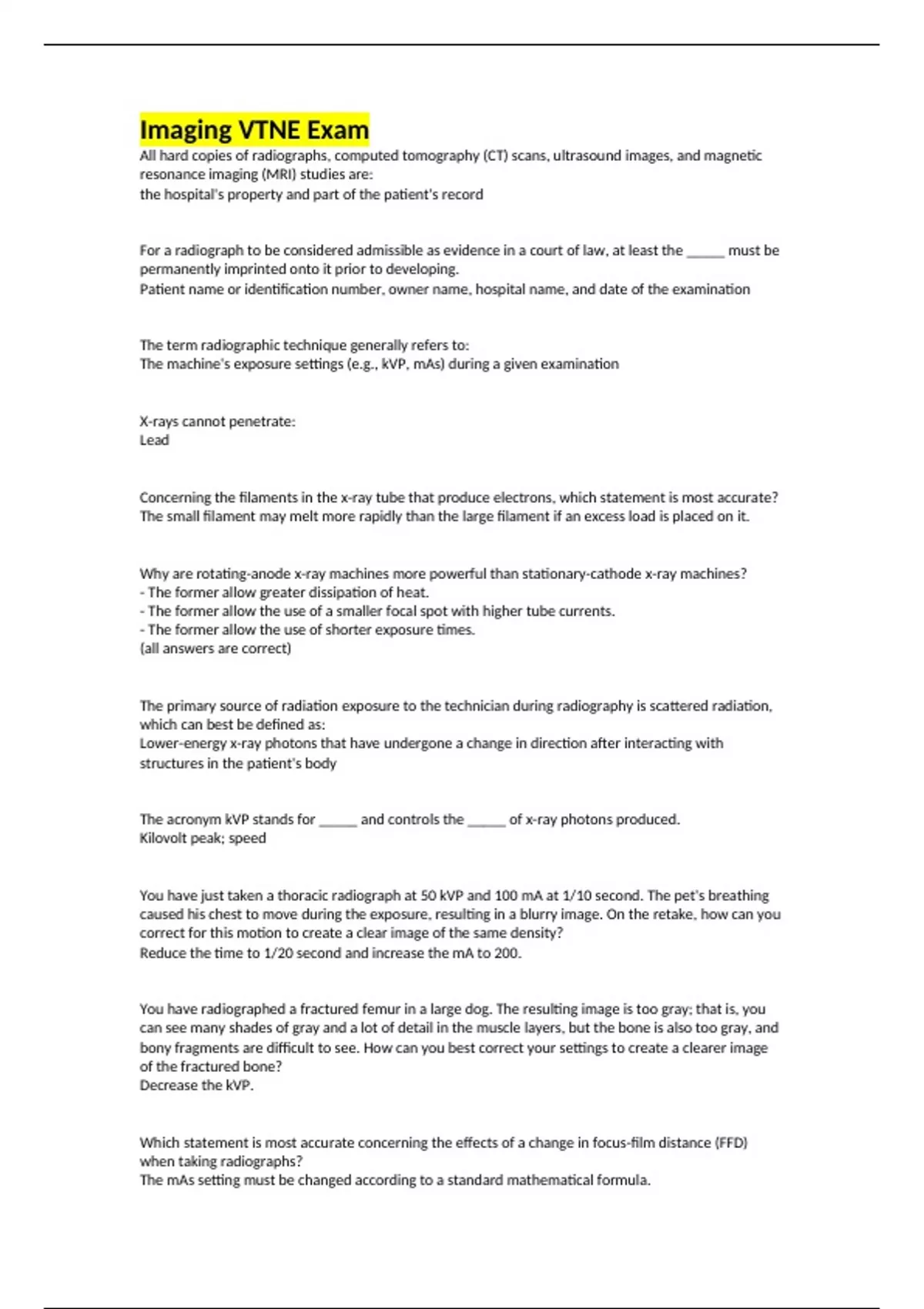 Imaging VTNE Exam All hard copies of radiographs, computed tomography (CT) scans, ultrasound images, and magnetic resonance imaging (MRI) studies are: the hospital's property and part of the patient's record For a radiograph to be considered admissible as evidence in a court of law, at least the _____ must be permanently imprinted onto it prior to developing. Patient name or identification number, owner name, hospital name, and date of the examination The term radiographic technique generally refers to: The machine's exposure settings (e.g., kVP, mAs) during a given examination X-rays cannot penetrate: Lead Concerning the filaments in the x-ray tube that produce electrons, which statement is most accurate? The small filament may melt more rapidly than the large filament if an excess load is placed on it. Why are rotating-anode x-ray machines more powerful than stationary-cathode x-ray machines? - The former allow greater dissipation of heat. - The former allow the use of a smaller focal spot with higher tube currents. - The former allow the use of shorter exposure times. (all answers are correct) The primary source of radiation exposure to the technician during radiography is scattered radiation, which can best be defined as: Lower-energy x-ray photons that have undergone a change in direction after interacting with structures in the patient's body The acronym kVP stands for _____ and controls the _____ of x-ray photons produced. Kilovolt peak; speed You have just taken a thoracic radiograph at 50 kVP and 100 mA at 1/10 second. The pet's breathing caused his chest to move during the exposure, resulting in a blurry image. On the retake, how can you correct for this motion to create a clear image of the same density? Reduce the time to 1/20 second and increase the mA to 200. You have radiographed a fractured femur in a large dog. The resulting image is too gray; that is, you can see many shades of gray and a lot of detail in the muscle layers, but the bone is also too gray, and bony fragments are difficult to see. How can you best correct your settings to create a clearer image of the fractured bone? Decrease the kVP. Which statement is most accurate concerning the effects of a change in focus-film distance (FFD) when taking radiographs? The mAs setting must be changed according to a standard mathematical formula. How does one obtain the correct machine settings when taking a radiograph? Settings are obtained from a "technique chart" created, by trial and error, specifically for the machine one is using. Concerning the use of film holders (cassettes) in veterinary radiography, which statement is most accurate? A "nonscreen" cassette is made of nonrigid cardboard or plastic and The most commonly used cassettes in companion-animal practice are rigid and contain an image-intensifying screen. Care of image-intensifying screens involves: Cleaning them with a special solution or 70% isopropyl alcohol at least once monthly or whenever screen artifacts are seen on a radiograph The purpose of a grid is to: Allow only the primary x-ray beam to pass through and prevent scattered radiation from reaching the film and Increase the resolution of thicker body parts. Most mistakes made in veterinary radiography are related to: Improper processing techniques Which statement concerning hand processing versus automatic-film processing of radiographs is most accurate? Both techniques require the use of fresh solutions and a well-ventilated darkroom. X-ray film recycling and special units attached to fixer tanks allow the recovery of _____, a valuable and reusable substance. Silver After exposing and developing an x-ray, you find the film totally white. What is the most likely cause of this problem? The film is unexposed. In a practice using automatic x-ray processing equipment, the veterinary technician is expected to Keep the processor clean and add fresh developer and fixer solutions as needed. What is necessary to prevent "fogging," or partial exposure, of x-ray film in the darkroom? - Absolutely no light leakage into the room - A lock on the door to prevent entrance during film processing - A safelight of correct wattage and filter type for the film used (all answers listed) Your small-animal technique chart says "use Potter-Bucky grid" for abdominal measurements of greater than 10 cm. What does this mean? Place the cassette on top of the table for measurements of less than or equal to 10 cm and in the tray underneath the table for those greater than 10 cm. Which diagnostic imaging method is best suited to the production of a continuous, moving image? Fluoroscopy A film badge that measures the amount of radiation to which veterinary personnel are exposed is best worn: Outside the lead apron on the collar at the level of the thyroid gland Which type of contrast media can be used for any type of contrast examination including oral, urogenital, intravenous, intraarterial, intrathecal, and in the respiratory tract? Insoluble, nonionic, radiopaque media such as iohexol The risk of life-threatening reactions necessitates the placement of intravenous catheters and constant patient monitoring when using radiographic contrast agents: Intravascularly or intrathecally Roentgens, rads, and rems are: Terms used to measure radiation exposure A technique in which a radiographic contrast agent is administered orally and a series of abdominal films taken immediately and at 15-, 30-, and 60-minute intervals until the contrast reaches the beginning of the large intestine is known as a: Upper gastrointestinal study Radiographic evaluation of the kidneys using contrast media intravenously is known as An intravenous pyelogram or IVP Which contrast agent should never be injected into the urinary bladder? Barium sulfate Myelography is used to evaluate the: Spinal cord Survey films are: Radiographs taken without the use of contrast media Concerning positioning animals for radiography, which statement is true? The primary beam shou