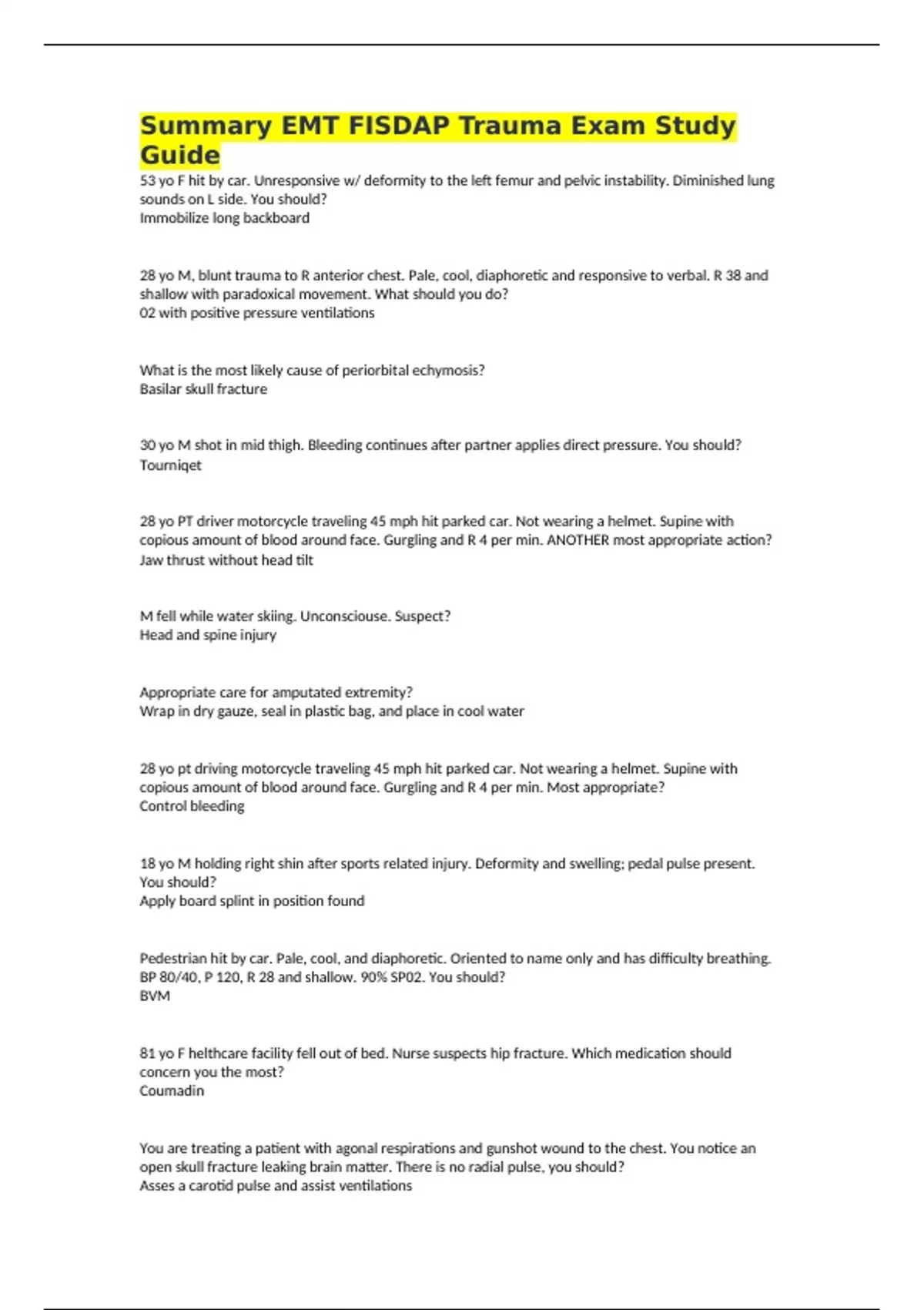 Summary EMT FISDAP Trauma Exam Study Guide 53 yo F hit by car. Unresponsive w/ deformity to the left femur and pelvic instability. Diminished lung sounds on L side. You should? Immobilize long backboard 28 yo M, blunt trauma to R anterior chest. Pale, cool, diaphoretic and responsive to verbal. R 38 and shallow with paradoxical movement. What should you do? 02 with positive pressure ventilations What is the most likely cause of periorbital echymosis? Basilar skull fracture 30 yo M shot in mid thigh. Bleeding continues after partner applies direct pressure. You should? Tourniqet 28 yo PT driver motorcycle traveling 45 mph hit parked car. Not wearing a helmet. Supine with copious amount of blood around face. Gurgling and R 4 per min. ANOTHER most appropriate action? Jaw thrust without head tilt M fell while water skiing. Unconsciouse. Suspect? Head and spine injury Appropriate care for amputated extremity? Wrap in dry gauze, seal in plastic bag, and place in cool water 28 yo pt driving motorcycle traveling 45 mph hit parked car. Not wearing a helmet. Supine with copious amount of blood around face. Gurgling and R 4 per min. Most appropriate? Control bleeding 18 yo M holding right shin after sports related injury. Deformity and swelling; pedal pulse present. You should? Apply board splint in position found Pedestrian hit by car. Pale, cool, and diaphoretic. Oriented to name only and has difficulty breathing. BP 80/40, P 120, R 28 and shallow. 90% SP02. You should? BVM 81 yo F helthcare facility fell out of bed. Nurse suspects hip fracture. Which medication should concern you the most? Coumadin You are treating a patient with agonal respirations and gunshot wound to the chest. You notice an open skull fracture leaking brain matter. There is no radial pulse, you should? Asses a carotid pulse and assist ventilations a 45 year old male fell asleep outisde while doing yard work. His face and lower legs are bright red with blisters and painful on examination. You should suspect Both superficial and partial thickness burns a 35 year old patient has fallen and has a deformed right lower leg. The distal extremity is pulsless and the skin is cool and cyanotic. You should Realign the injured extremity You arrive on scene of a car crash. The driver is alert and complaining of severe chest and abdominal pain. His radial is weak and rapid. Skin is cool, pale, and moist. The patient has a history of cardiac problems. You should? Rapidly extricate onto a long spinal board and transport 47 male shot in back has cool and clammy skin with arm weakness. BP 130/90, P 76, R 24. You should suspect Spinal cord injury Injury that is most likely to require routine assessment and transport Deformed Wrist Injury After securing pt on long board, you should immediately assess PMS 23 yo soccer player was kicked in the chest. He is alert with rapid, shallow R and complains of chest pain. Pale, cool, and wet. You should? Non Rebreather 25 yo in R distress after being stabbed in the chest. Blood is bubbling from 2 cm laceration to L chest wall. Lung sounds diminished on L side. You should? Apply occlusive dressing Early signs of decompensated shock? Low blood pressure Pt stabbed in RUQ. What organ is injured? Liver Pt with chemical burn on eye and is wearing contact lenses. You should? Remove contact lenses and administer irrigation solutions A baseball player was hit by a baseball in the left eye and complains for double vision. What should you do? Restrict spinal movement First concern with conscious pt who received partial thick burns to the face is treating? airway problems 22 yo F had an accident on moped. She is lying on ground; breathing well. Still wearing helmet. You should? Leave helmet in place while she is stabilized 32 yo M is unconscious after being struck in the head by a baseball bat. Has pulse but breathing is slow. Minor bleeding from a laceration at the left temple. Partner is maintaining manual C-spine stabilization. You should? Measure and apply a rigid c collar We have an expert-written solution to this problem! 28 yo M is fleeing from police and sustained 1 cm laceration shallow on forearm while climbing a rusted chain link fence. Refusing transport. What should you be concerned with? Infection Which is an open wound? abrasion Woman struck in face with softball bat. Unconscious. BP 74/50, P 60, R 8. What do you do? Insert an oral airway and admin 02 via BVM 21 yo football player hit from the side and landed head first onto the ground. Was ambulatory on scene and oriented to name only. Refusing transport and care. What should you do? Ask the team coach for assistance Pt is bruising around the eyes and behind ears. What should you suspect? Brasilar skull fracture Pt cut wrist. Wound is bleeding rapidly and is spurting with each heartbeat. Pt most likely severed? Artery Pt presents with pain and bruising to RUQ following motor vehicle collision. You should suspect injury to the? Liver 50 yo M has obvious deformed right lower leg after falling from the roof. You notice a tear in the skin over the deformity. What should you do? Realign and splint the leg 35 yo driver collided into telephone pole and is unconscious and unresponsive with severe bleeding in the mouth. You should? rapid extrication to long spine board