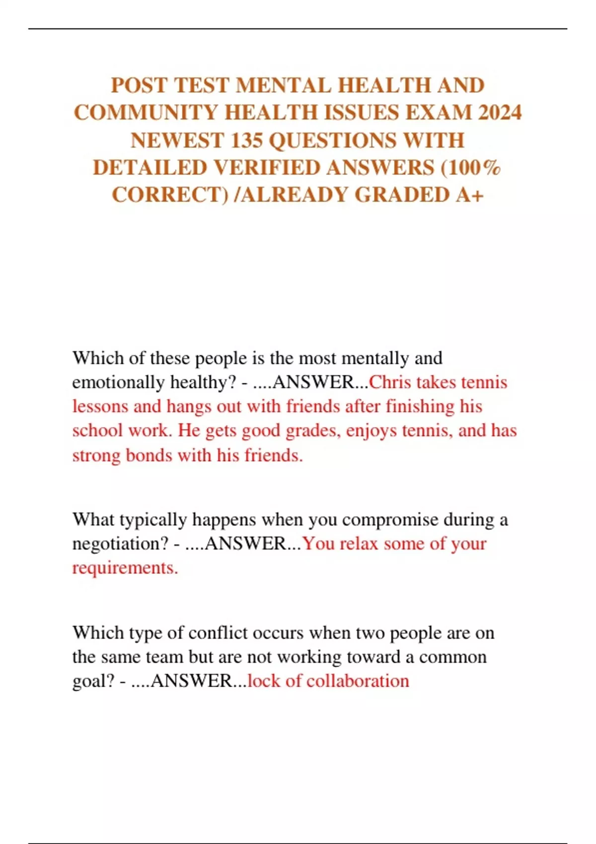POST TEST MENTAL HEALTH AND COMMUNITY HEALTH ISSUES EXAM 2024 NEWEST 135 QUESTIONS WITH DETAILED VERIFIED ANSWERS (100% CORRECT) /ALREADY GRADED A+