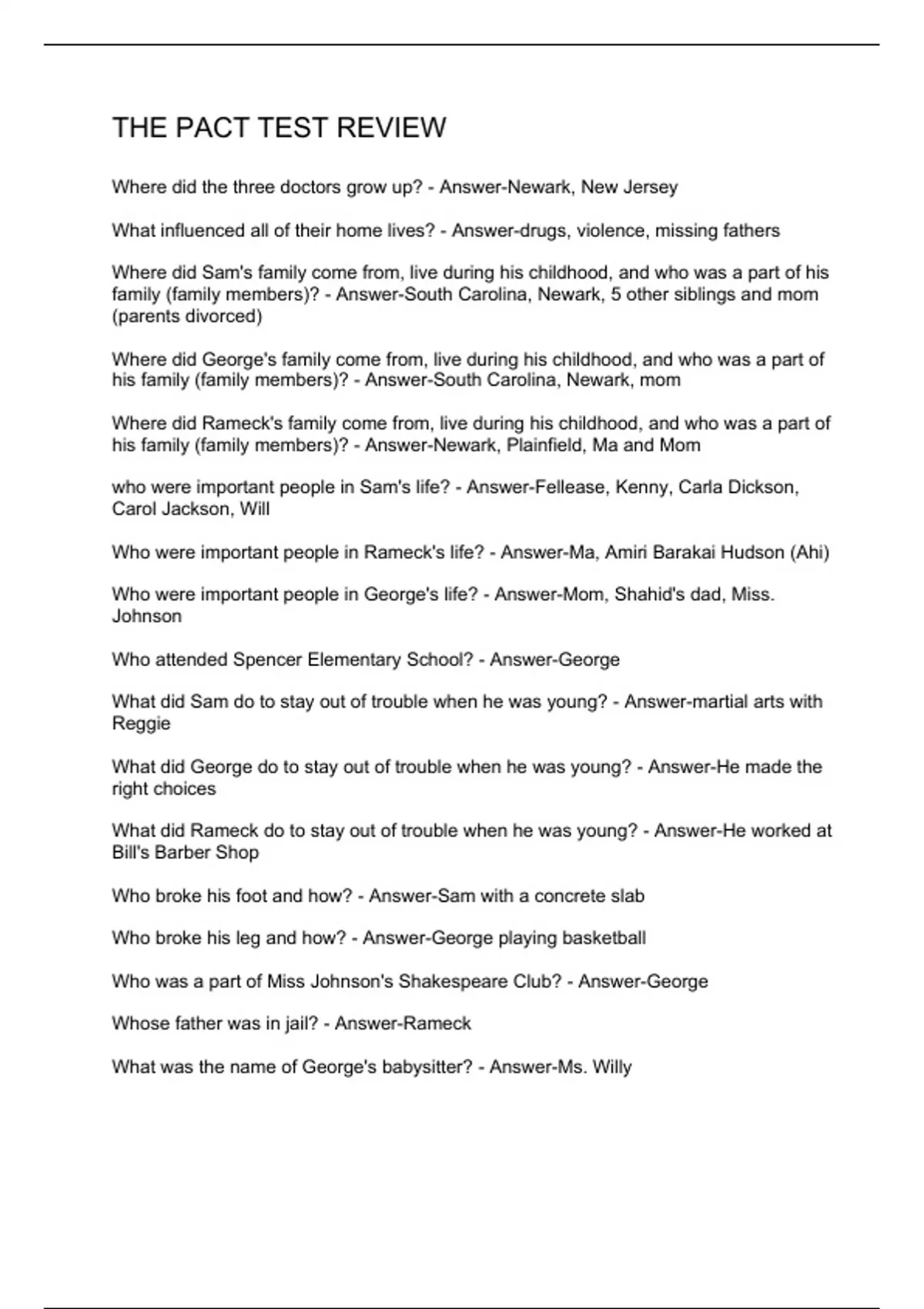 Where did the three doctors grow up? - Answer-Newark, New Jersey What influenced all of their home lives? - Answer-drugs, violence, missing fathers Where did Sam's family come from, live during his childhood, and who was a part of his family (family members)? - Answer-South Carolina, Newark, 5 other siblings and mom (parents divorced) Where did George's family come from, live during his childhood, and who was a part of his family (family members)? - Answer-South Carolina, Newark, mom Where did Rameck's family come from, live during his childhood, and who was a part of his family (family members)? - Answer-Newark, Plainfield, Ma and Mom who were important people in Sam's life? - Answer-Fellease, Kenny, Carla Dickson, Carol Jackson, Will Who were important people in Rameck's life? - Answer-Ma, Amiri Barakai Hudson (Ahi) Who were important people in George's life? - Answer-Mom, Shahid's dad, Miss. Johnson Who attended Spencer Elementary School? - Answer-George What did Sam do to stay out of trouble when he was young? - Answer-martial arts with Reggie What did George do to stay out of trouble when he was young? - Answer-He made the right choices What did Rameck do to stay out of trouble when he was young? - Answer-He worked at Bill's Barber Shop Who broke his foot and how? - Answer-Sam with a concrete slab Wh