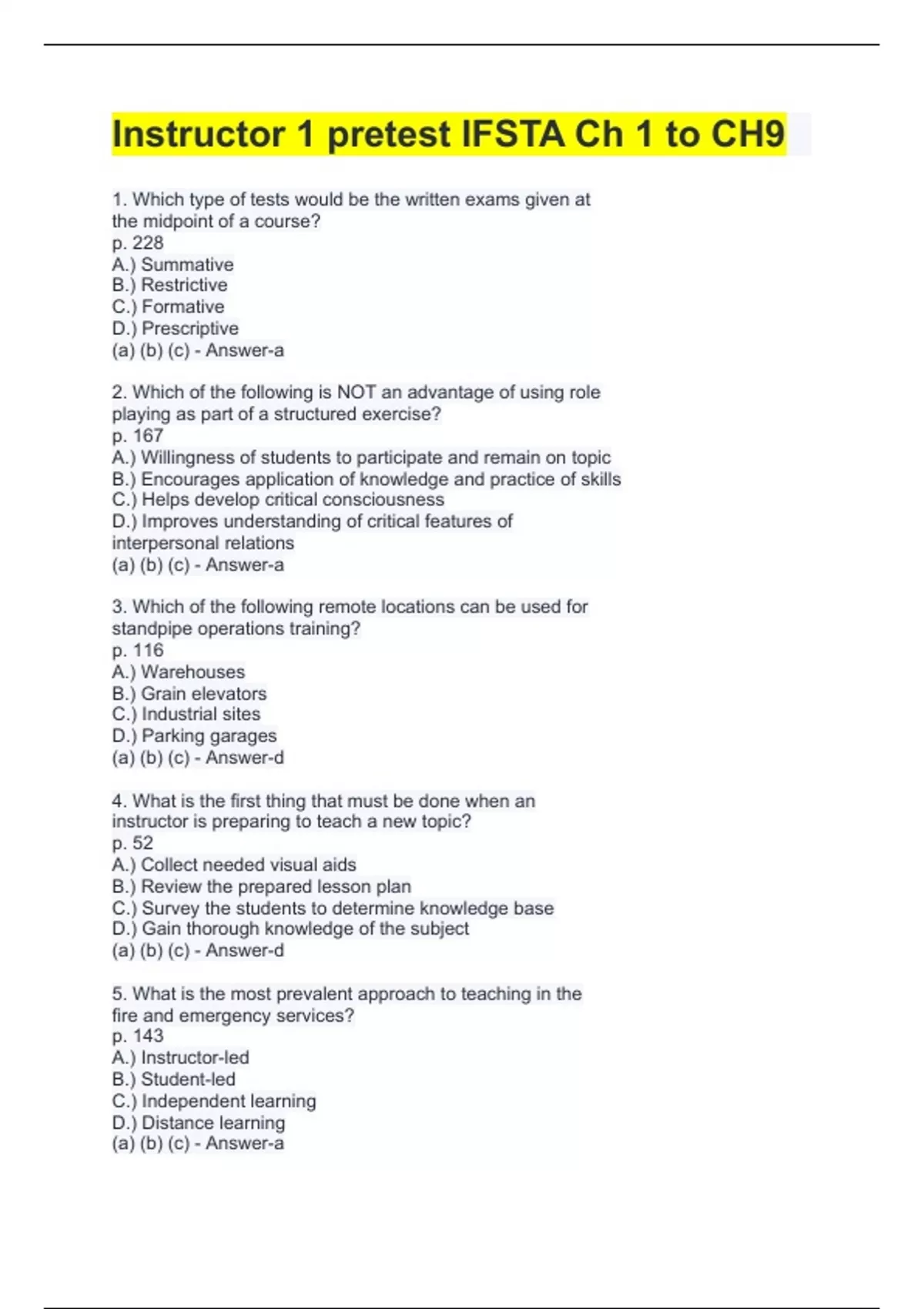 Instructor 1 pretest IFSTA Ch 1 to CH9 1. Which type of tests would be the written exams given at the midpoint of a course? p. 228 A.) Summative B.) Restrictive C.) Formative D.) Prescriptive (a) (b) (c) - Answer-a 2. Which of the following is NOT an advantage of using role playing as part of a structured exercise? p. 167 A.) Willingness of students to participate and remain on topic B.) Encourages application of knowledge and practice of skills C.) Helps develop critical consciousness D.) Improves understanding of critical features of interpersonal relations (a) (b) (c) - Answer-a 3. Which of the following remote locations can be used for standpipe operations training? p. 116 A.) Warehouses B.) Grain elevators C.) Industrial sites D.) Parking garages (a) (b) (c) - Answer-d 4. What is the first thing that must be done when an instructor is preparing to teach a new topic? p. 52 A.) Collect needed visual aids B.) Review the prepared lesson plan C.) Survey the students to determine knowledge base D.) Gain thorough knowledge of the subject (a) (b) (c) - Answer-d 5. What is the most prevalent approach to teaching in the fire and emergency services? p. 143 A.) Instructor-led B.) Student-led C.) Independent learning D.) Distance learning (a) (b) (c) - Answer-a 6. Which national organization has as its founding purpose
