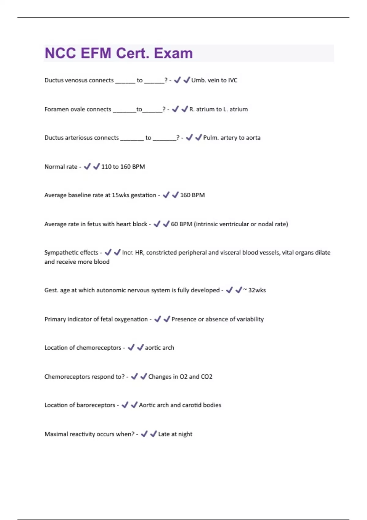 Ductus venosus connects ______ to ______? - Umb. vein to IVC Foramen ovale connects _______to______? - R. atrium to L. atrium Ductus arteriosus connects _______ to _______? - Pulm. artery to aorta Normal rate - 110 to 160 BPM Average baseline rate at 15wks gestation - 160 BPM Average rate in fetus with heart block - 60 BPM (intrinsic ventricular or nodal rate) Sympathetic effects - Incr. HR, constricted peripheral and visceral blood vessels, vital organs dilate and receive more blood Gest. age at which autonomic nervous system is fully developed - ~ 32wks Primary indicator of fetal oxygenation - Presence or absence of variability Location of chemoreceptors - aortic arch Chemoreceptors respond to? - Changes in O2 and CO2 Location of baroreceptors - Aortic arch and carotid bodies Maximal reactivity occurs when? - Late at nightMax duration of fetal nonreactivity? - 80min Sensitivity - Probablity of detecting a true positive Specificity - Probability that true negative will be detected False positive - erroneosly positive when reality is negative False negative - erroneously negative when reality is positive NST - Two 15x15 accels in 20min (up to 40min) % of false positive CSTs? - ~ 30% BPP components - 1) Fetal breathing movements 2) Gross body movements 3) Fetal tone 4) Reactive fetal heart rate 5) Qualitiative amniotic fluid volume BPP Score of 10 - Normal BPP Score of 8 - Nl infant, low risk of chronic asphyxia BPP Score of 6 - Borderline result - rpt in 24hrs BPP Score of 4 - Suspect chronic asphyxiaBPP Score of 0-2 - Strongly suspect chronic asphyxia Early manifestation of fetal acidosis? - Non-reacive NST and loss of FBM Change in FBM with maternal glucose changes? - FBM incr. with rising mGlu FBM decr. with mHYPOglycemia Maternal smoking effects FBM how? - FBM decr. with msmoking Corticosteroids effects FBM? - corticosteroids may decr. FBM Maternal PAO2 at sea level? - ~105mmHg Change in cardiac output and SVR in pre-E? - CO and SVR INCREASED in pre-E Prolonged decels occured in ___% of uterine rupture? - 71% Signif. neonatal morbidity occured when ____min or longer elapsed between onset of HFR decel and delivery. - 18min Normal arterial pH for healthy vaginal deliveries? - 7.28+/- 0.05 Normal arterial pO2 for healthy vaginal deliveries? - 18.0 +/- 6.2 Normal arterial pCO2 for healthy vaginal deliveries? - 49.2 +/- 8.4 Normal base deficit for healthy vaginal deliveries? - Less than 12pH at which acidosis - 7.2 (7.1) Tachysystole - >5 contractions in 10min Baseline (defn) - mean FHR rounded to increments of 5 BPM during a 10min perioud excl. periodic or episodic changes, contractions, periods of marked variability, and segments of baseline that differ by >25 BPM Sinusoidal pattern? - Fetal anemia As many as ___% of infants with complete heart block have assoc. congenital cardiac malformations. - 50% Mortality rate for newborns with complete heart block - 25% Newborn with complete heart block in absence of congen. heart disease frequently has neonatal ___________. - Lupus erthematosus