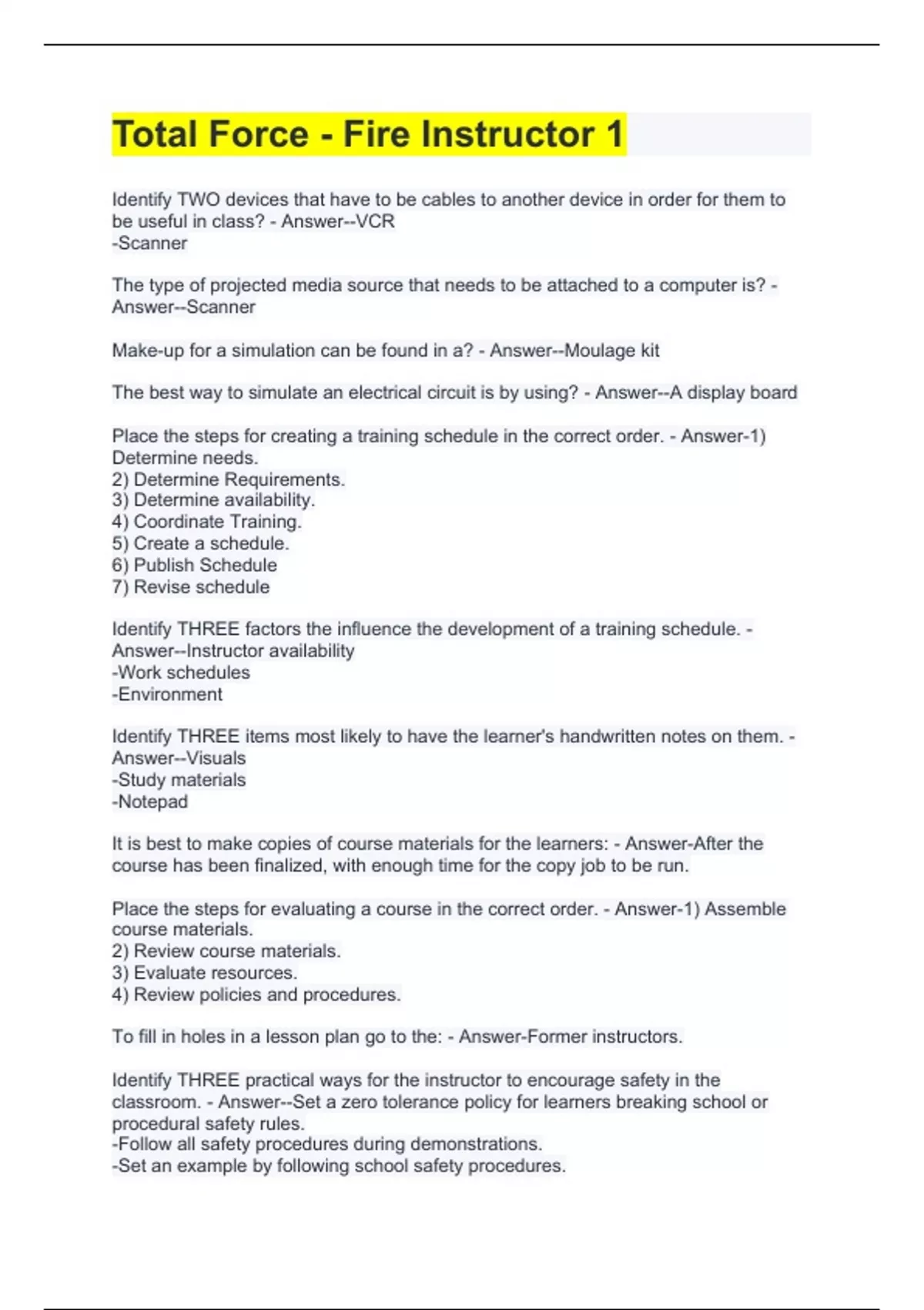 Total Force - Fire Instructor 1 Identify TWO devices that have to be cables to another device in order for them to be useful in class? - Answer--VCR -Scanner The type of projected media source that needs to be attached to a computer is? - Answer--Scanner Make-up for a simulation can be found in a? - Answer--Moulage kit The best way to simulate an electrical circuit is by using? - Answer--A display board Place the steps for creating a training schedule in the correct order. - Answer-1) Determine needs. 2) Determine Requirements. 3) Determine availability. 4) Coordinate Training. 5) Create a schedule. 6) Publish Schedule 7) Revise schedule Identify THREE factors the influence the development of a training schedule. - Answer--Instructor availability -Work schedules -Environment Identify THREE items most likely to have the learner's handwritten notes on them. - Answer--Visuals -Study materials -Notepad It is best to make copies of course materials for the learners: - Answer-After the course has been finalized, with enough time for the copy job to be run. Place the steps for evaluating a course in the correct order. - Answer-1) Assemble course materials. 2) Review course materials. 3) Evaluate resources. 4) Review policies and procedures. To fill in holes in a lesson plan go to the: - Answer-Former instructors. Identify THREE practical ways for the instructor to encourage safety in the classroom. - Answer--Set a zero tolerance policy for learners breaking school or procedural safety rules. -Follow all safety procedures during demonstrations. -Set an example by following school safety procedures.