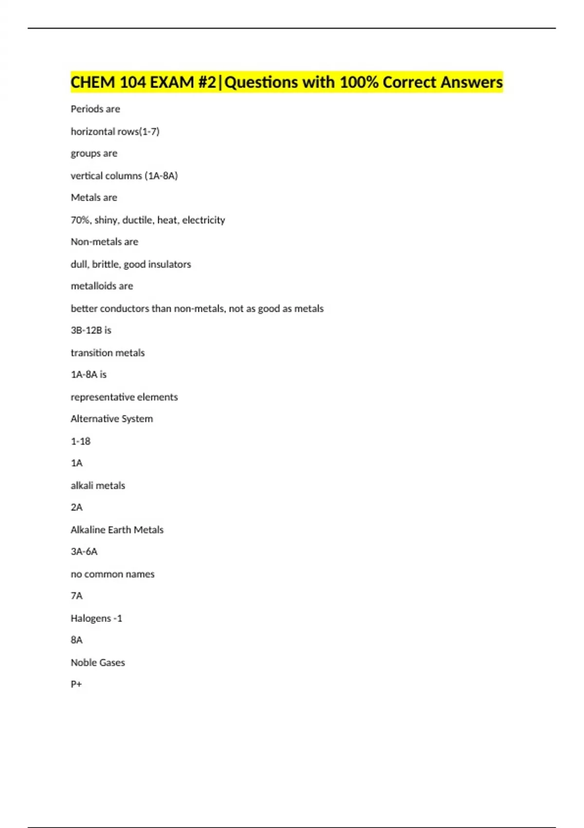 CHEM 104 EXAM #2|Questions with 100% Correct Answers Periods are horizontal rows(1-7) groups are vertical columns (1A-8A) Metals are 70%, shiny, ductile, heat, electricity Non-metals are dull, brittle, good insulators metalloids are better conductors than non-metals, not as good as metals 3B-12B is transition metals 1A-8A is representative elements Alternative System 1-18 1A alkali metals 2A Alkaline Earth Metals 3A-6A no common names 7A Halogens -1 8A Noble Gases P+ proton: positively charged +1 n neutron, charge is 0 e- electron, An atom consist of a nucleus that contains protons and neutrons -electrons in a large empty space between nucleus Atomic # is also Protons and Electrons isotopes atoms of the same element, but have different atomic mass nucleus that is radioactive radiation Atom smallest particle of an element that retains characteristics of that element representative elements 1A-8A Valence Electrons # of electrons in the outermost energy level Group # gives the # of valence electrons for the representative elements Atomic size increases going down a group atomic size decreases going up from left to right across a period metallic characters the ability to lose electrons -more prevalent in metals -less for nonmetals on the right side of the periodic table, which doesn't lose electrons easily Ionic -forms because of transfer of electrons -solid @ room temp -high melting points -salts, metals, non metals Covalent -forms from sharing electrons -soft and flexible -low melting points -Metalloid and non metals atoms form positively charged ions(cations) when lose electrons atoms form negatively charged ions(anions) when they gain electrons Ionic charges from group # determine charges for ions of elements charge for 1A +1 (except hydrogen) charge for 2A +2 (except Be) charge for 3A +3 charge for 5A -3 charge for 6A -2 charge for 7A -1 3A through 6A Anions, you put "ide" @ end for non metals Elements with variable charges Transition Metals (group B) and Polyatomic Ions Transition metals (group B) form -two or more cations -Zn,Cd, Ag form one cation Sn, Sb, Pb, Bi have variable charges for their cations Polyatomic Ions group of atoms with/ an overall charge consisting of a non-metal such as phosphorus, sulfur, carbon, nitrogen, oxygen, Groups 1A, 2A, 3A are _____ Metals cation Groups 5A, 6A, 7A, are ________ non metals anion Metals that form more than one positive Ion Bismuth, chromium, cobalt, copper, gold, iron Multiple charges for Bismuth Bismuth (III) & (V) Multiple charges for chrominum chromium (II) (III) Multiple charges for cobalt cobalt (II) (III) Multiple charges for copper copper (I) (II) Multiple charges for gold gold (I) (III) Multiple charges for Iron Iron (II) (III) formula for ionic compound 1. write symbol for the metal cation 2. symbol for non metal anion and charge