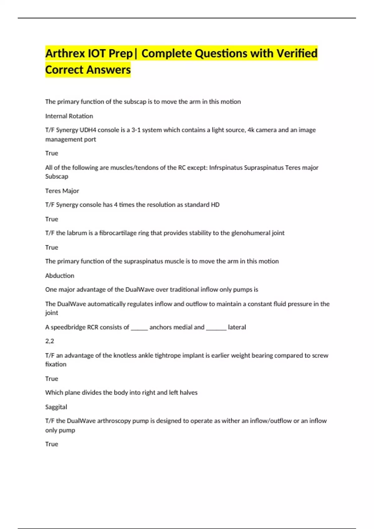 Arthrex IOT Prep| Complete Questions with Verified Correct Answers The primary function of the subscap is to move the arm in this motion Internal Rotation T/F Synergy UDH4 console is a 3-1 system which contains a light source, 4k camera and an image management port True All of the following are muscles/tendons of the RC except: Infrspinatus Supraspinatus Teres major Subscap Teres Major T/F Synergy console has 4 times the resolution as standard HD True T/F the labrum is a fibrocartilage ring that provides stability to the glenohumeral joint True The primary function of the supraspinatus muscle is to move the arm in this motion Abduction One major advantage of the DualWave over traditional inflow only pumps is The DualWave automatically regulates inflow and outflow to maintain a constant fluid pressure in the joint A speedbridge RCR consists of _____ anchors medial and ______ lateral 2,2 T/F an advantage of the knotless ankle tightrope implant is earlier weight bearing compared to screw fixation True Which plane divides the body into right and left halves Saggital T/F the DualWave arthroscopy pump is designed to operate as wither an inflow/outflow or an inflow only pump True T/F Proximal refers to being closer to the main mass of the body True What is the most common ligament disruption involved in lateral ankle sprains True Which word describes red blood cells erythrocytes Of the major knee ligaments which is not intra articular? ACL PCL LCL LCL Which of the following is not one of the three ligaments that supports the ankle syndesmosis joint? ATFL PiTFL AiTFL Tibiofubular interosseous ligament ATFL Which of the following are common causes of ACL injuries? Changing direction rapidly Stopping suddenly Landing from a jump All All What is the strongest ligament in the ankle syndesmotic ligament complex PiTFL T/F Females are 4-5 times more pros to ACL injury True What two nerves are most at risk when surgeons perform a lateral ankle ligament operation Sural nerve and superficial peroneal nerve T/F plasma makes up 55% of whole blood True What is the most common motion responsible for lateral ankle sprains Inversion, plantar flexion T/F In the ACL deficient knee, the tibia can abnormally translate anteriorly True What three bones make up the ankle joint Tibia, fibula, talus The distal bicep has what type of attachment to which corresponding forearm bone Ribbon-like, radial tuberosity the intertubercular groove contains which head of the biceps Long Head T/F the biceps is the major flexor of the elbow* False (Brachialis) What condyle of the knee is a 4 times greater risk to have an osteochondral defect Medial Using the outer bridge classification, advanced bone-on-bone arthritis would be classified as Grade 4 When using the offset guide for AC internal brace technique by Dr. Mackay, what is the distance built into the guide to ensure proper bone socket placement in the acromion 5 mm T/F the coracoclavicular ligaments are composed of the conoid and the trapezoid True The best choice of construct for a chronic AC joint reconstruction would be Dog Bone with Graft Recon The metal detection feature on the synergyRF system performs what function Suspends power to probe when the tip is in close proximity of scope or metal instruments the bipolar ablation breaks down tissue by the following process Chemical reaction- gently breaks down tissue at the molecular level In standard osculation mode, how often will the handpeice change direction at an RPM of 1,000 or more Every .3 seconds T/F the jumpstart bandage generates electricity to kill pathogens including many drug- resistant bacteria True T/F Biocartilage allograft contains living chondrocytes False What type of carrier is within allosync DBM, putty, gel, and paste which allows it to become more miscues and harden, at body temperature Reverse Phase Medium A patient experiencing pain with shoe wear and swelling for several months located at the posterior aspect of their heel is more likely to have what type of achelliez tendon disorder Insertional achellies tendonitis What two muscles make up your calf muscles and come together to form the Achilles tendon Gastrocnemius and soleus When performing the chili's mid substance speed bridge, how many times should the passing needles be passed through the pars jig 5 In identifying tears causing instability of the glenohuemeral joint, ALPSA stands for Anterior labrum periosteal sleeve avulsion The treatment for an engaging hillsachs lesion is known as Replissage This type of shoulder dislocation is the most common, occurring 95% of the time Anterior Which of the following is a goal of meniscal resection? Remove degenerative tissue Spare as much meniscus as possible Reproduce meniscal contour All of Above All This is the more c shaped meniscus that has connections with the ACL and capsule/MCL Medial The zones of the meniscus are determined by Blood Supply A simple stitch for shoulder instability repair is also referred to as a Cerclage Stitch In identifying a labral tear of the shoulder, SLAp Stands for Superior Labrum Anterior to Posterior T/F Platelets (thrombocytes) are a component of whole blood that do not contain a nucleus. Therefore, platelets are not truly cells True The Quadriceps femoris refers to which? Rectus Remoris Vastus Lateralis Vastus Medialis Vastus Intermedius All of the Above (T/F) Synergy UHD4 4K Imaging console has 4 times the resolution as standard HD True Major Advantage of DualWave Pump: DualWave Pumps automatically regulate inflow and outflow to maintain a constant fluid pressure in the joint Complications of screw fixation for syndesmosis injury Loosening, Breaking, need of second operation The Supraspinatus tendon attaches to which structure? Greater Tuberosity of the humerus Which of the following is NOT one of the traditional options for irreparable cuff tears Primary TSA T/F: The superior capsule of the shoulder is a distinct structure from the rotator cuff True T/F: During the te