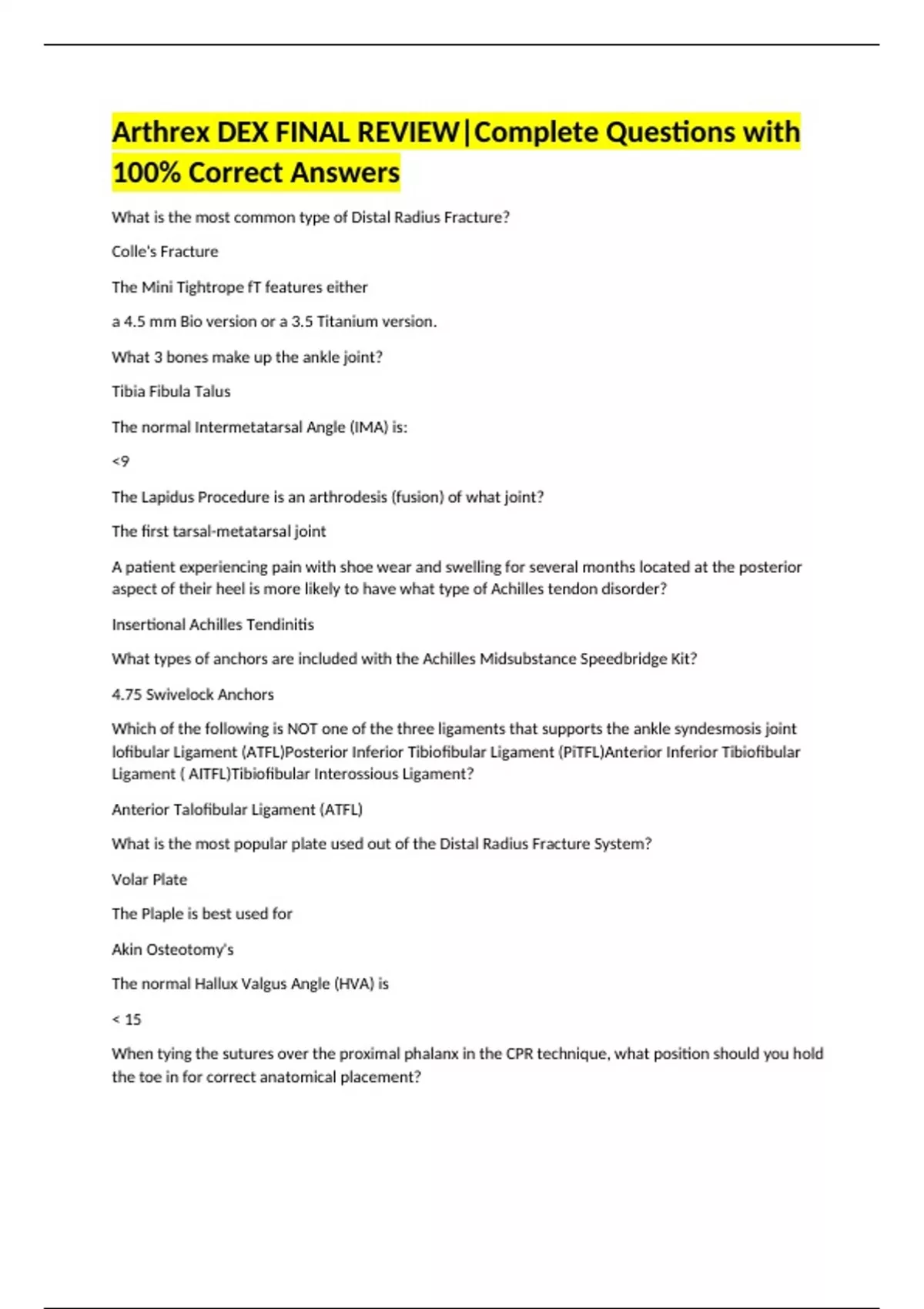 Arthrex DEX FINAL REVIEW|Complete Questions with 100% Correct Answers What is the most common type of Distal Radius Fracture? Colle's Fracture The Mini Tightrope fT features either a 4.5 mm Bio version or a 3.5 Titanium version. What 3 bones make up the ankle joint? Tibia Fibula Talus The normal Intermetatarsal Angle (IMA) is: <9 The Lapidus Procedure is an arthrodesis (fusion) of what joint? The first tarsal-metatarsal joint A patient experiencing pain with shoe wear and swelling for several months located at the posterior aspect of their heel is more likely to have what type of Achilles tendon disorder? Insertional Achilles Tendinitis What types of anchors are included with the Achilles Midsubstance Speedbridge Kit? 4.75 Swivelock Anchors Which of the following is NOT one of the three ligaments that supports the ankle syndesmosis joint lofibular Ligament (ATFL)Posterior Inferior Tibiofibular Ligament (PiTFL)Anterior Inferior Tibiofibular Ligament ( AITFL)Tibiofibular Interossious Ligament? Anterior Talofibular Ligament (ATFL) What is the most popular plate used out of the Distal Radius Fracture System? Volar Plate The Plaple is best used for Akin Osteotomy's The normal Hallux Valgus Angle (HVA) is < 15 When tying the sutures over the proximal phalanx in the CPR technique, what position should you hold the toe in for correct anatomical placement? 20-30 degrees plantarflexion A Brostrum repair augmented with and InternalBrace is stronger than the native ATFL ligament When using the Retro Fusion screw for PIP joint arthrodesis, final compression of the joint is accomplished by turning the screwdriver clockwise. How many ligaments does the thumb CMC joint have? 6 What size tenodesis screw is included in the LRTI kit for thumb CMC arthritis? 4 x 10 mm Which of the following can cause a lesser toe deformity: Long toes Inappropriate shoe wear Repeated hyperextension of the MTP joint ALL OF THE ABOVE ALL OF tHE ABOVE What structures in the hand make up the Anatomic Snuff Box? Extensor pollicis longus and abductor pollicis longus When doing the Blind-Tunnel tenodesis technique, when should the surgeon measure the tendon? After the tendon has been whipstitched Which of the following toe deformities includes hyperextension of the MTP joint, flexion of the PIP joint, and flexion of the DIP joint? Claw Toe True or False: The internal brace is an artificial ligament that does not replace the need to repair the ATFL True Plasma makes up ____% of whole blood 55% CMC joint allows movement of the thumb in how many planes? 2 From anterior to posterior, the order of the anatomical structures behind the medial malleolus is: Posterior tibialis tendon, flexor digitorum longus tendon, neurovascular bundle, flexor hallucis longs tendon How many bands make up the deep layer of the Deltoid ligament? 2 When using a 5.5x15mm screw for the Blind-Tunnel tenodesis technique, what length should the tunnel be drilled? 17 mm Which word describes red blood cells? Erythrocytes What is the most common ligament disruption involved in lateral Ankle sprains? ATFL Which products can be used for passing suture through the plantar plate in the CPR technique? Mini Scorpion DX Arthrex Viper Pigtail Lasso True or False: Valgus tilt of the calcaneous is NOT a component of flatfoot deformity True *What is the biggest risk factor to develop plantar fasciitis? Obesity What pathological condition can mimic the symptoms of plantar fasciitis? Baxter's Neuropathy Tarsal Tunnel Syndrome Heel Fat Pad Degeneration What size cannula is used with the EndoBlade EPFR System? 8 What portion of the plantar fascia is NOT released when performing an EPFR? Lateral True or False: A specifically designed 4 MM arthroscope is NOT required to perform the end-blade EPFR True A healthy plantar fascia should be no more than _____ mm thick 4 The Ankle Fusion Plates are anatomically designed for all surgical approaches except MEDIAL Double Compression Plates are available in: 20 mm, 25 mm, 30 mm