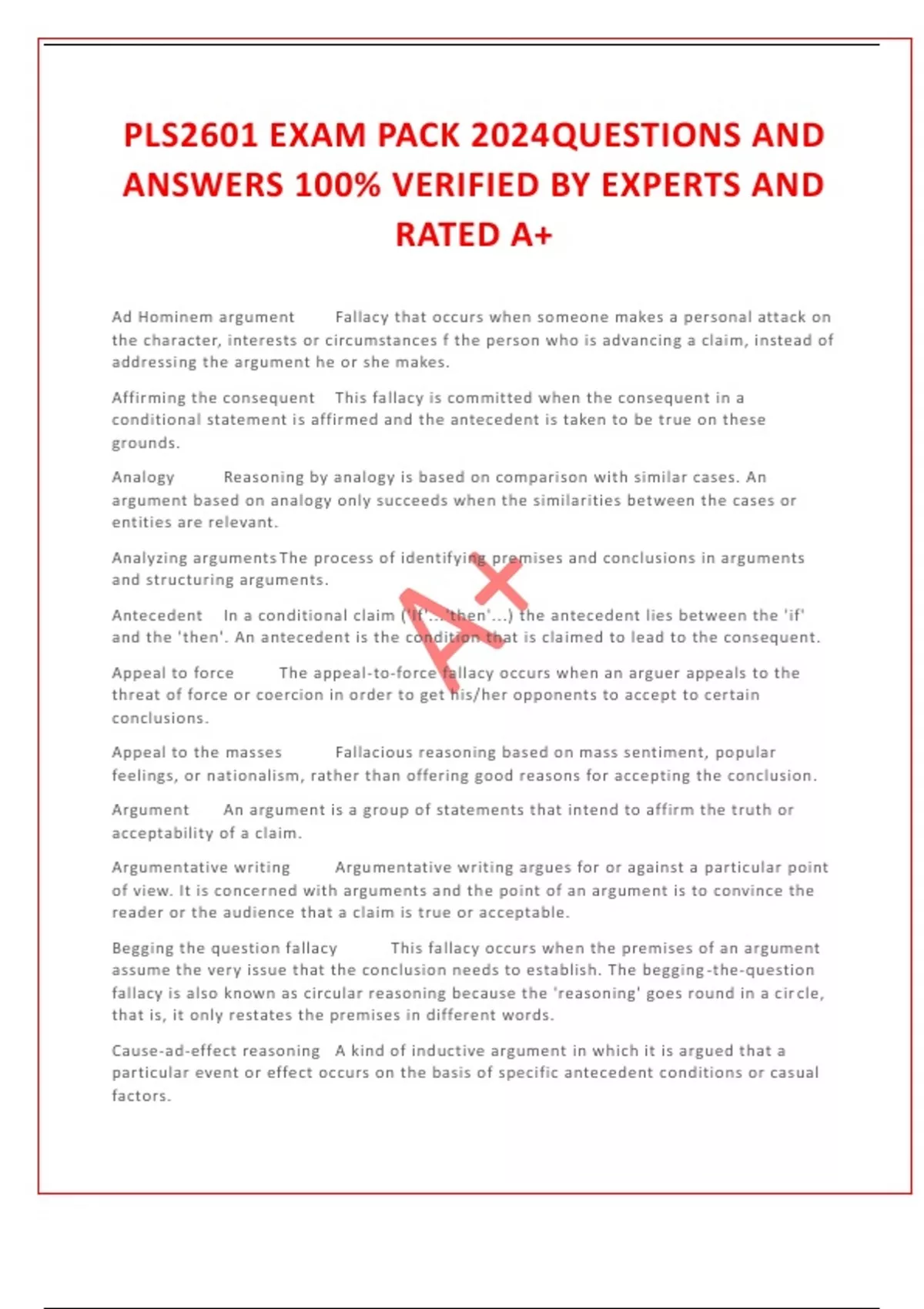 PLS2601 EXAM PACK 2024QUESTIONS AND ANSWERS 100% VERIFIED BY EXPERTS AND RATED A+ Ad Hominem argument Fallacy that occurs when someone makes a personal attack on the character, interests or circumstances f the person who is advancing a claim, instead of addressing the argument he or she makes. Affirming the consequent This fallacy is committed when the consequent in a conditional statement is affirmed and the antecedent is taken to be true on these grounds. Analogy Reasoning by analogy is based on comparison with similar cases. An argument based on analogy only succeeds when the similarities between the cases or entities are relevant. Analyzing arguments The process of identifying premises and conclusions in arguments and structuring arguments. Antecedent In a conditional claim ('If'...'then'...) the antecedent lies between the 'if' and the 'then'. An antecedent is the condition that is claimed to lead to the consequent. Appeal to force The appeal-to-force fallacy occurs when an arguer appeals to the threat of force or coercion in order to get his/her opponents to accept to certain conclusions. Appeal to the masses Fallacious reasoning based on mass sentiment, popular feelings, or nationalism, rather than offering good reasons for accepting the conclusion. Argument An argument is a group of statements that intend to affirm the truth or acceptability of a claim. Argumentative writing Argumentative writing argues
