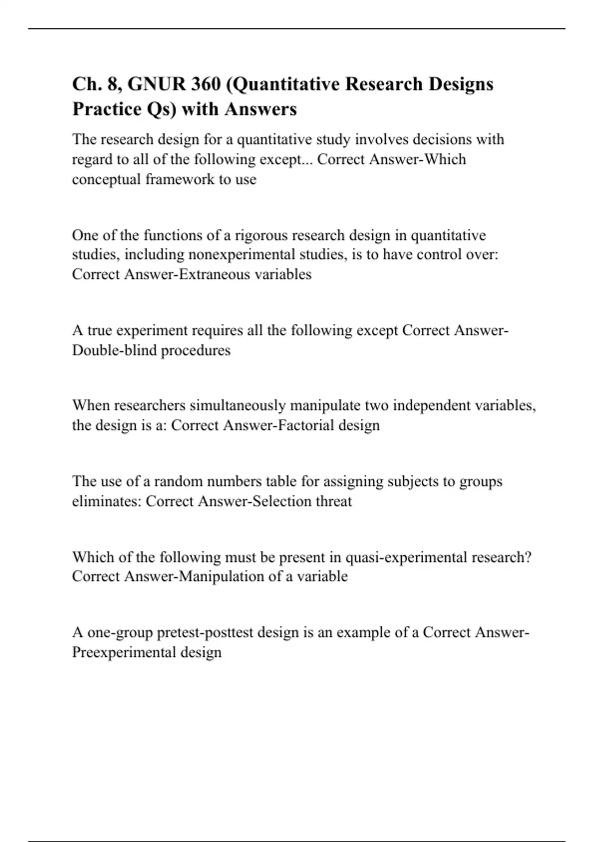 Ch. 8, GNUR 360 (Quantitative Research Designs Practice Qs) with Answers