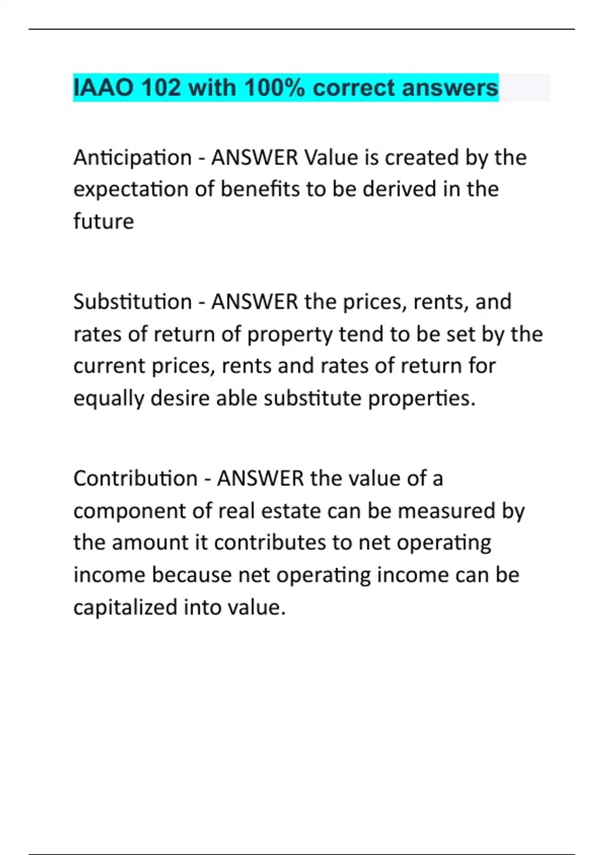 Anticipation Value is created by the expectation of benefits to be derived in the future Substitution the prices, rents, and rates of return of property tend to be set by the current prices, rents and rates of return for equally desire able substitute properties. Contribution the value of a component of real estate can be measured by the amount it contributes to net operating income because net operating income can be capitalized into value. Market Value means the most probable price which a property should bring in a competitive and open market under all conditions. 5 Analysis Questions for Investors - 1. How much it cost? 2. How much will I get back? 3. When will I get it back? 4. What are the risk? 5. What are some comps ROI compared to my interested property? Leverage borrowing of funds in hopes of earning a greater return than the cost of the borrowed funds. This amount can be be negative, positive, or neutral. Mortgage most common type of financing for real estate. Junior Mortgage typical a second mortgage Chattel Mortgage a mortgage only on personal property. Amortized Mortgage Fixed rate mortgage permanent loan in which the sum of the principal and interest payments remains fixed throughout the term of the loan. Four factors to capture overall yield rate (Yô) - 1. Safe rate 2. Risk Rate 3. Rate for non-liquidity 4. Rate for Management Recapture Rate Provides for the return of the investment in the wasting portion of the assets. Effective Tax Rate (ETR) Reflect the relationship between the real estate taxes and the value of the property. Income Approach One of the three approaches to value in which the appraiser derives a value indication by converting anticipated benefits through ownership of income -producing property is the ______________ What's a lease? Considered both a contract and conveyance Month to Month Lease short term lease that May or may not me in written form. This type of lease provides no security for the tenant or landlord. Percentage Lease a contract which calls for a fixed minimum base rent and a variable rent. Gross Lease the landlord is required to pay all operating expenses associated with the real estate. Net Lease the tenant is required to pay all or part of the operating expenses associated with the real estate. Tenant improvements Terms of lease where it explains the extent of the work that the landlord is willing to do in the form of a building or improvement allowance. Types of Rents - 1. Market Rent 2. Contract Rent 3. Excess Rent 4. Percentage Rent 5. Deficit Rent 6. Effective Rent Gross Leasable Area (GLA) includes the entire area of the building Net Leasable Area (NLA) includes only the floor area occupied by the tenant. Gross Income Multiplier relationship between Effective gross income (EGI) and the sales prices or property value Misc. Income some misc income could be parking fees, vending machines, coin operated laundries, etc Effective Gross Income (EGI) obtained after determining the potential income for the property What kind of expenses are capital improvements? Improper Expenses. Percentage Lease a contract that requires a fixed minimum base event based on volume of business, sales, productivity, or use of the property by the tenant is called ___________ Five Methods of Developing an overall capitalization rate - 1. Derivation from comparable **** This is the one on the test 2. Band of Investment Technique (Mortgage & Equity Components) 3. Net Income Ratio 4. Debt coverage ratio 5. Band of Investment Technique (LAND AND IMPROVEMENT COMPONENTS) Mortgage Capitalization Rate is the ratio of the annual principal and interest payments to the amount borrowed.